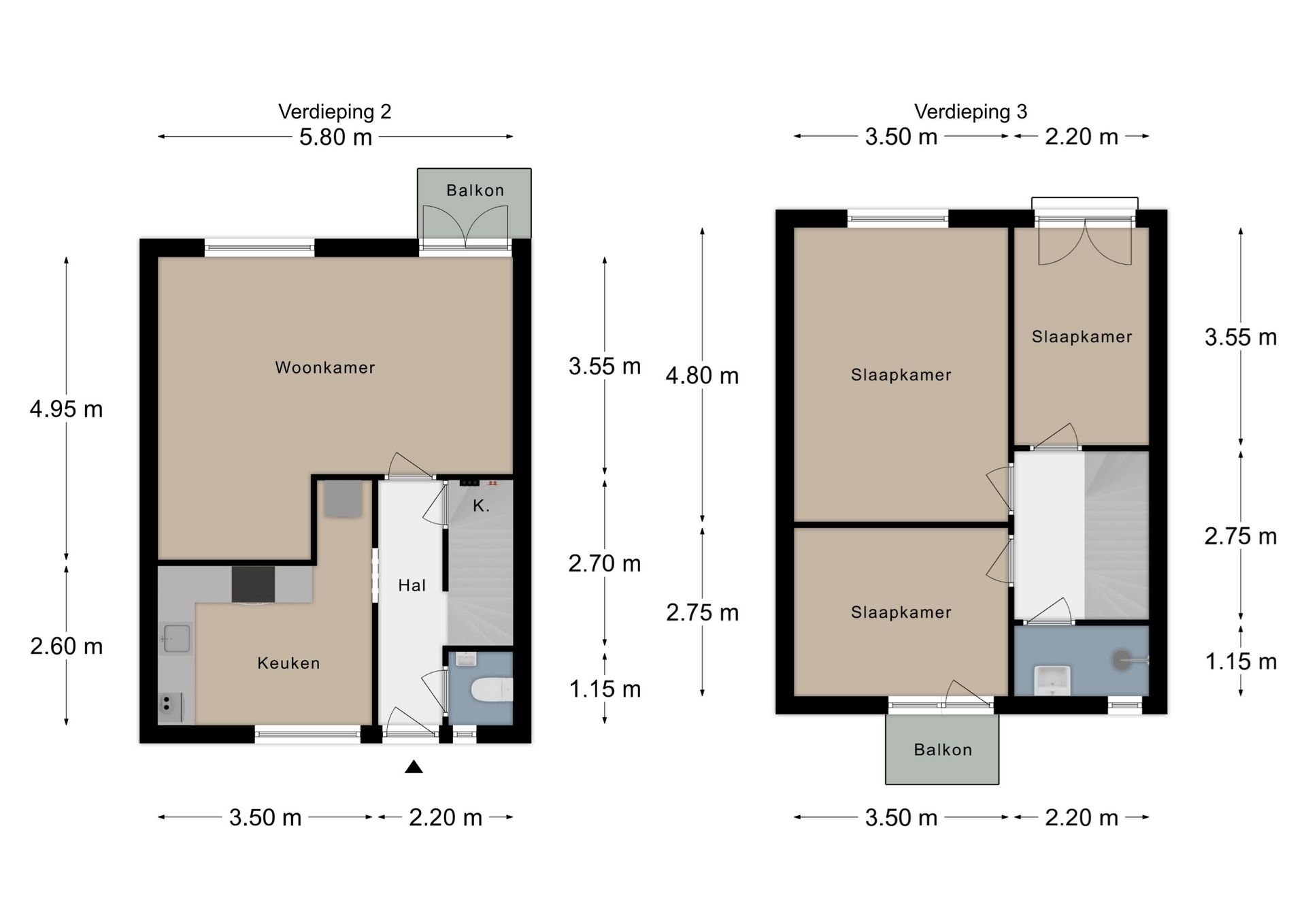 L-shaped living room (5.8 x 4.95/3.55 m) with laminate flooring and access to the rear balcony (1.95 x 1.2 m).