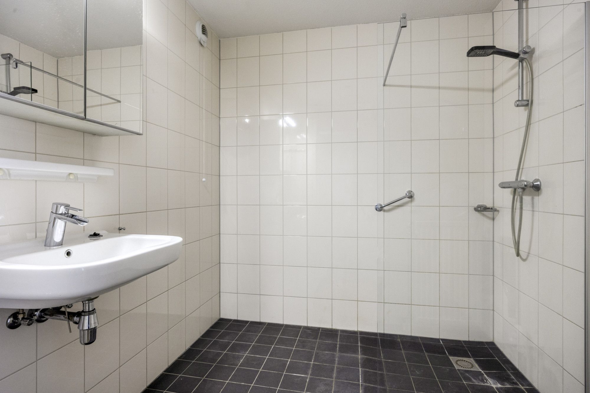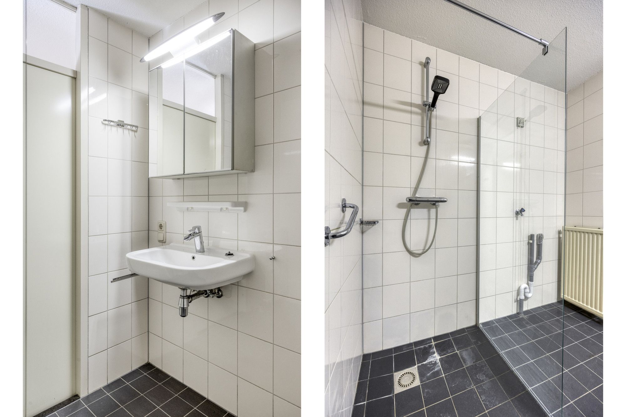 Op de gang bevindt zich de meterkast. Ontvangsthal met moderne toiletruimte voorzien van zwevend toilet en fonteintje. Gerenoveerde, geheel betegelde badkamer met inloopdouche en wastafel. Ook aansluitingen voor wasmachine en droger zijn hier aanwezig.