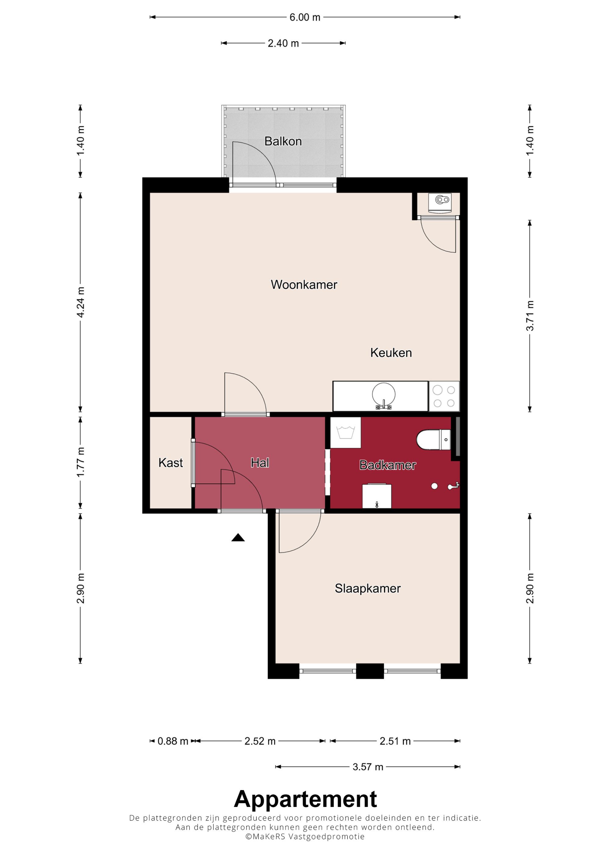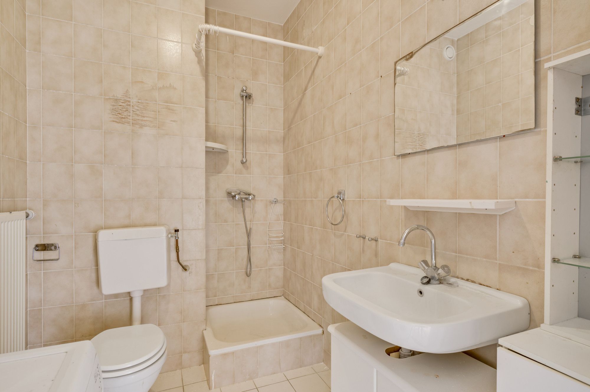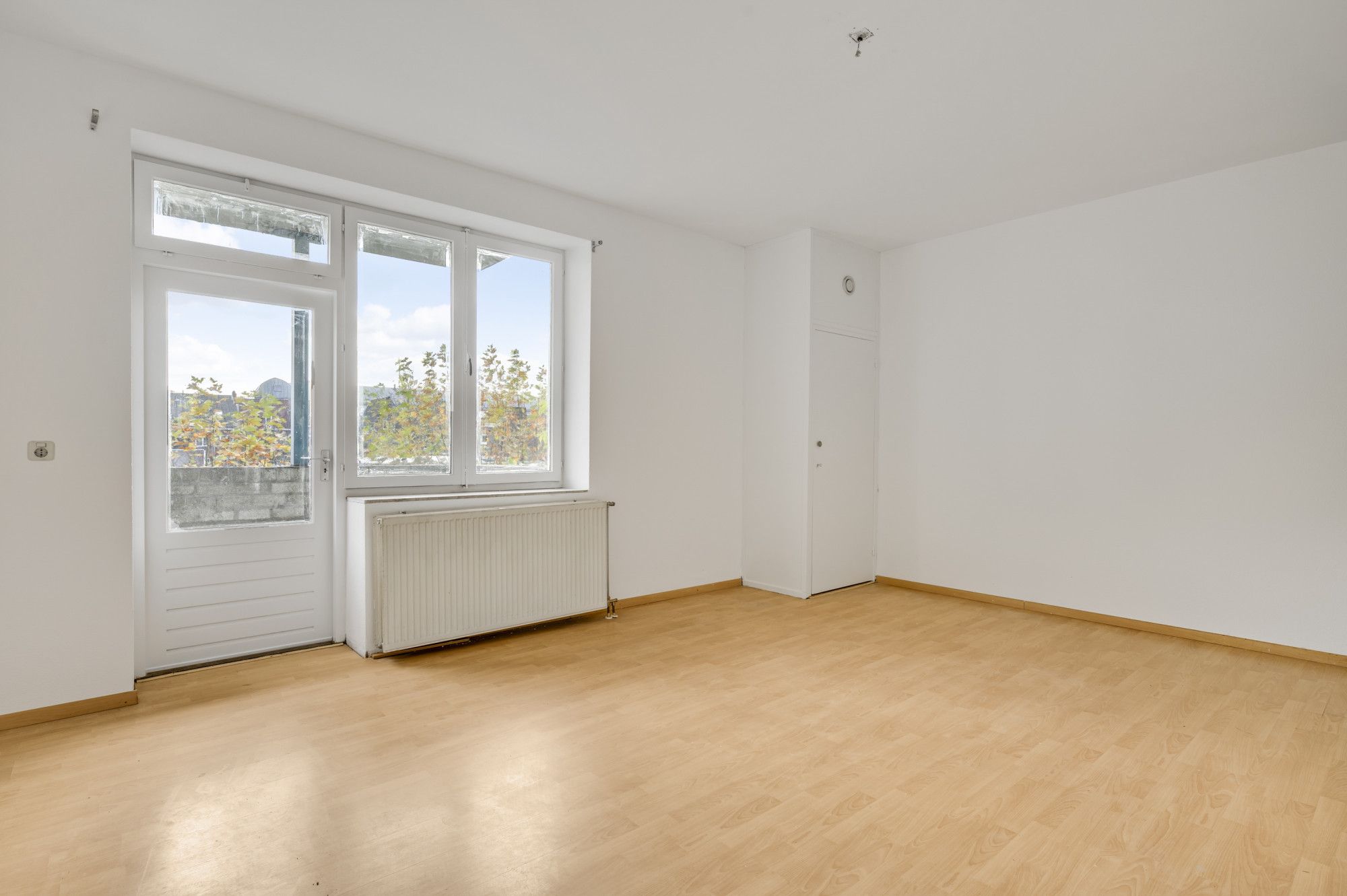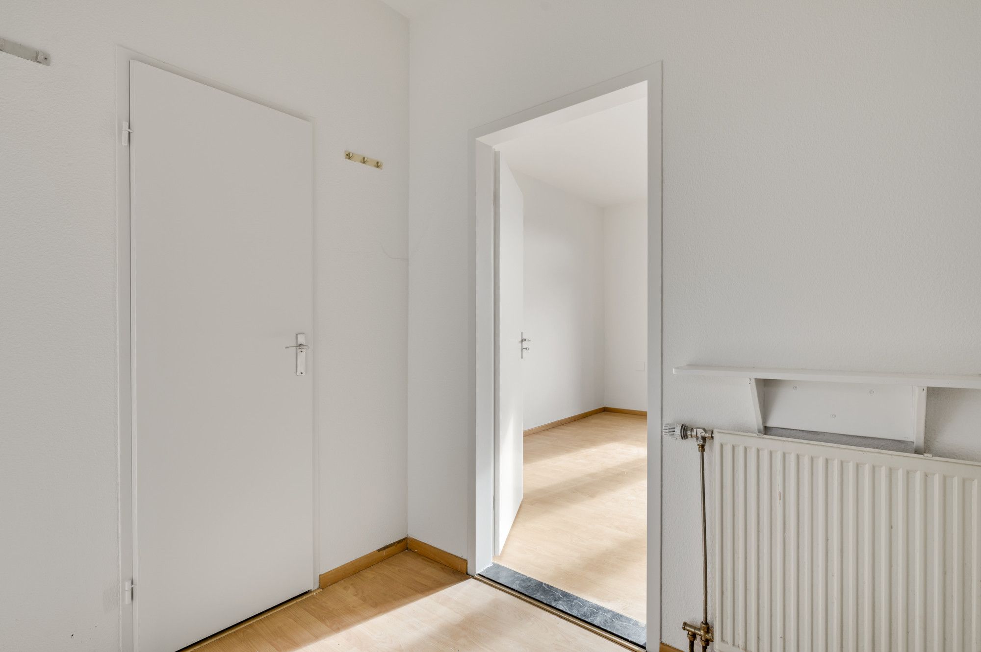 De overloop biedt toegang tot de eigen voordeur. Vanuit de ontvangsthal zijn de kamers en een praktische inpandige berging bereikbaar. Aan de rustige achterzijde bevindt zich de lichte woonkamer met open keuken, waar het balkon direct een prettige buitenruimte toevoegt. De keuken is eenvoudig en netjes uitgevoerd en biedt mogelijkheden om deze naar eigen smaak te moderniseren. In een aparte kast staat de cv-ketel (Nefit Proline HRC, eigendom, ca. 2022) keurig weggewerkt. De badkamer is betegeld en ingericht met een douche, toilet, wastafelmeubel en de aansluiting voor het witgoed. Via de ontvangsthal is tevens de riante slaapkamer toegankelijk. Deze fijne slaapkamer beschikt over veel lichtinval. Het appartement is grotendeels voorzien van een nette laminaatvloer.