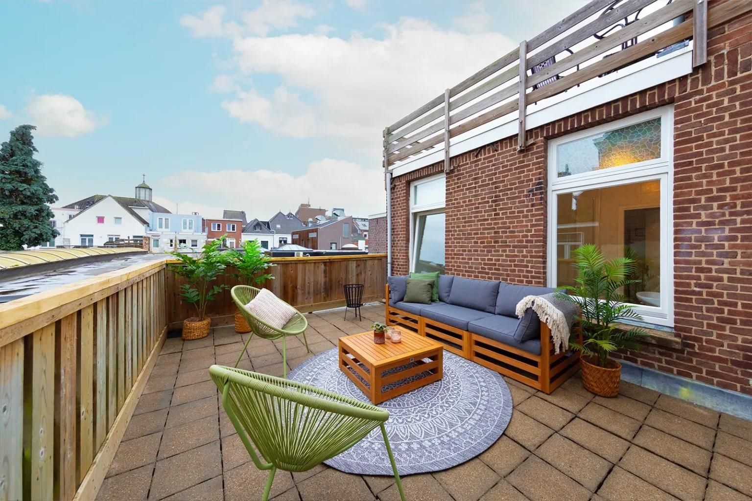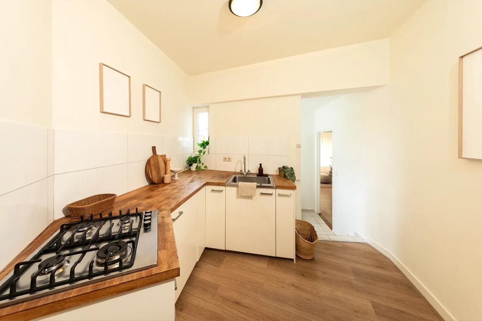 Via een trapopgang krijg je toegang tot het appartement op de eerste verdieping.