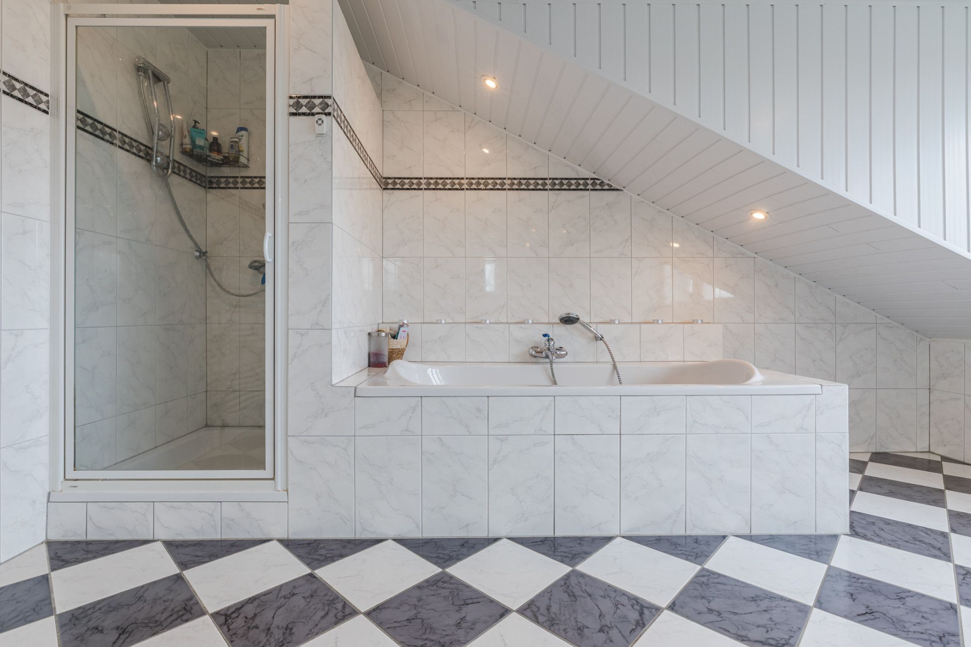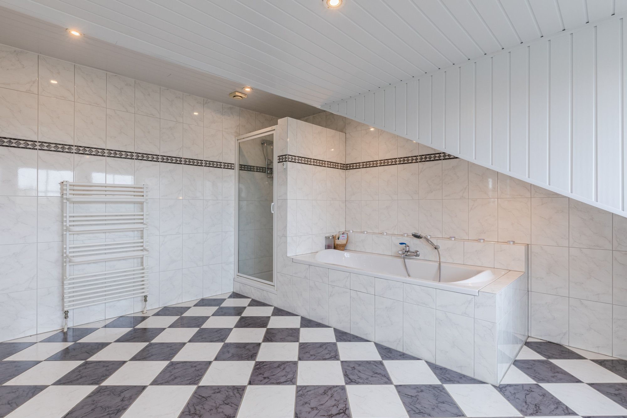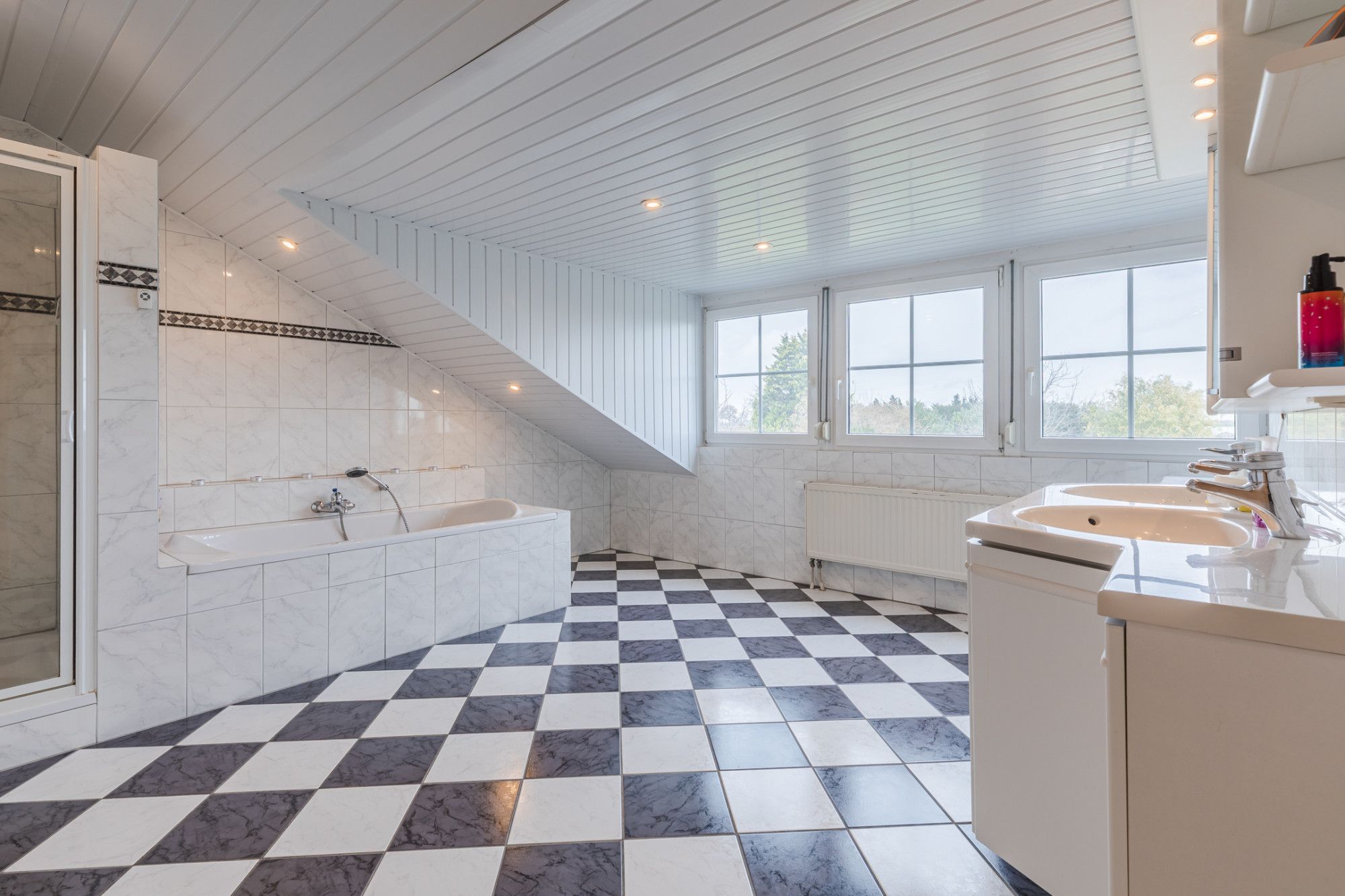Großes Badezimmer mit Fliesenboden, Badewanne, Dusche und Doppelwaschtisch