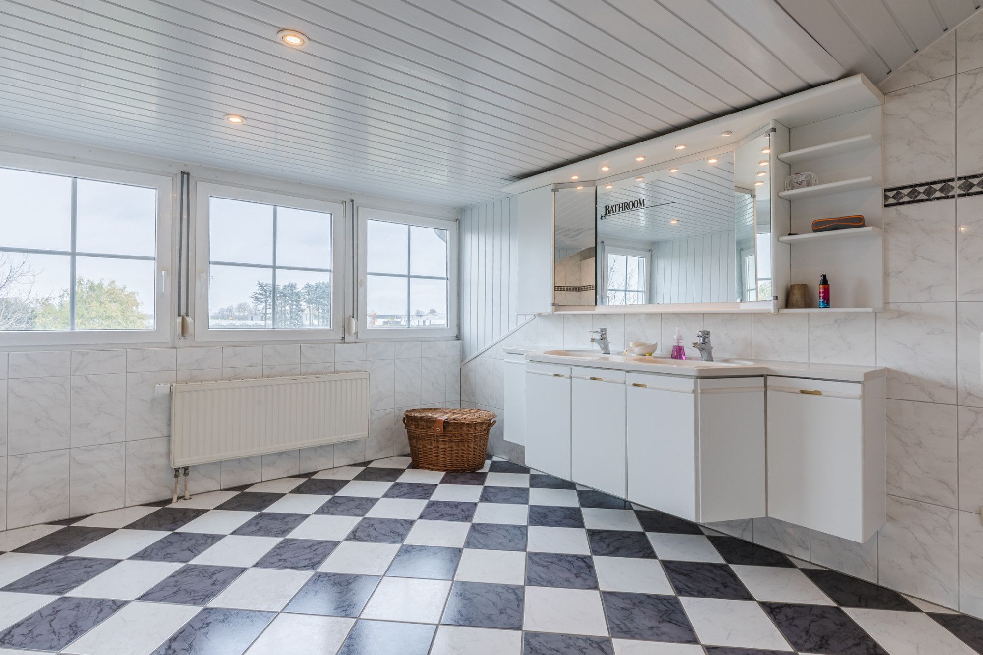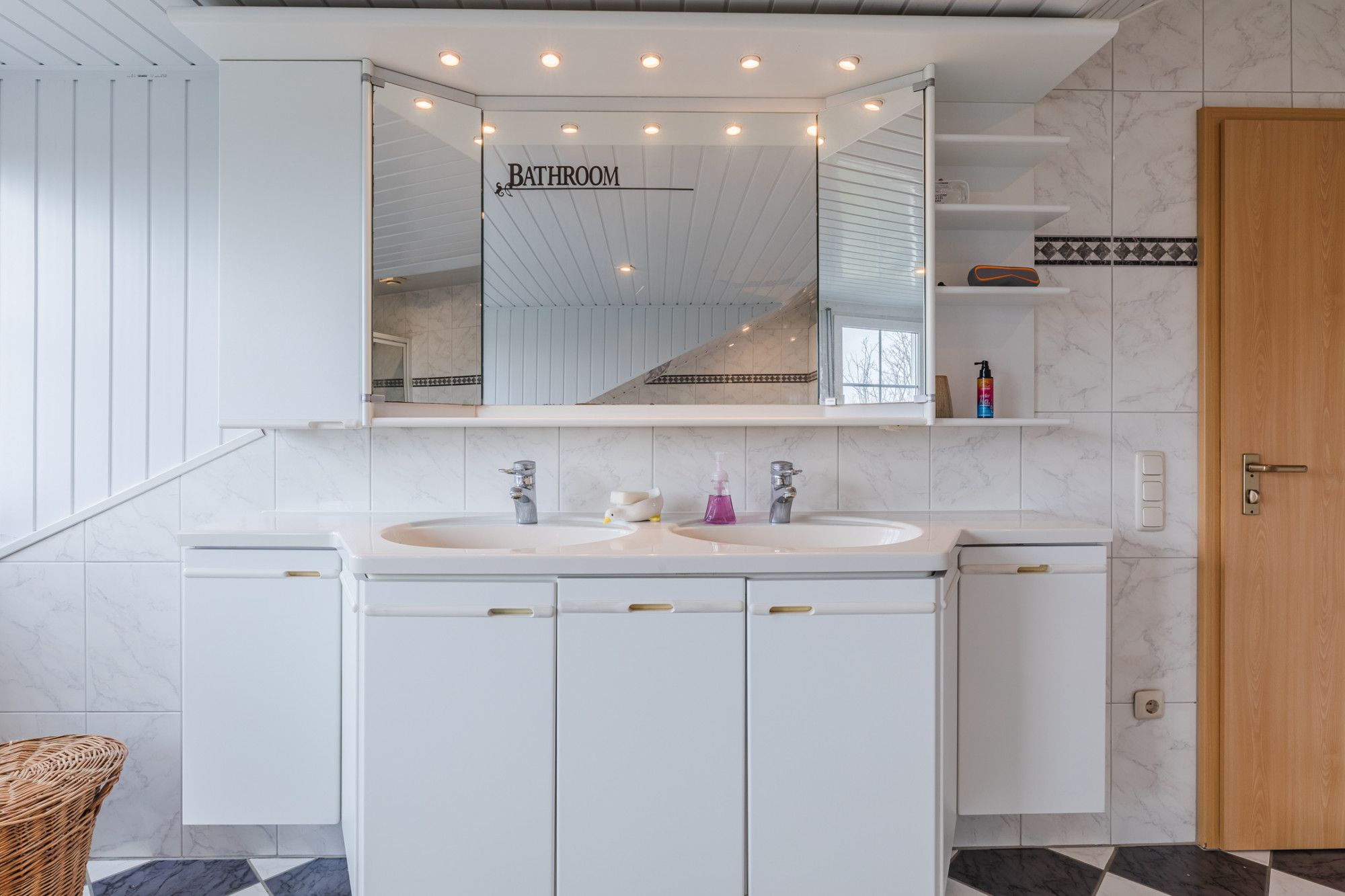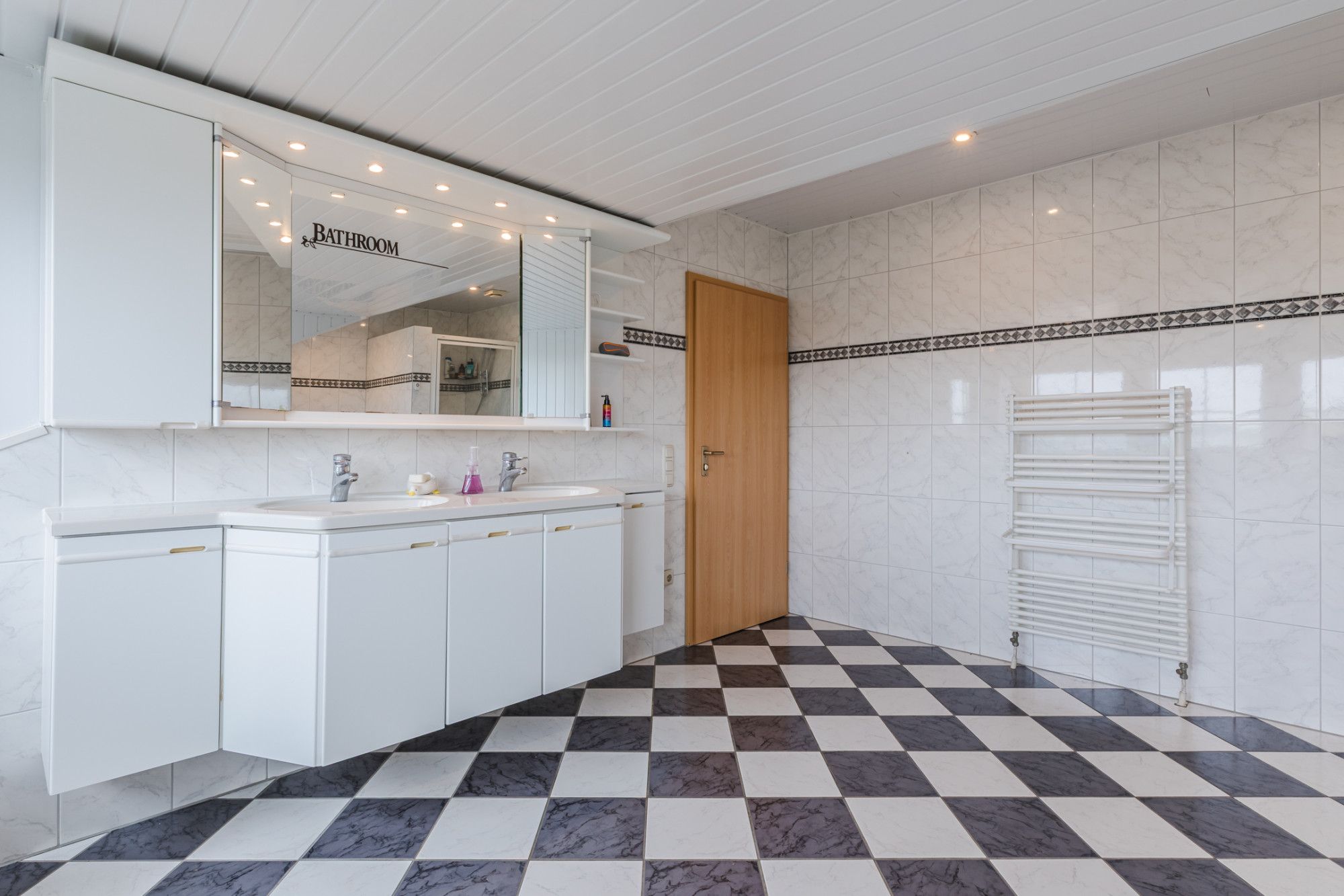 Großes Badezimmer mit Fliesenboden, Badewanne, Dusche und Doppelwaschtisch