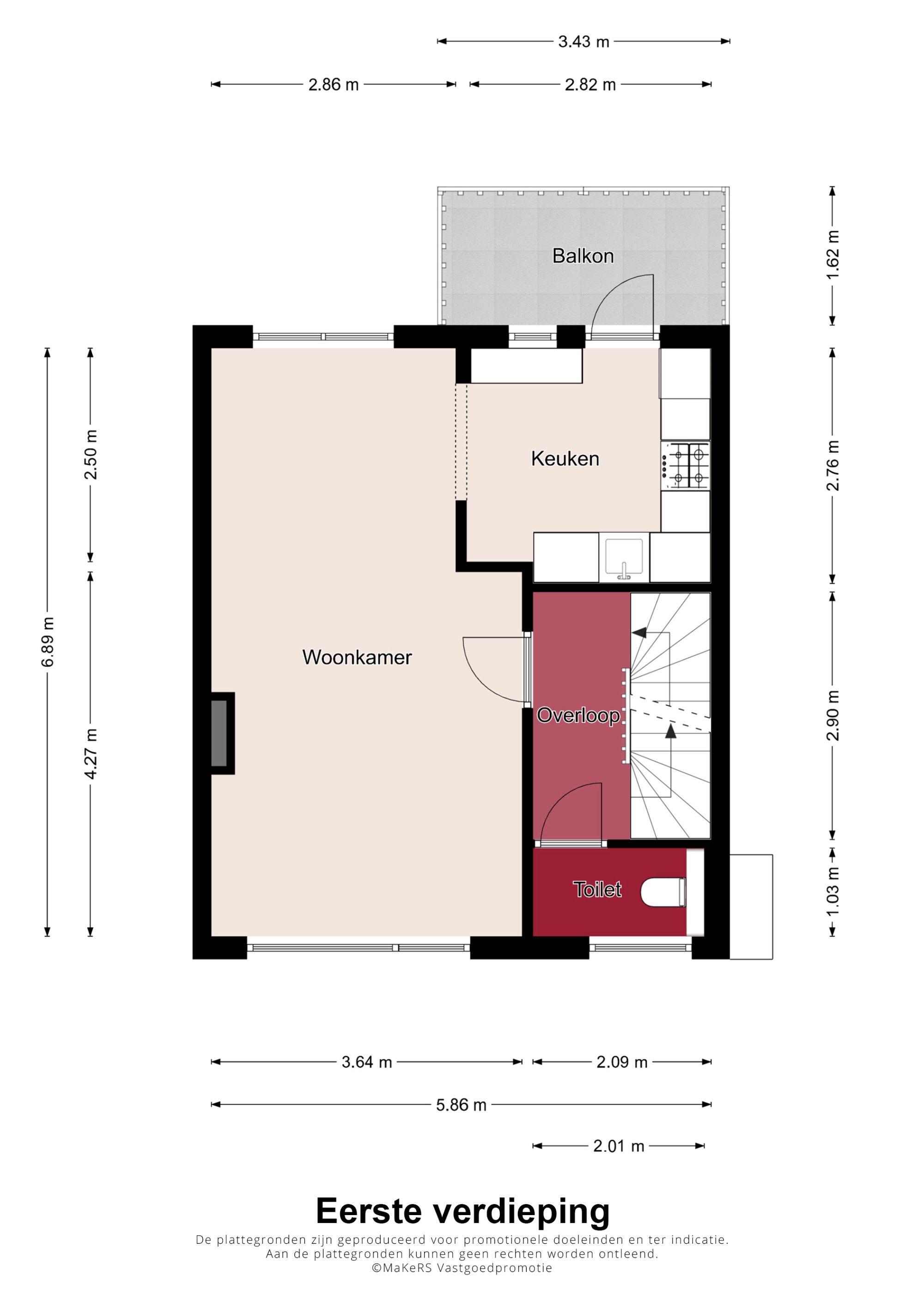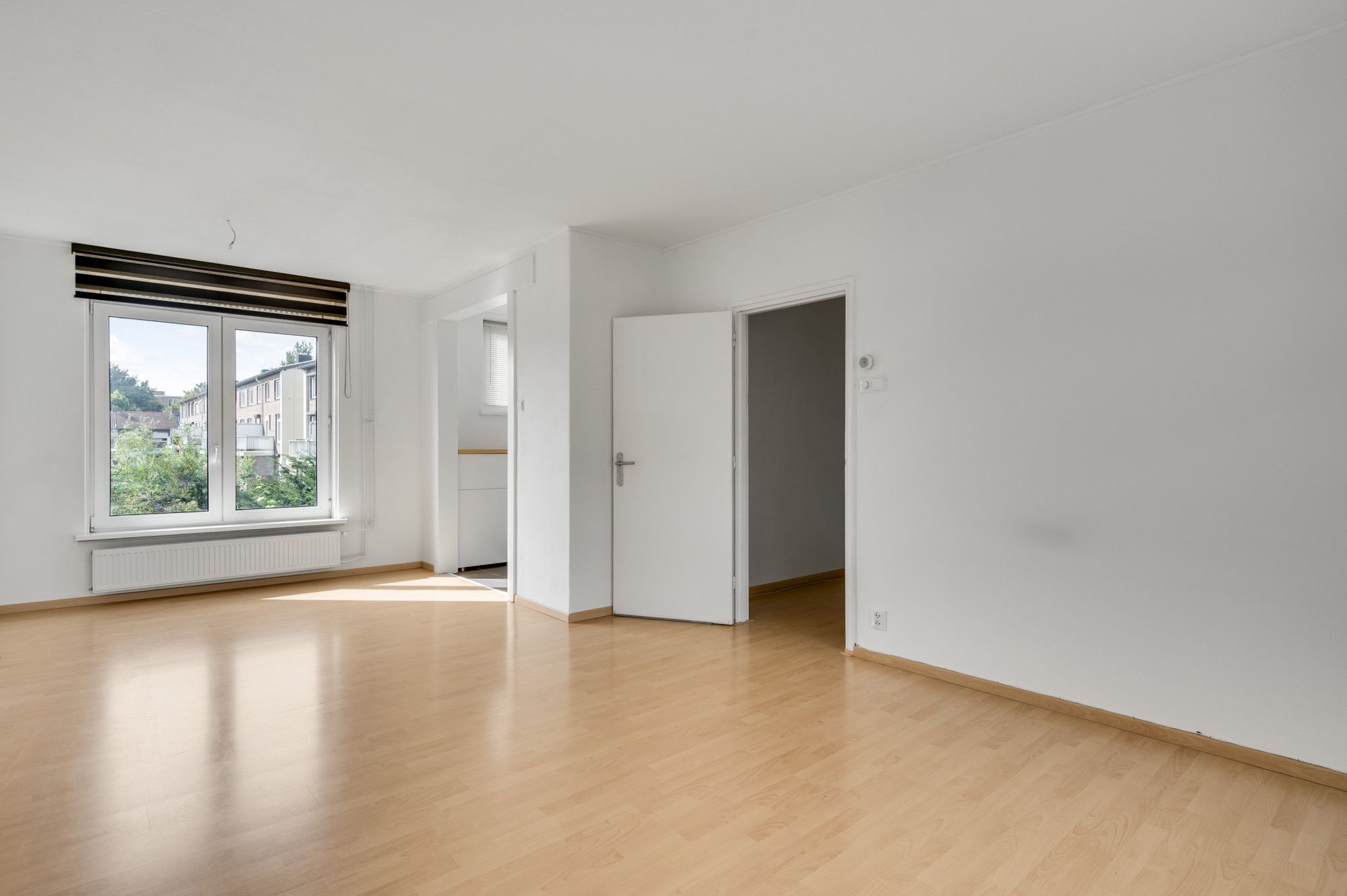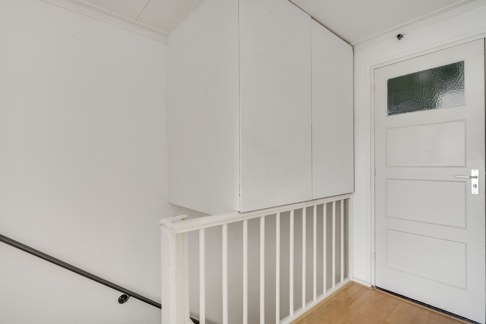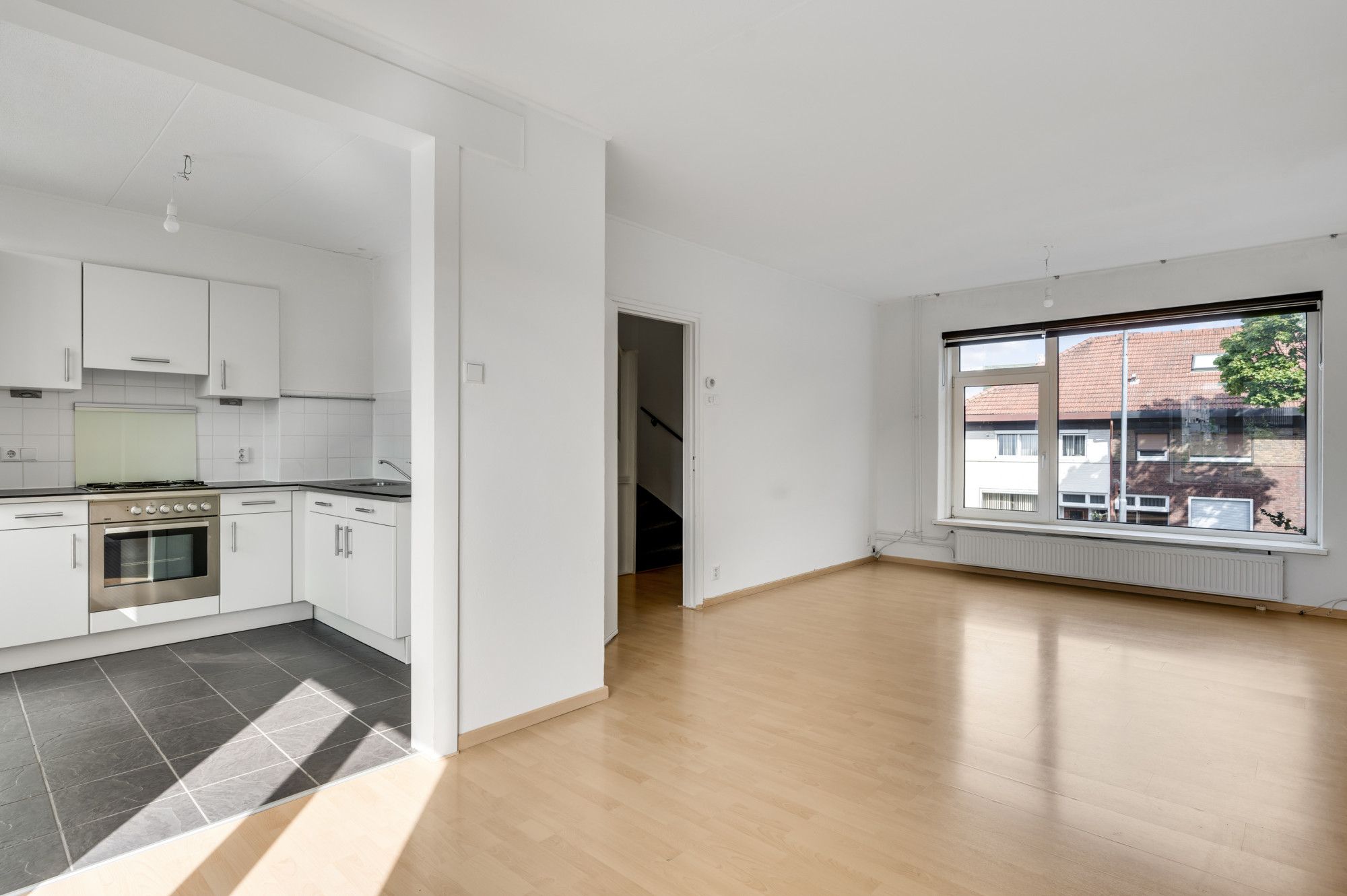 Overloop die toegang geeft tot de moderne toiletruimte en de ruime woonkamer, die direct opvalt door de grote raampartijen en de aangename lichtinval. De laminaatvloer zorgt voor een warme uitstraling. De halfopen keuken is voorzien van een combinatie in hoekopstelling is compleet uitgerust met een gasfornuis, afzuigkap, combi-oven, koelkast en vaatwasser. Vanuit de keuken loop je zo het balkon op; een fijne plek om buiten te zitten en geeft uitzicht op o.a. je eigen privé tuintje op de begane grond.