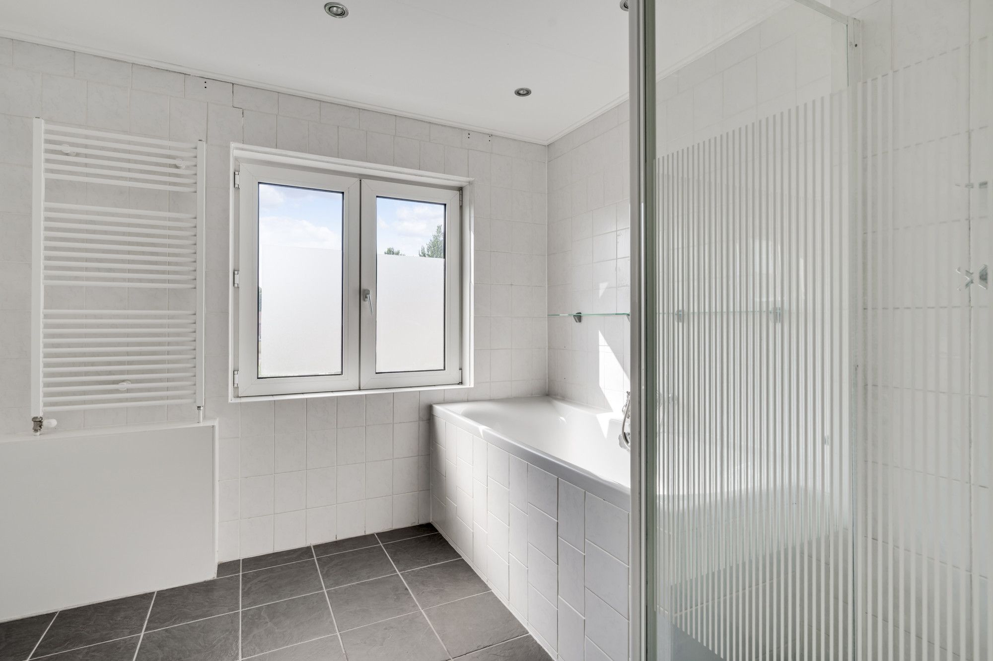 Via deze 2e overloop vind je de toegang tot twee slaapkamers, de geheel betegelde badkamer met ligbad, douche en wastafel, en een berging met de witgoedaansluitingen en de opstelling van de cv-ketel (Atag HR, ca. 2023, eigendom). Ook hier zijn de vloeren netjes afgewerkt met laminaat.