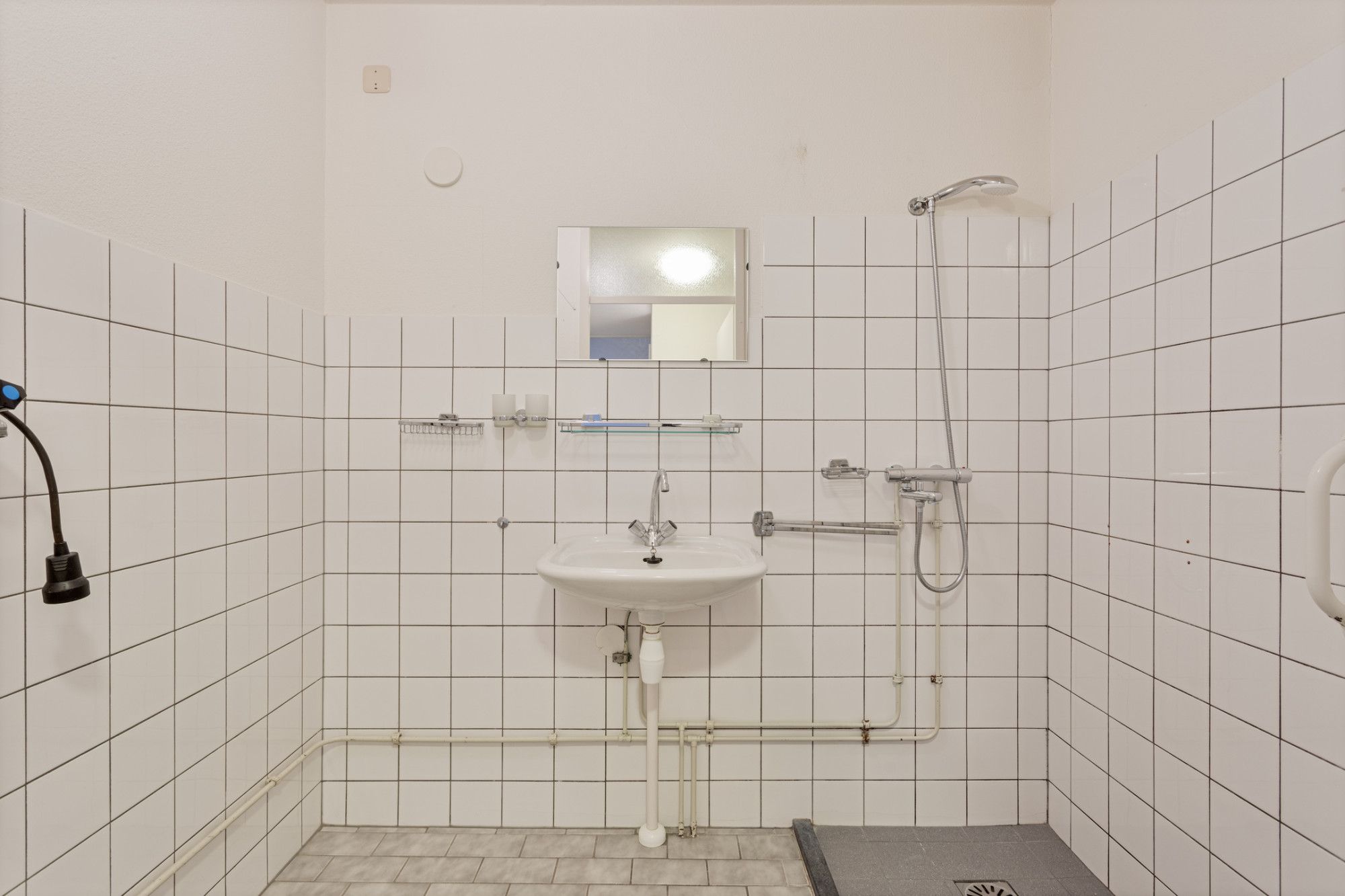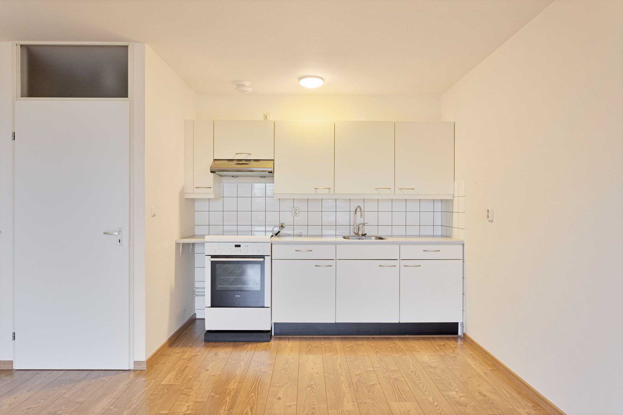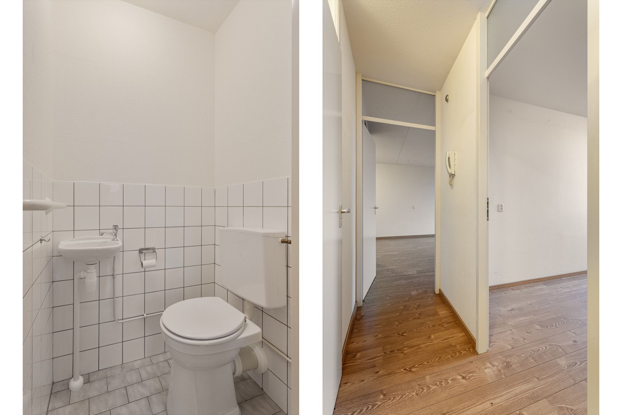 De entree met meterkast biedt toegang tot de ruime en lichte woon/eetkamer, twee slaapkamers, badkamer, toilet en de open keuken. De badkamer en het toilet zijn halfhoog betegeld. In de badkamer bevindt zich een vaste wastafel en douche.