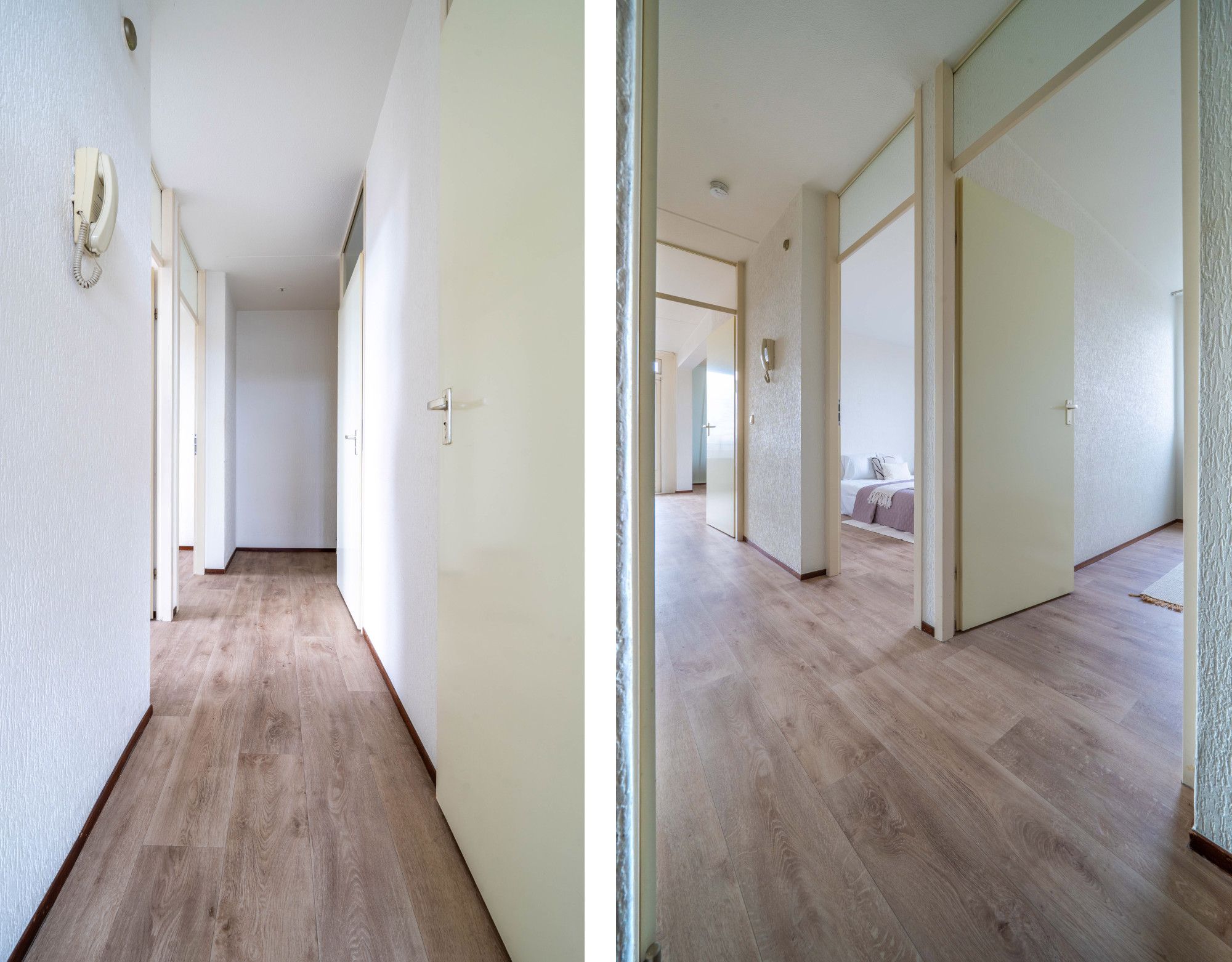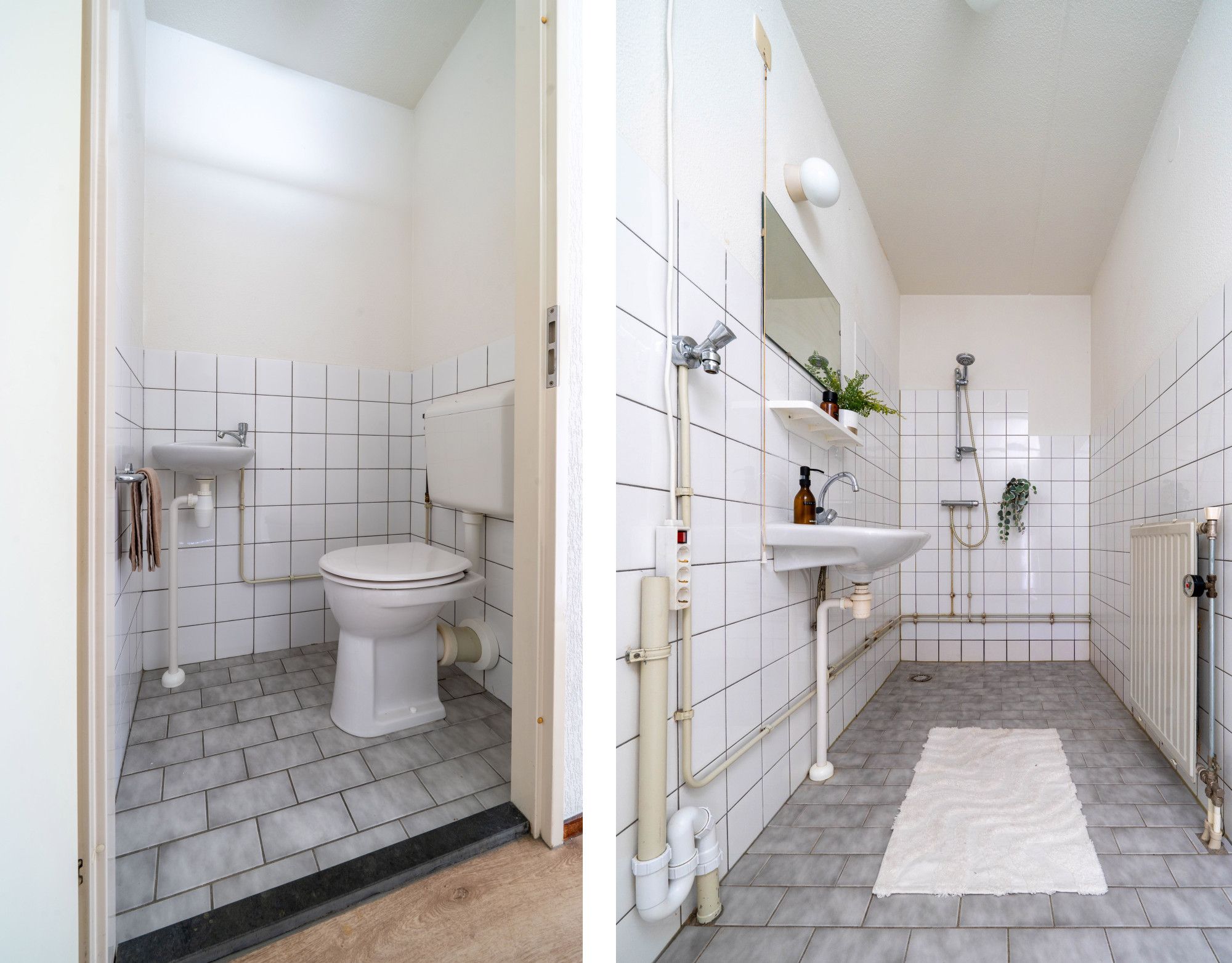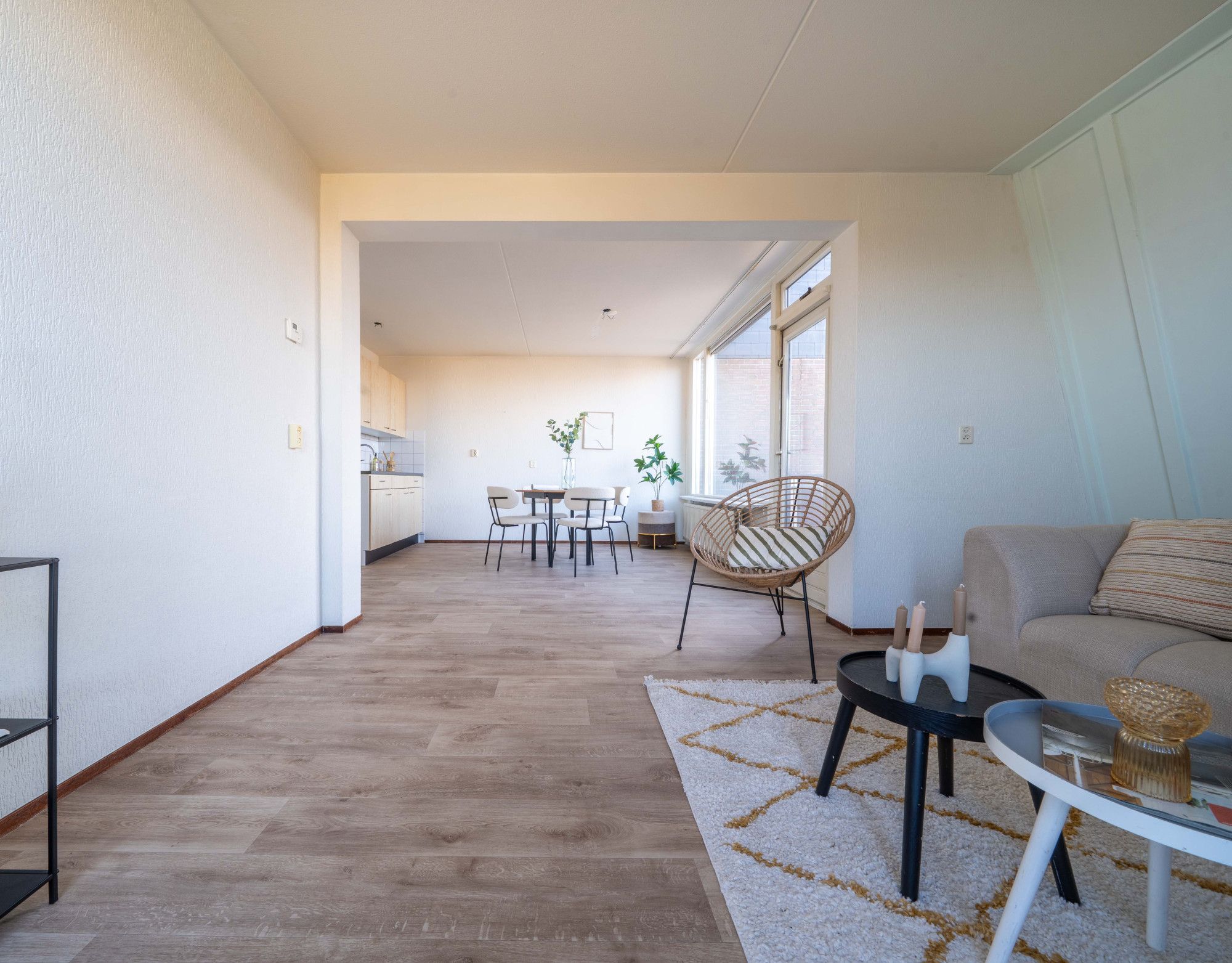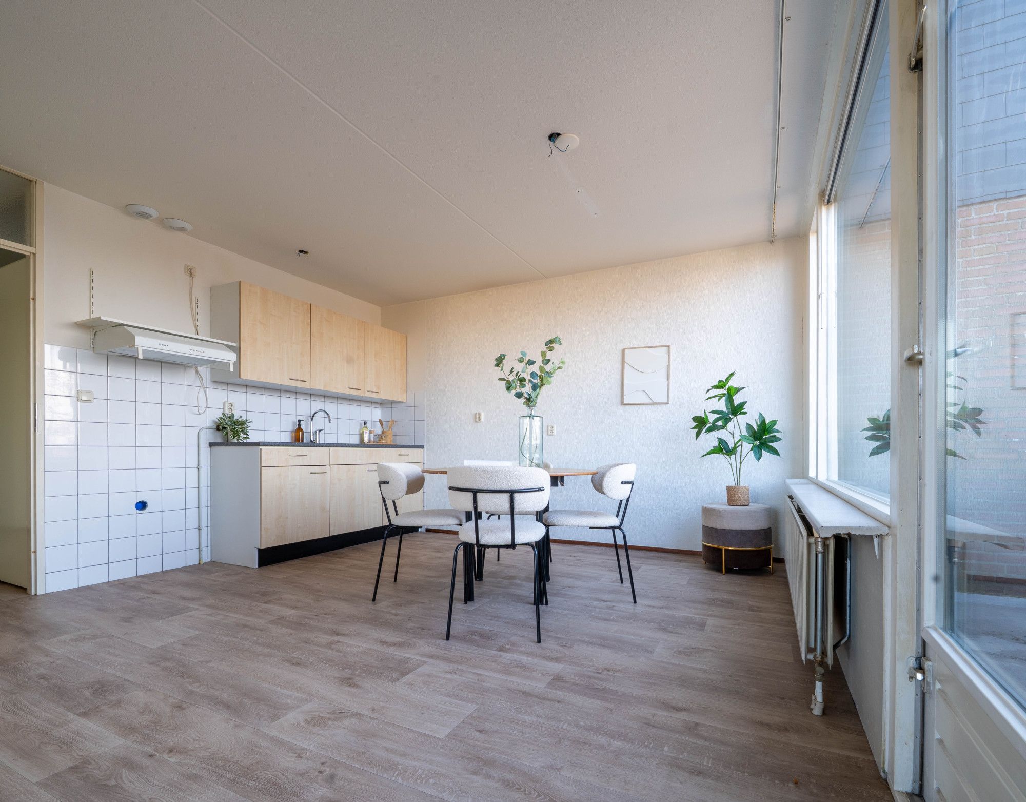 De entree met meterkast biedt toegang tot de ruime en lichte woon/eetkamer, twee slaapkamers, badkamer, toilet en de open keuken. De badkamer en het toilet zijn halfhoog betegeld. In de badkamer bevindt zich een vaste wastafel en douche.