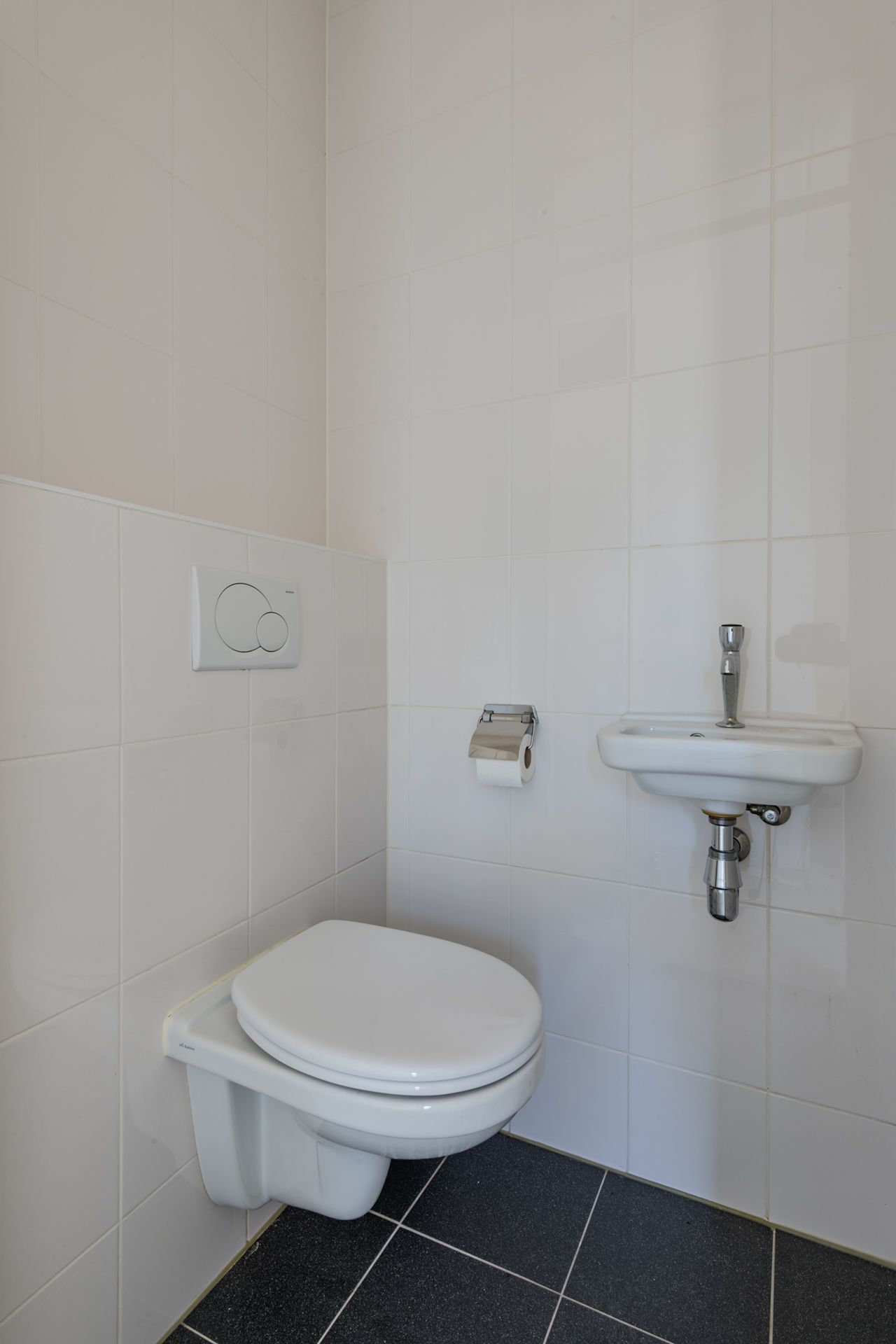 Toiletruimte: wandcloset, fontein, witte wandtegels, antraciet vloertegels.