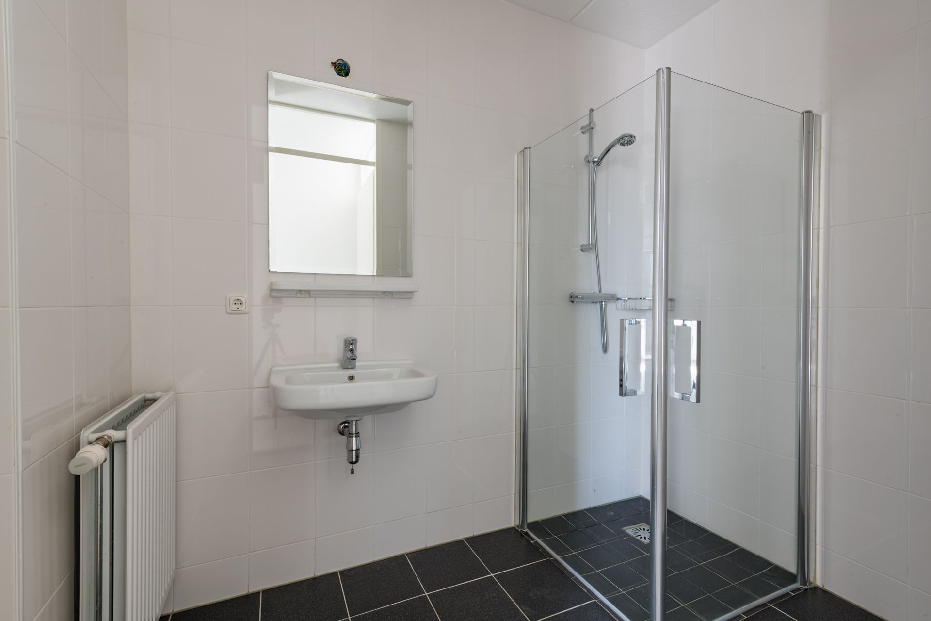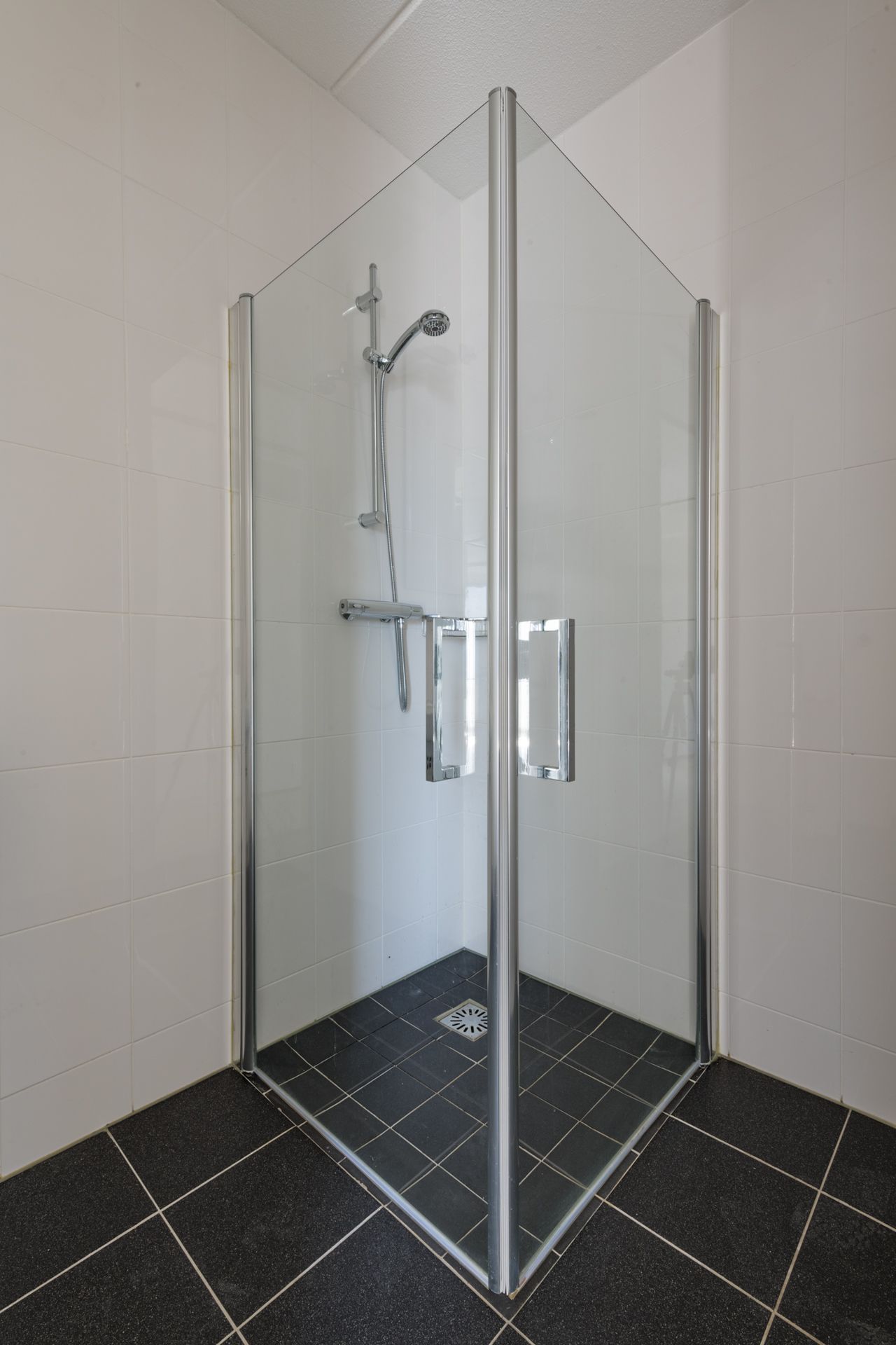 Badkamer: voorzien van een moderne douche, wastafel en aansluiting/afvoer voor de wasmachine, witte wandtegels tot het plafond, antraciet vloertegels.