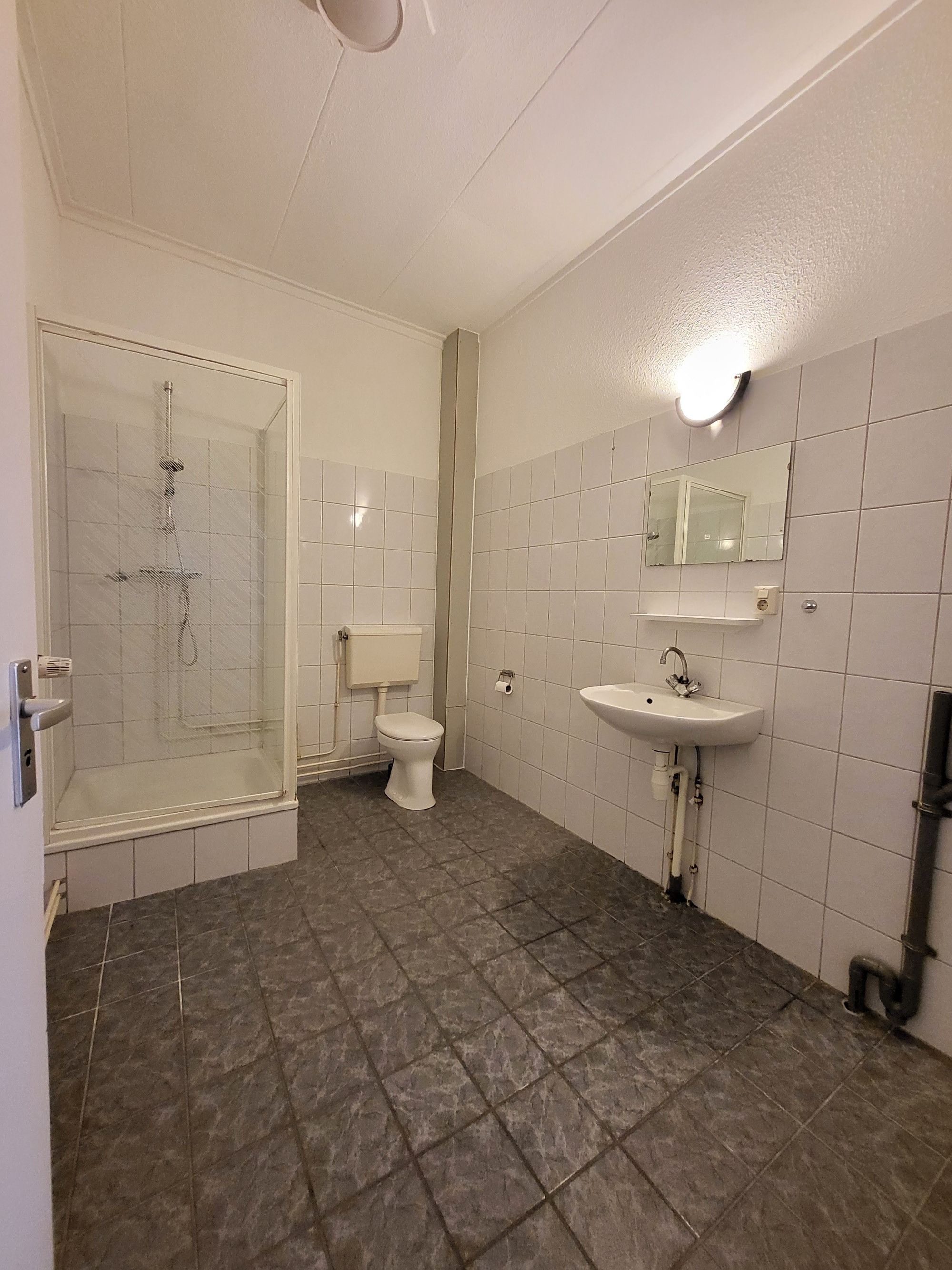 From the living room, you have access to the approximately 8m² semi-open kitchen. The corner kitchen is equipped with a built-in refrigerator, 4-burner stove, and extractor hood. The spacious tiled bathroom of approximately 7m² is accessible from the kitchen and is equipped with a shower, toilet, laundry connections, and sink.