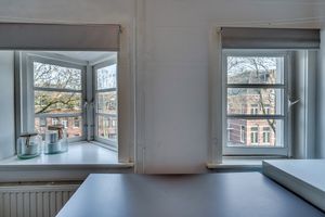 De overloop geeft toegang tot de leefkeuken, woonkamer, eetkamer, toiletruimte, 1e slaapkamer c.q. kantoorruimte en trapopgang naar de 2e verdieping. De half betegelde toiletruimte is voorzien van een zwevend toilet. De ruime doorzonwoonkamer is ingedeeld in een zit en eetgedeelte, middels originele port-brisée deuren is de woonkamer in 2 delen te scheiden. De woonkamer van ca. 35m² is verder voorzien van 2 originele opbergkasten en een elektrische kachel. Via de eetkamer is er middels de tuindeuren toegang tot het balkon. De gehele woonkamer is voorzien van een eikenplankenvloer. De gezellige originele leefkeuken is voorzien van een 5-pits gasfornuis, afzuigkap, koelkast, vaatwasmachine, terrazzo aanrechtblad en originele vloer in de keuken.