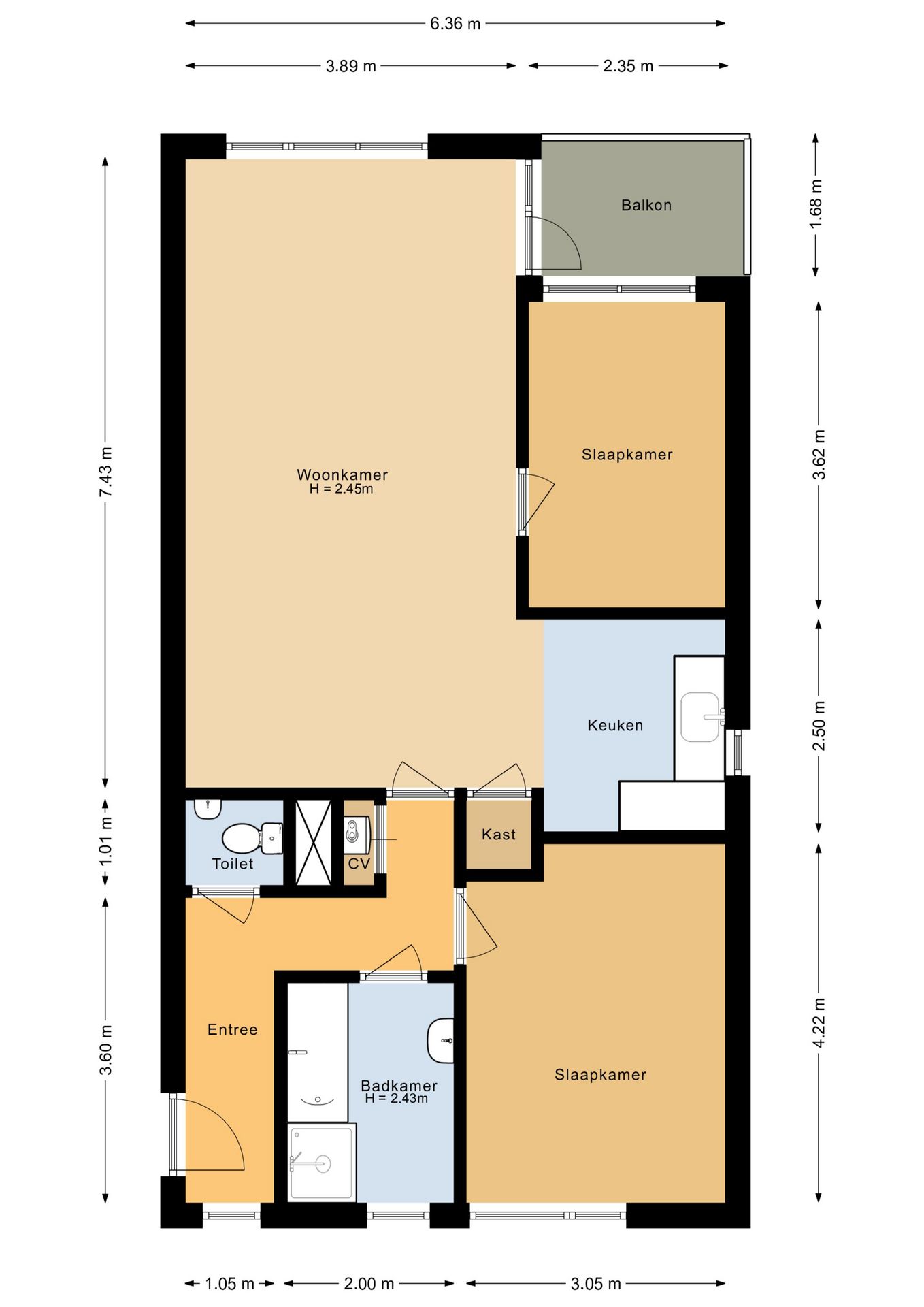Entree met hal, garderoberuimte en separaat toilet met fonteintje. De badkamer is voorzien van ligbad, wastafel en witgoedaansluiting. Lichte woonkamer met open keuken (samen circa 29 m²) aan de straatzijde, met ruimte voor een zit- en eethoek. Vanuit de woonkamer is er toegang tot het balkon (ca. 4 m²) op het oosten. Twee slaapkamers, waarvan de hoofdslaapkamer aan de rustige achterzijde ligt.