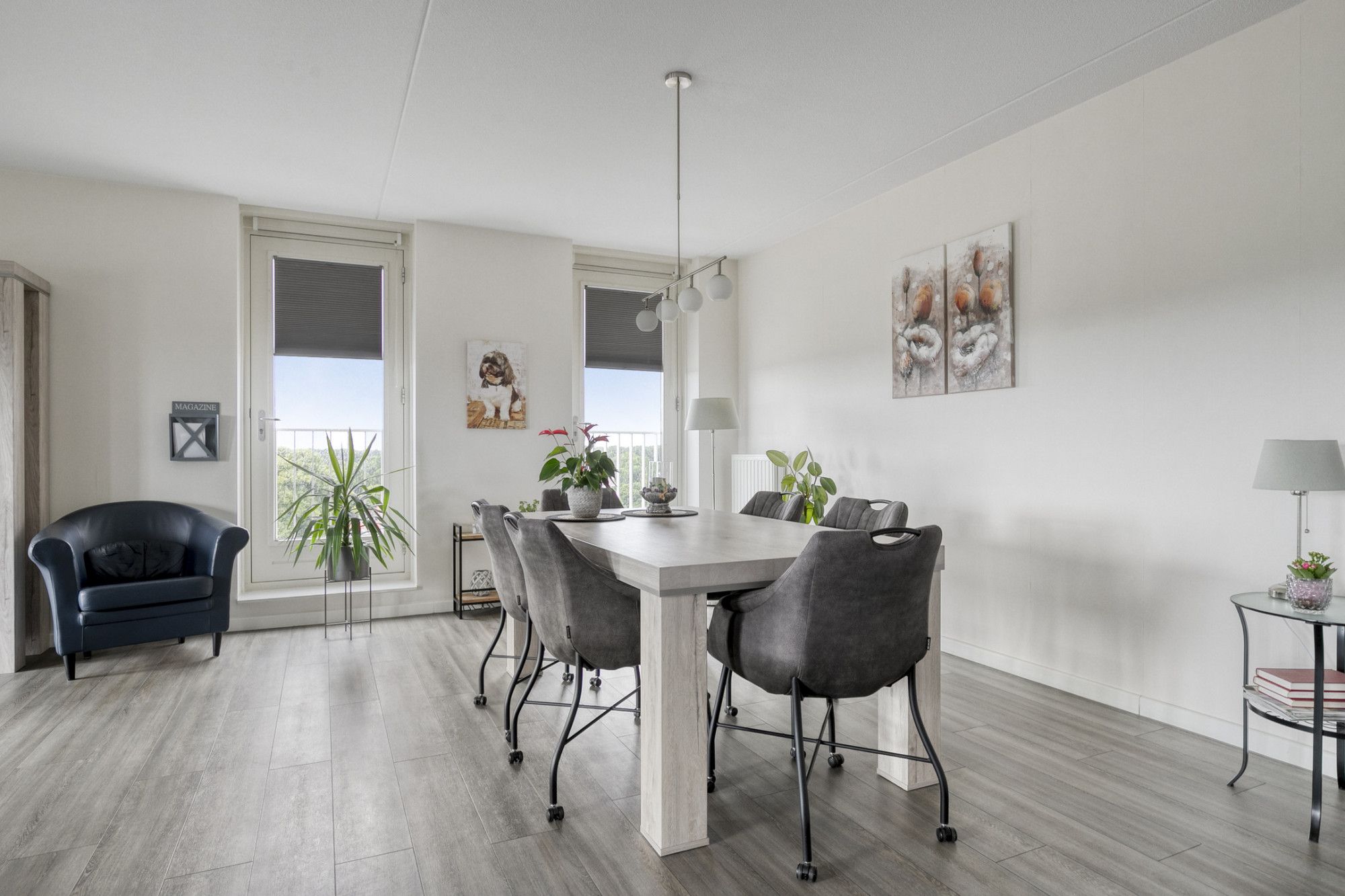De ruime woonkamer van ca. 53 m² biedt volop lichtinval dankzij de grote raampartijen en meerdere Franse balkons. Vanuit de woonkamer is er toegang tot het balkon, met fraai uitzicht over de omgeving. Aansluitend bevindt zich de open keuken in een lichte kleurstelling. Deze is uitgerust met een inductiekookplaat, vaatwasser, inbouwkoelkast en combi-oven.