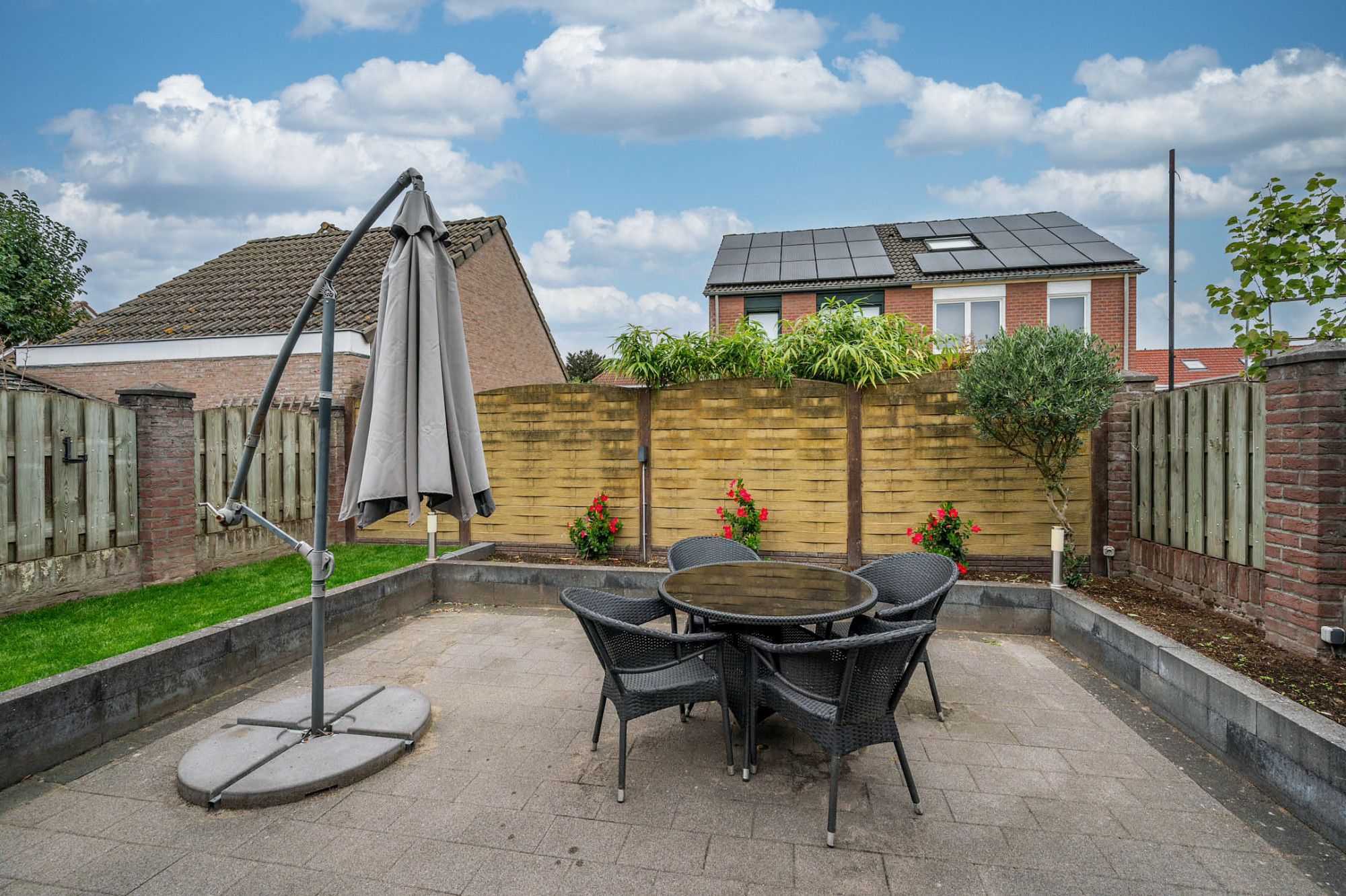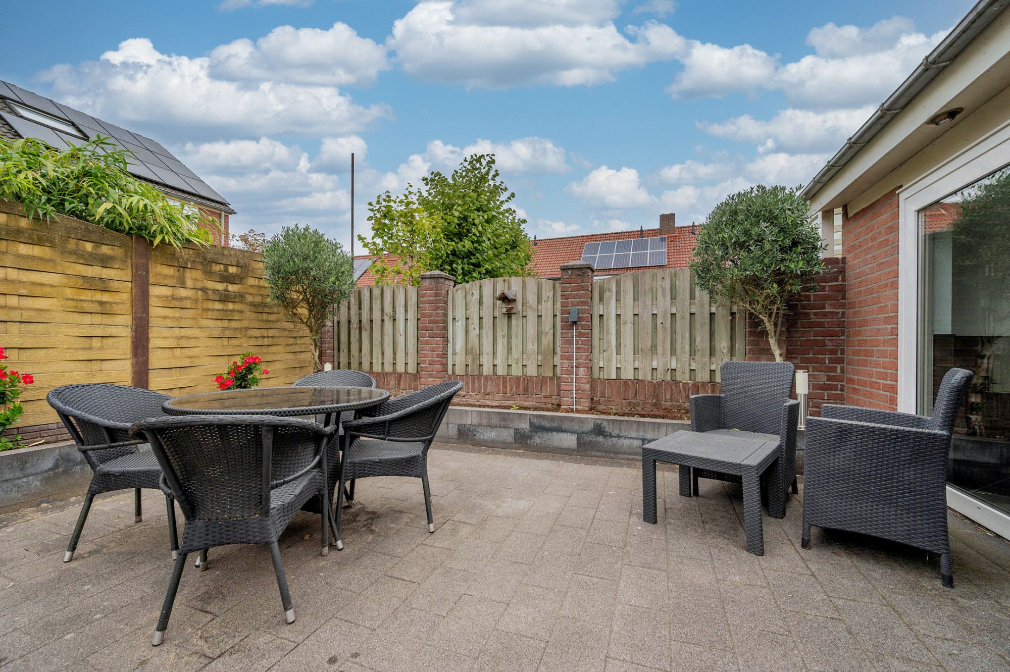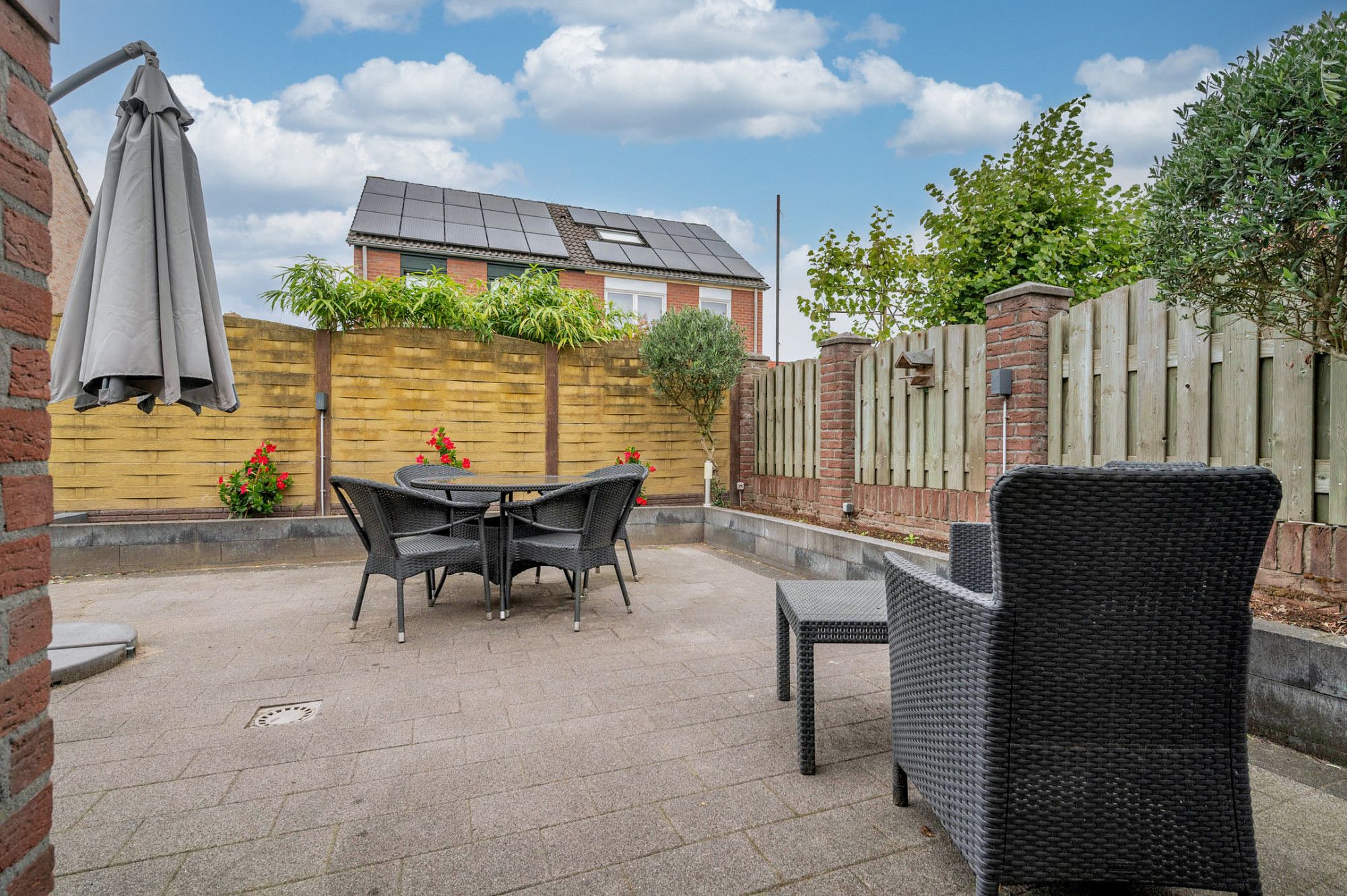 De achtertuin is deels beklinkerd, deels voorzien van gazon en borders met beplanting. De tuin is gelegen op het noordwesten en ruim van opzet.