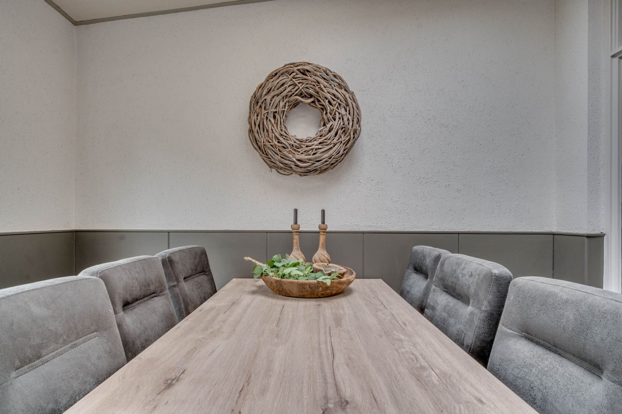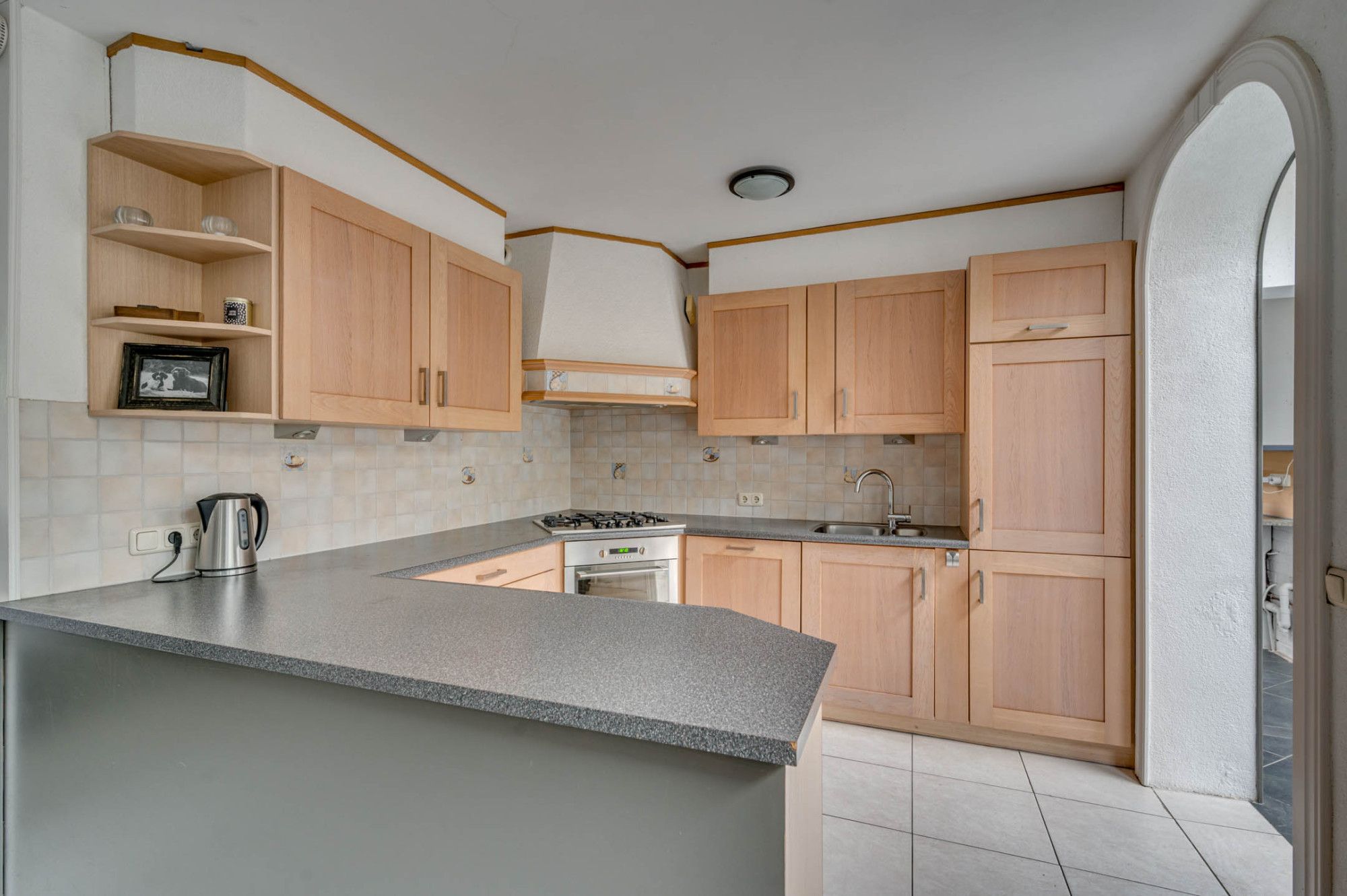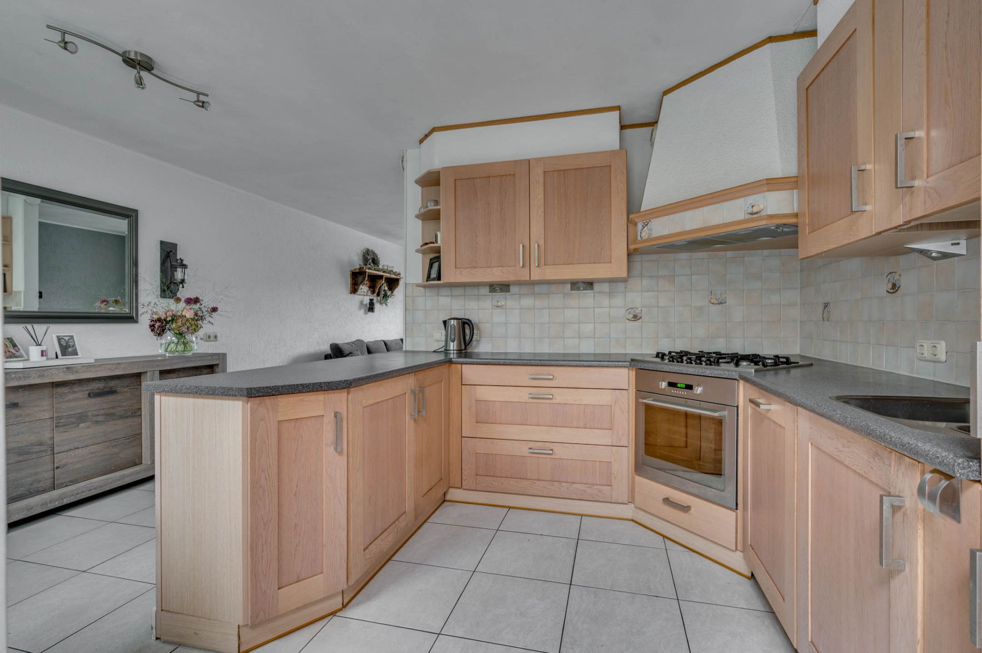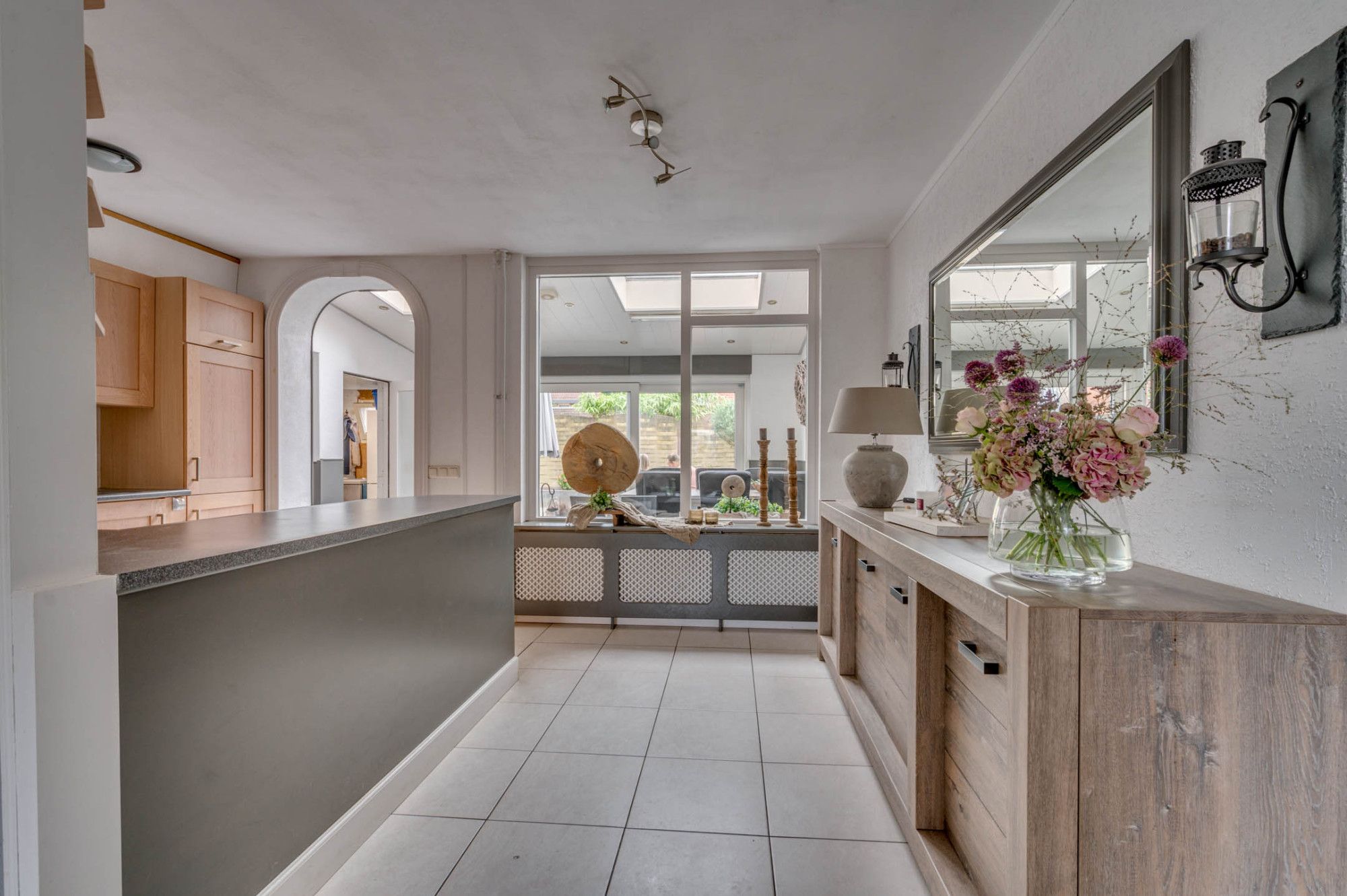 Vanuit de beklinkerde voortuin is zowel de entree als de bijkeuken te betreden. De ruime ontvangsthal is voorzien van een garderobe en geeft toegang tot de meterkast, toiletruimte, woonkamer en de trapopgang naar de 1e verdieping. De deels betegelde toiletruimte is voorzien van een zwevend toilet, fonteintje en raam. De royale doorzonwoonkamer is voorzien van een tegelvloer. De woonkamer ontvangt door de ruime vensters veel daglichttoetreding, heeft een mooi uitzicht over de tuin en geeft zowel toegang tot de keuken als de tuin. Tevens is het raam aan de voorzijde voorzien van een rolluik. De ruime keuken is in een U-vorm opgesteld en is voorzien van een 5-pits gasfornuis, afzuiging, vaatwasser, koelkast en hete lucht oven. De bijkeuken is ruim van opzet en voor meerdere doeleinden te gebruiken. Verder is de bijkeuken voorzien van een twee lichtkoepels. Middels de eetkamer welke aan de achterzijde te vinden is toegang tot de wasruimte. Hier zijn de witgoedaansluitingen te vinden. Middels een schuifpui is de tuin te betreden.