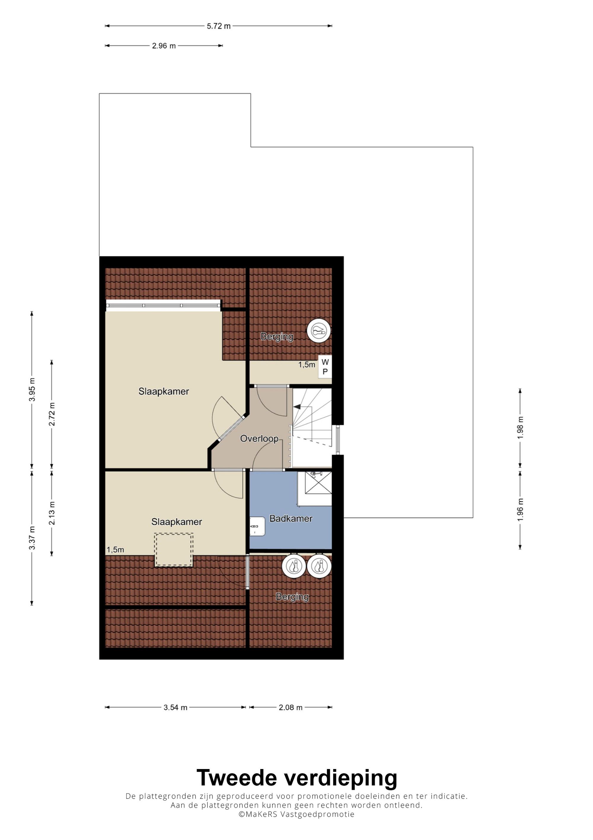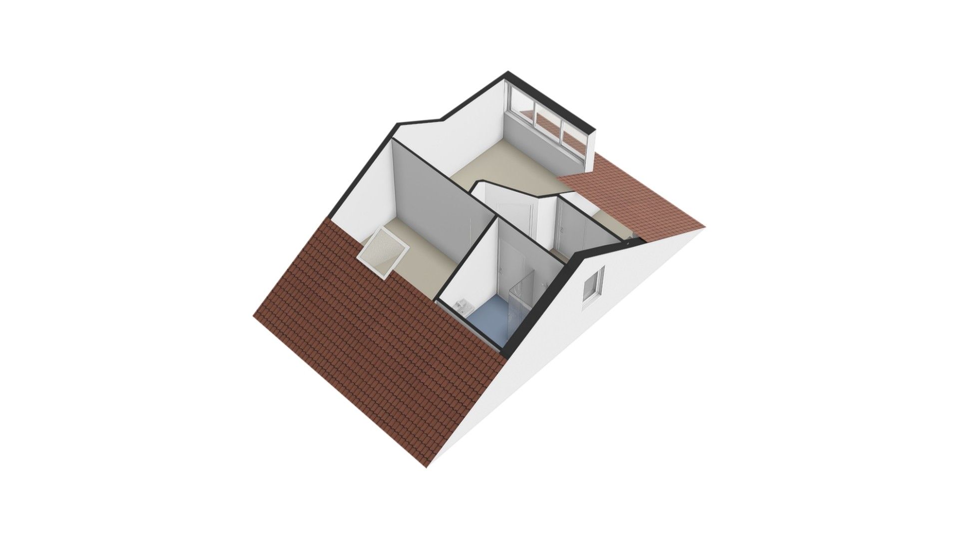 Centraal op deze verdieping bevindt zich de tweede badkamer met wastafel en douchecabine. Daarnaast is er volop bergruimte in de schuinte van de dakconstructie, waar tevens de warmtepompinstallatie en boilers zijn geplaatst.
