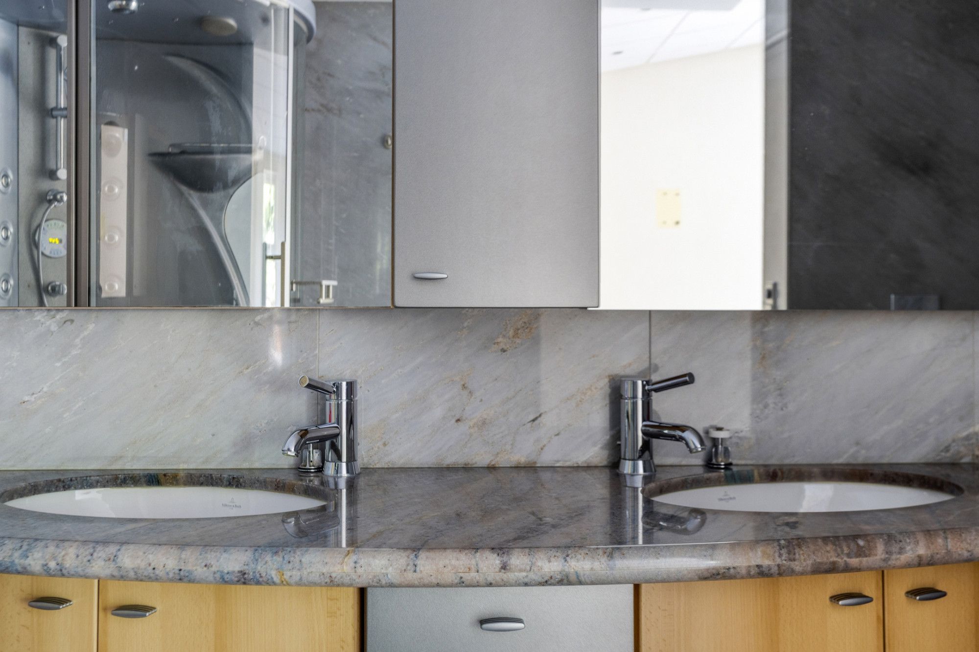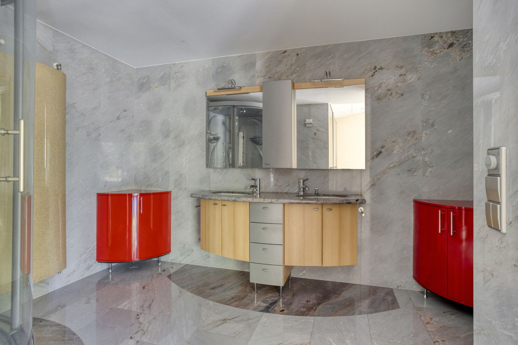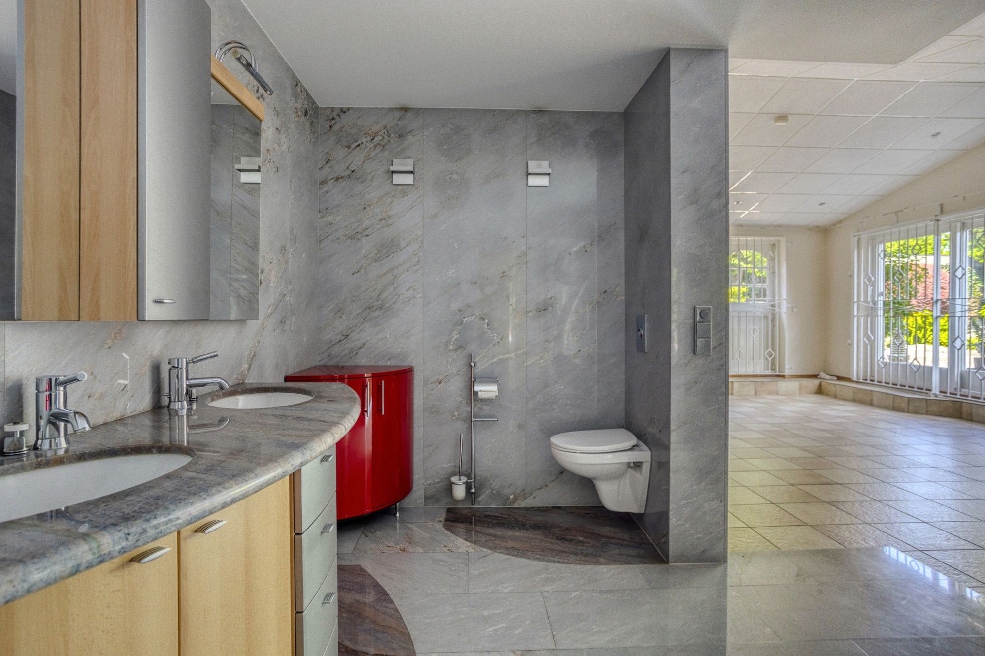 Via een tussenhal met vaste kast is de royale masterbedroom (ruim 30m²) met zicht op en toegang tot de tuin, een vaste kastenwand en een riante eigen badkamer (circa 10m²) voorzien van 2-persoons stoomdouchecabine, wastafelmeubel met 2 wastafels en wandcloset.