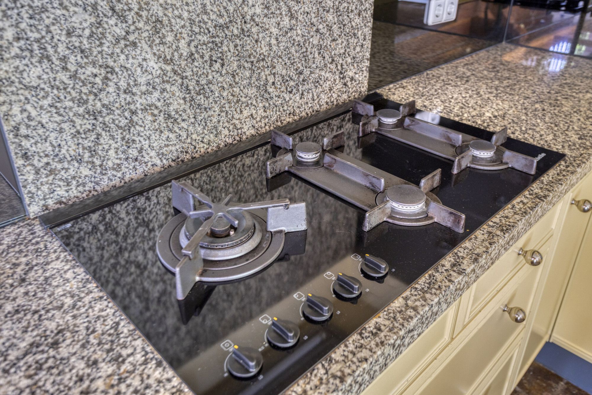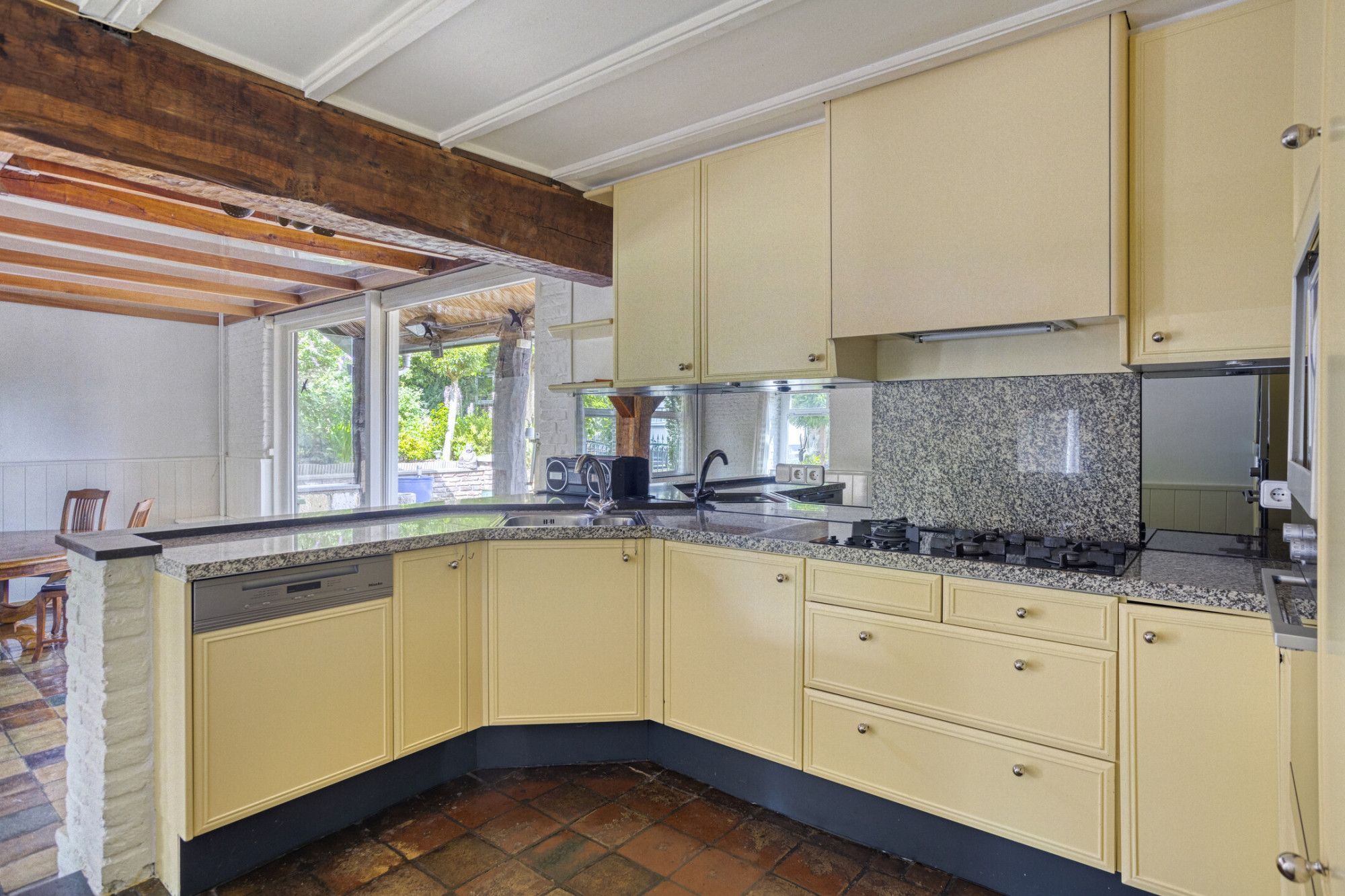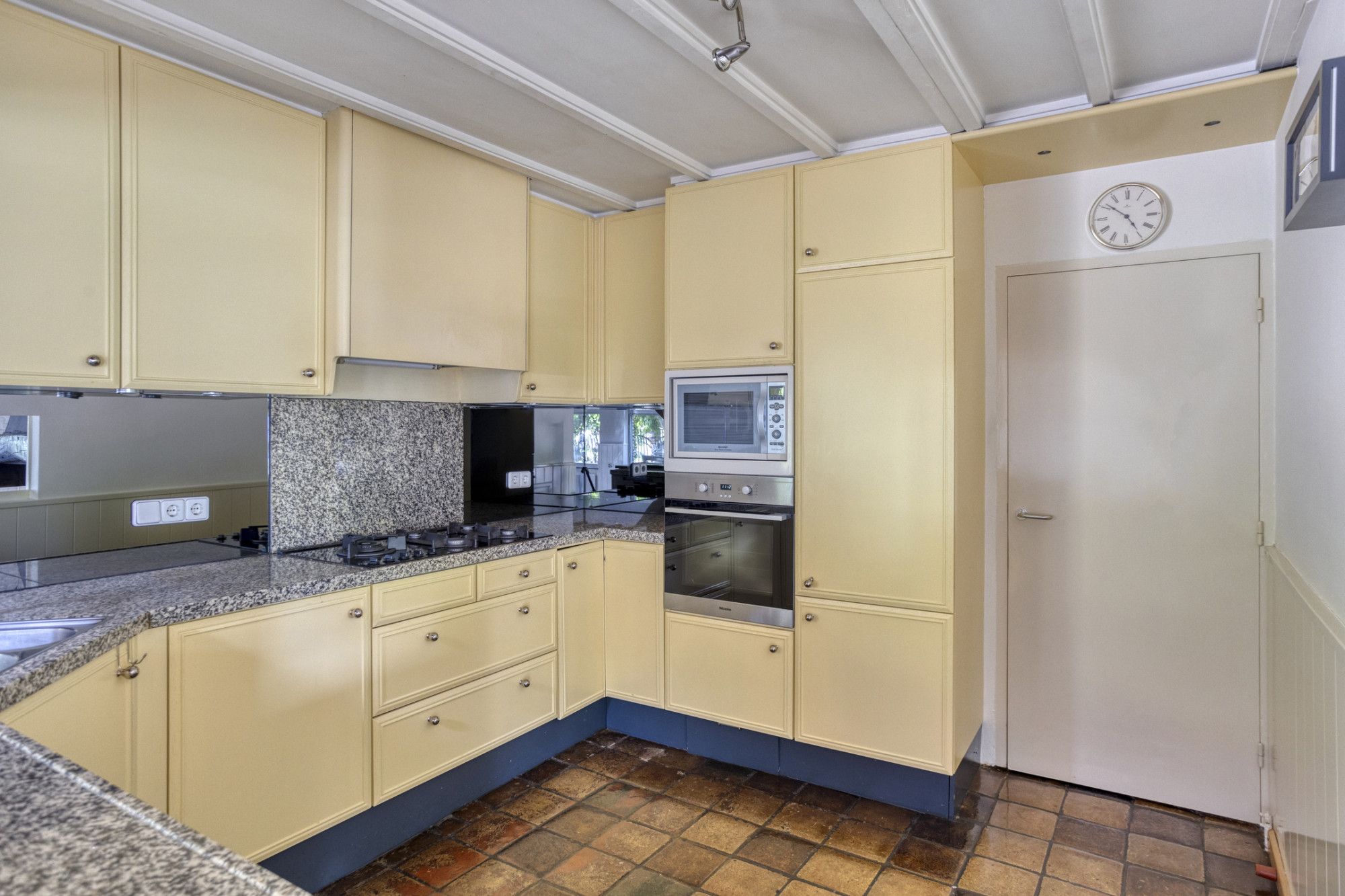 Aan de achterzijde gelegen halfopen keuken (ruim 11m²) met U-vormige inrichting voorzien van granieten werkblad en ingebouwde vaatwasser, 5-pits gaskookplaat, afzuigkap, oven, magnetron en koel-/vriescombinatie.