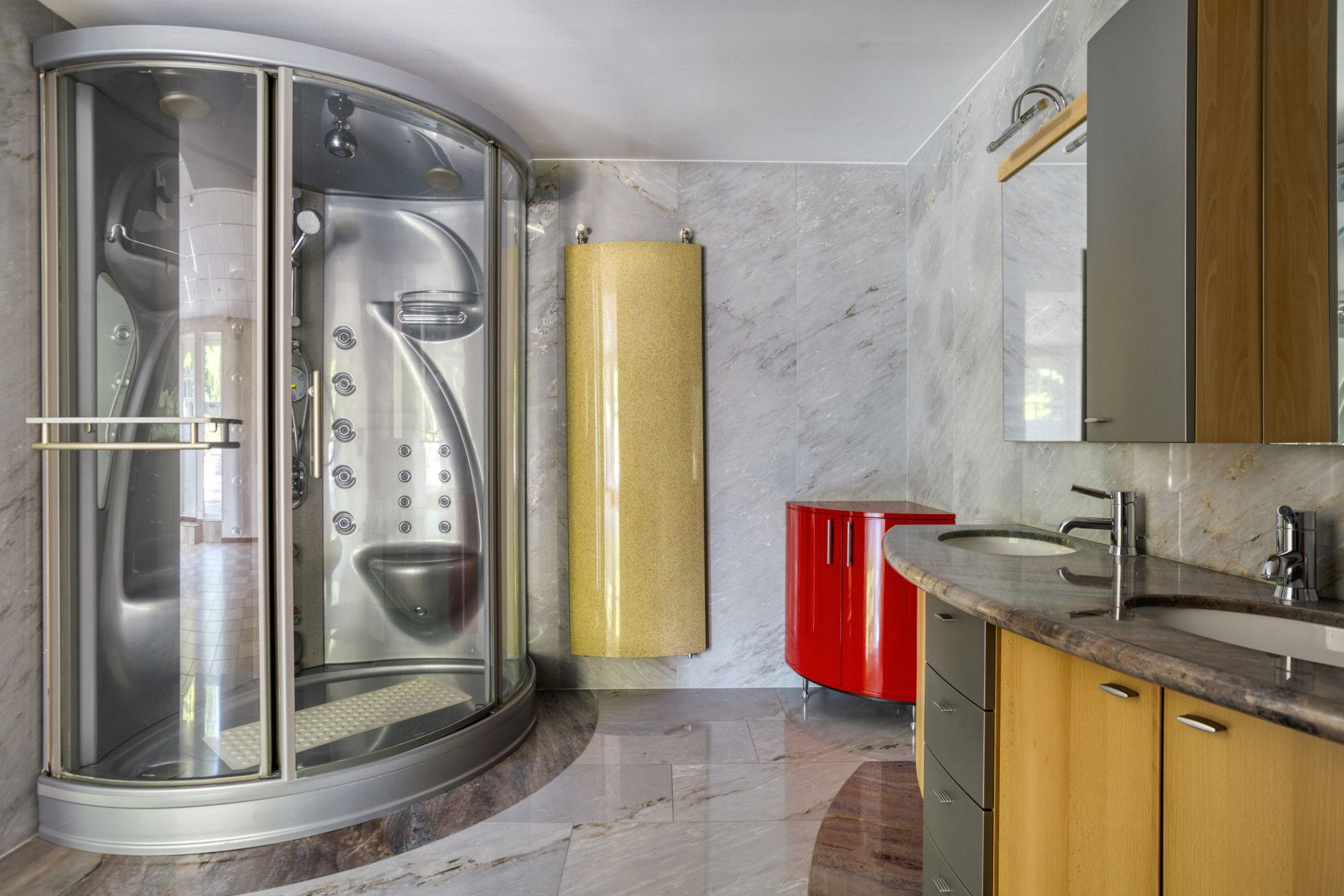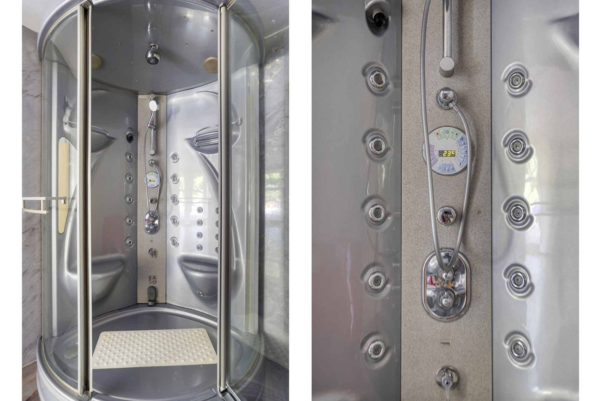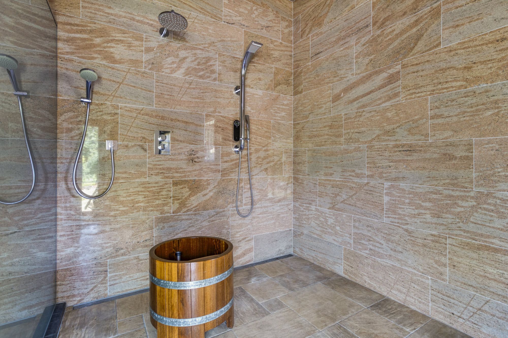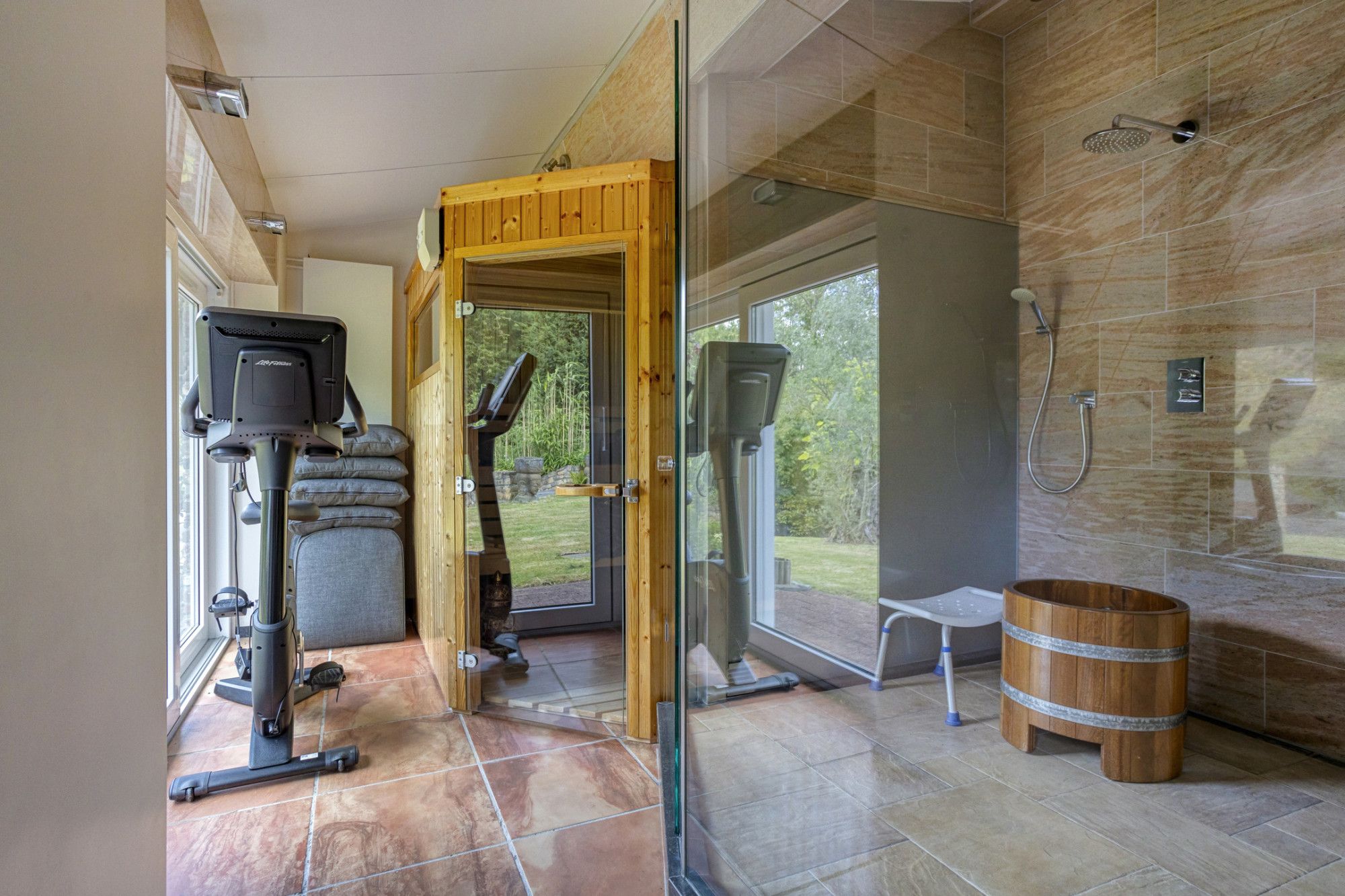 Badkamer met meerpersoons sauna, een meerpersoonsdouche en een schuifpui die toegang geeft tot de tuin.