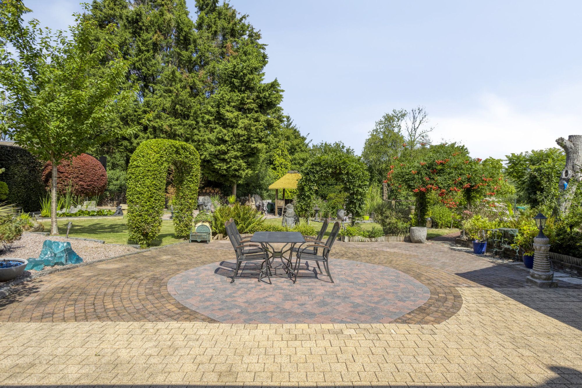 Weelderige borders, diverse terrassen, gazons, een Koivijver, een zwembad van behoorlijk formaat, buitendouche, jacuzzi en meerdere bergingen; om slechts enkele zaken te noemen.