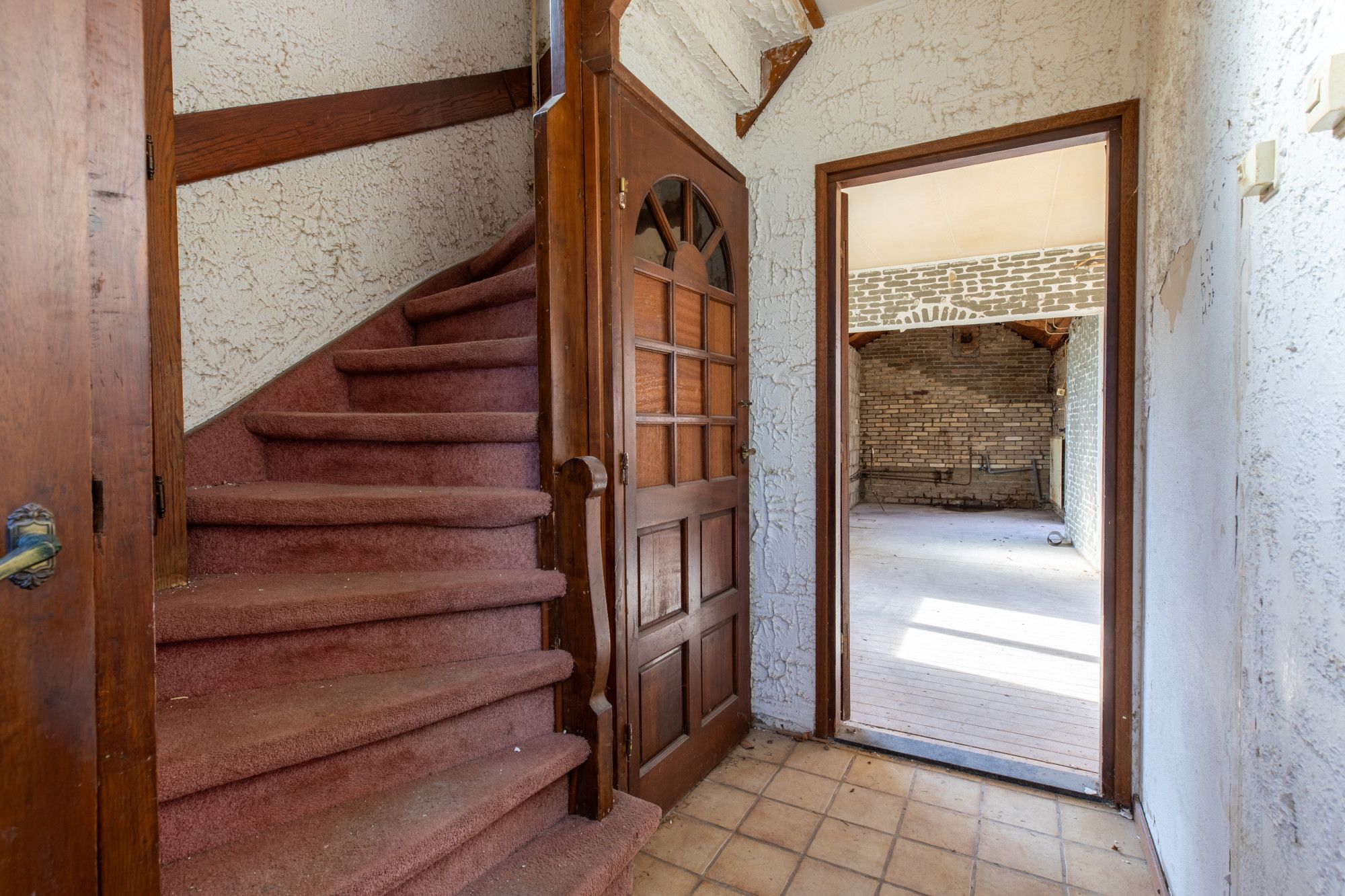 - Ontvangsthal met trappenhuis en toegang tot de woonkamer.