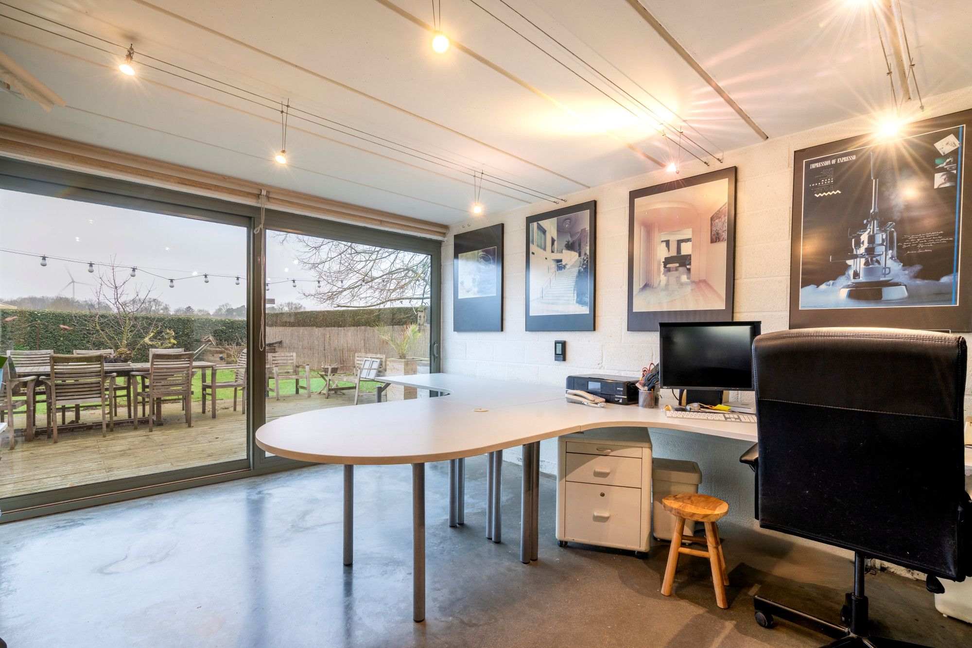 The multipurpose room, which was previously used as a photo studio, is connected to the garage with automatic door and also connects to an office space with terrace, a second bathroom and a separate toilet.