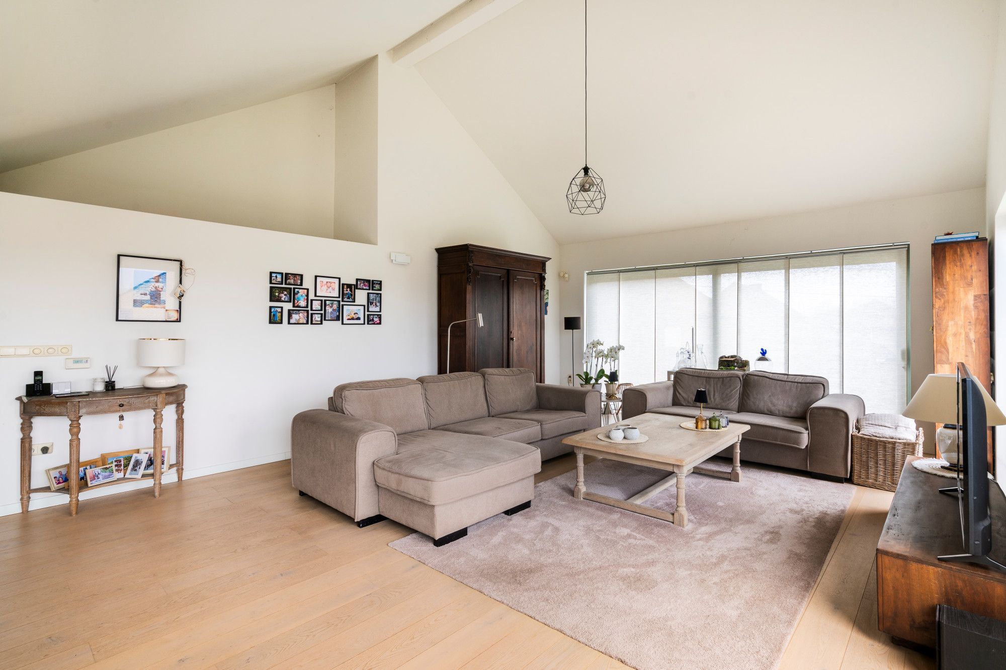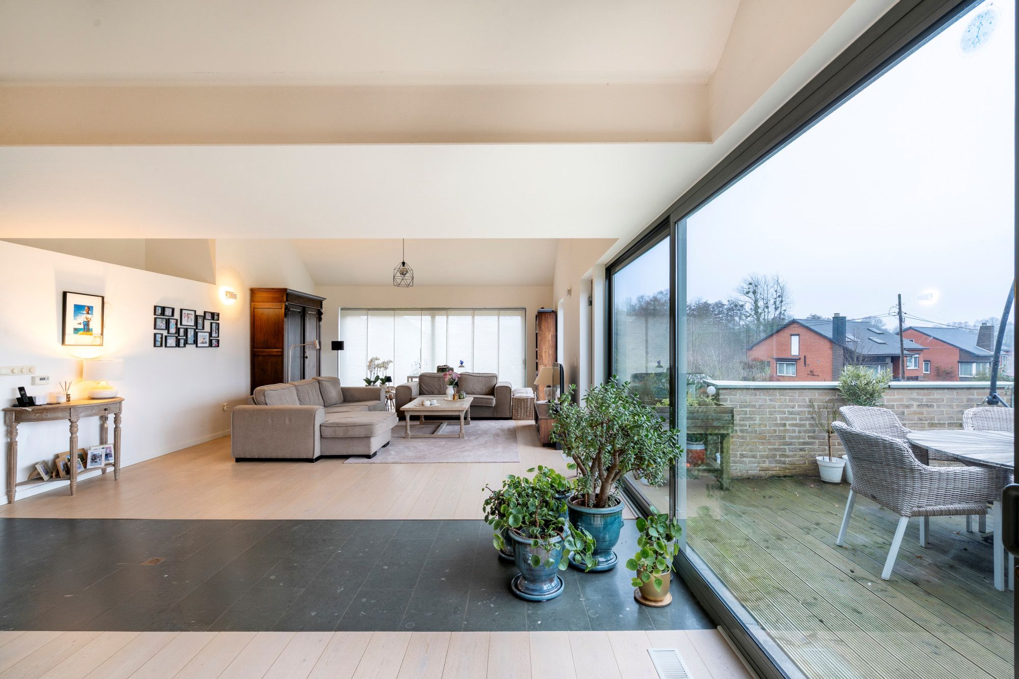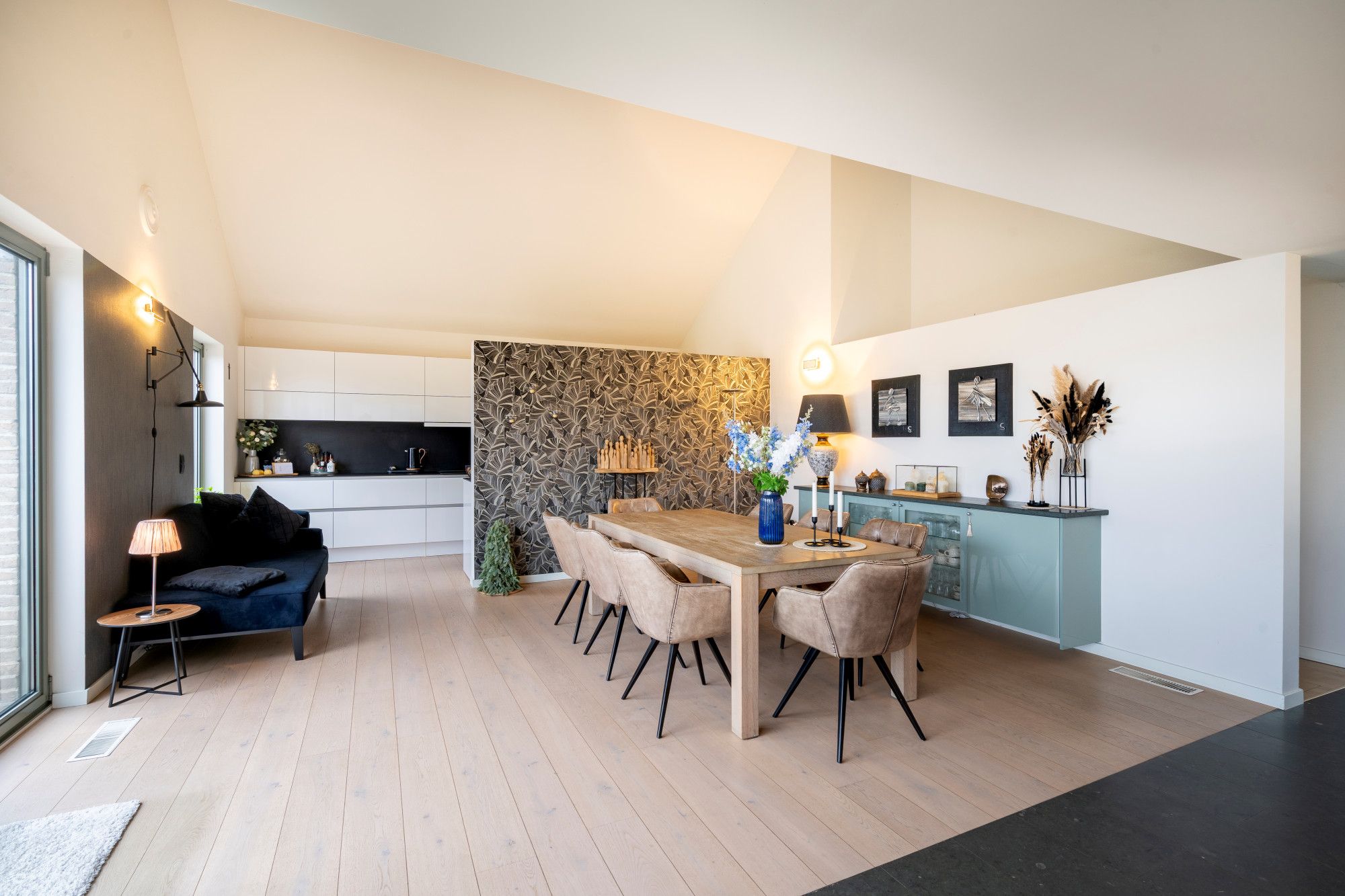 In the living area, a combination of warm parquet flooring and easy-care ceramic tiles was chosen, creating a cosy and timeless look.'