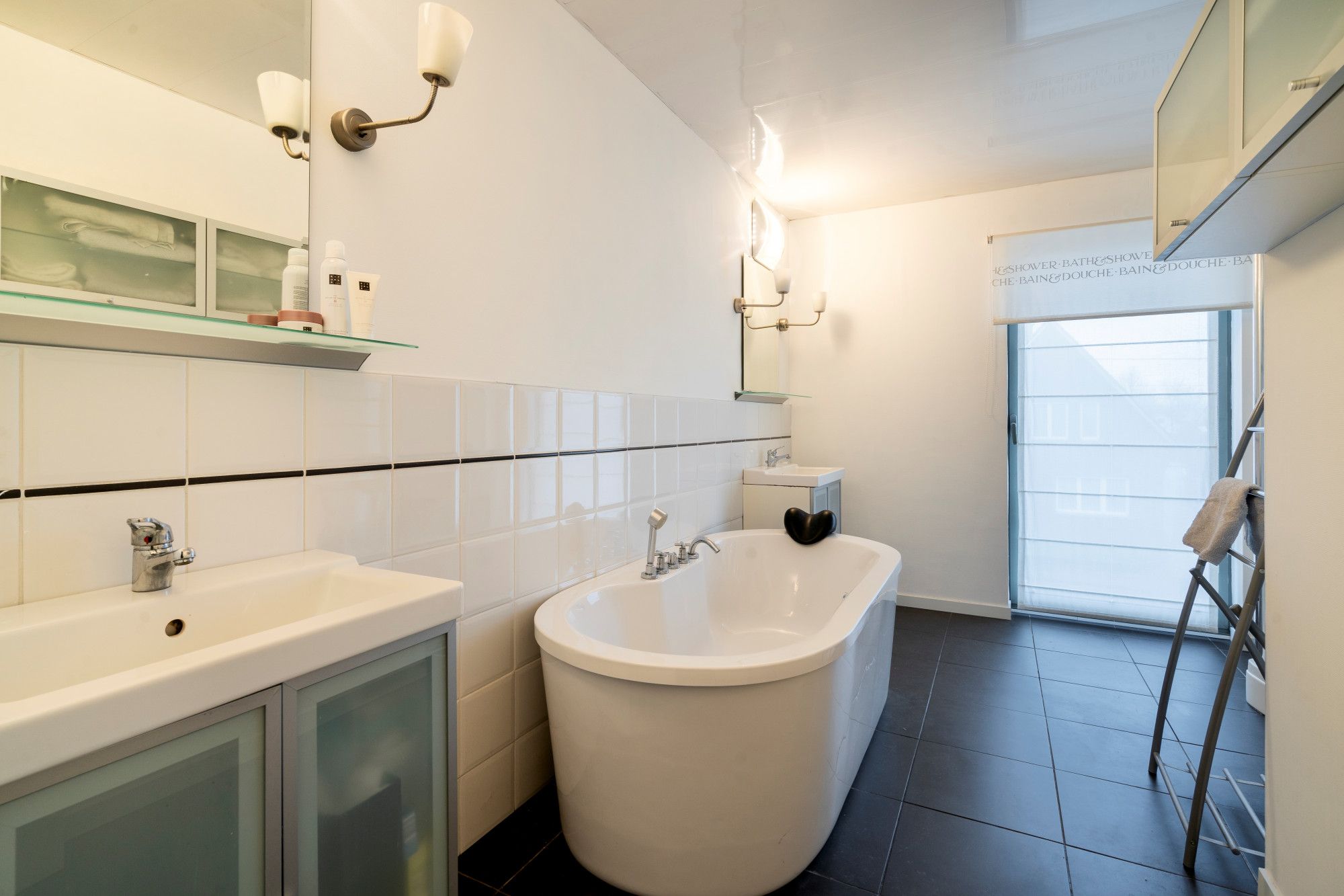 The bathroom in the house has a bath, shower and washbasin integrated into the bathroom furniture. The second bathroom, located on the ground floor next to the multipurpose room, is currently used as a shower room with an additional toilet.