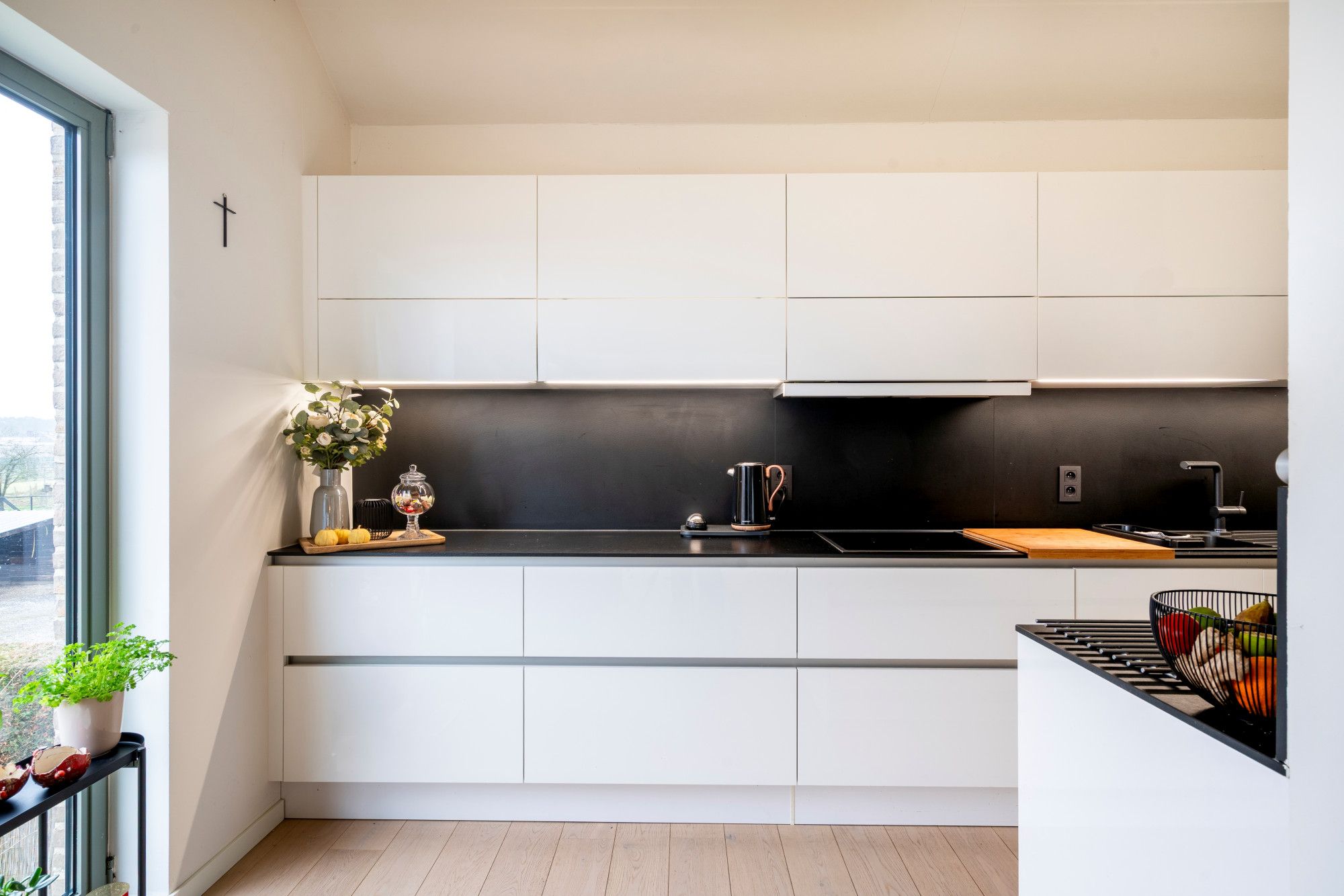 The kitchen is equipped with an induction hob, extractor hood, combi-oven, dishwasher and sink.