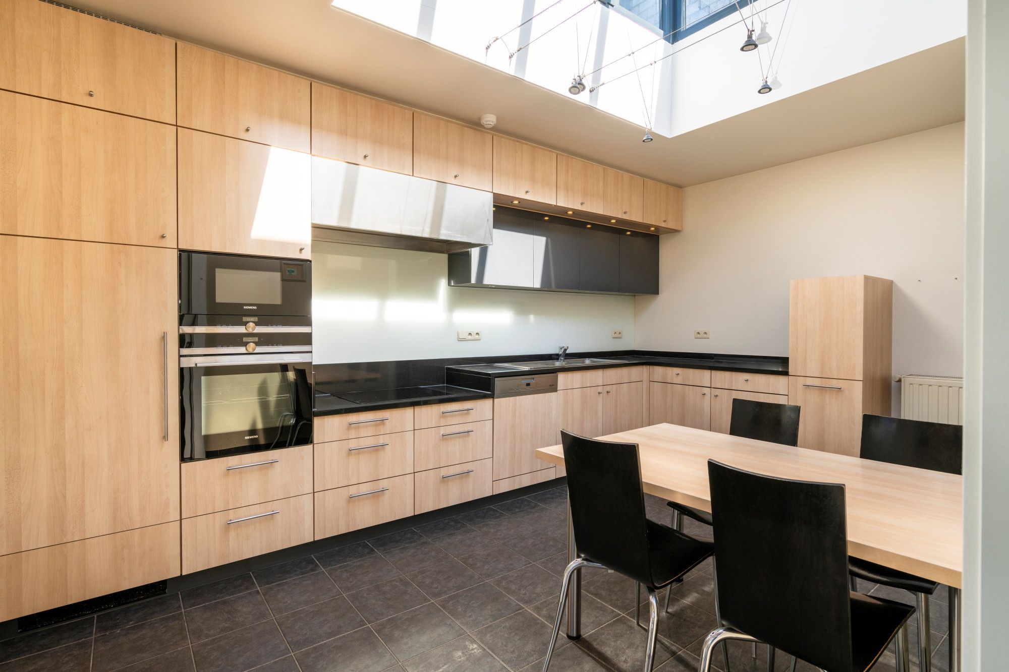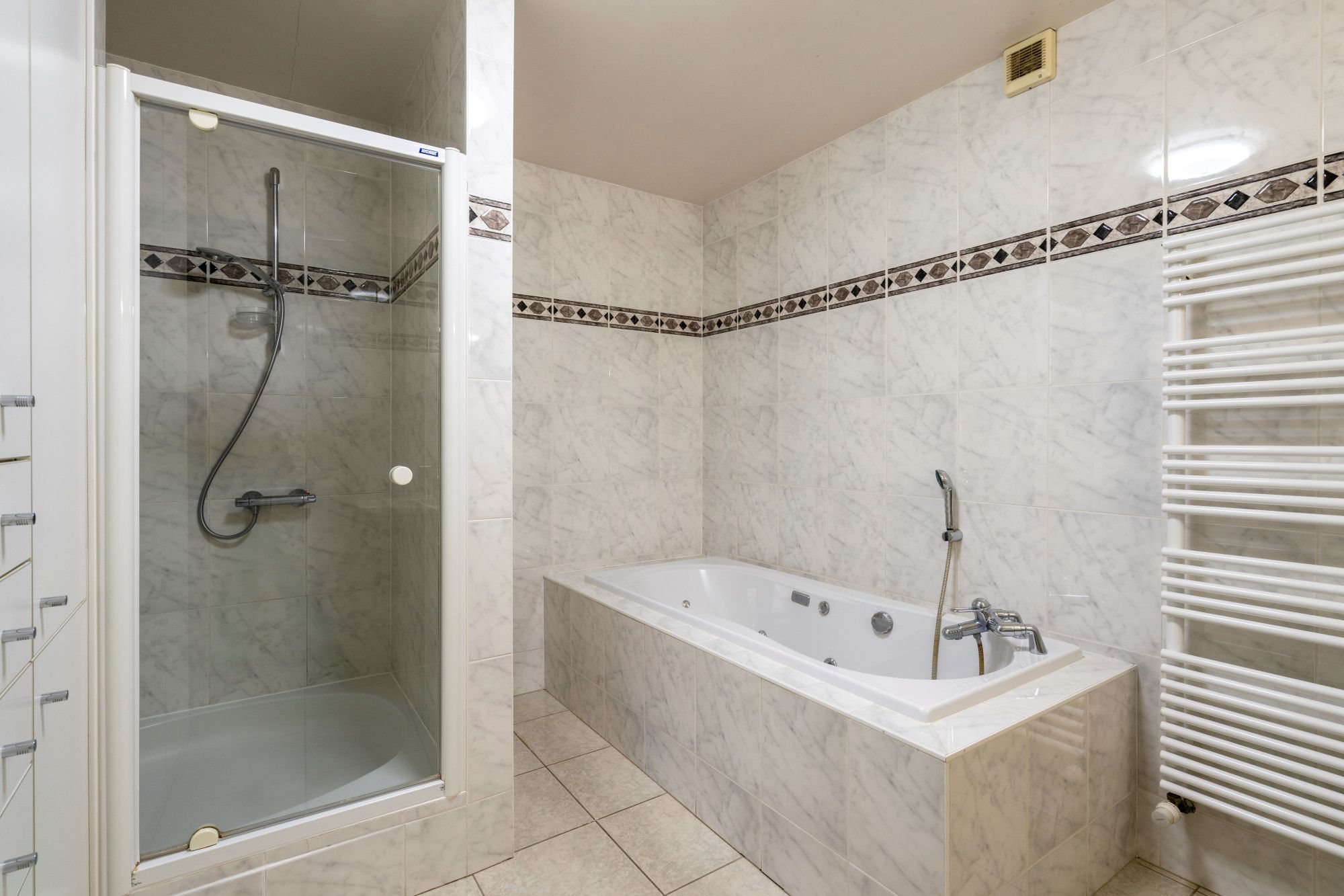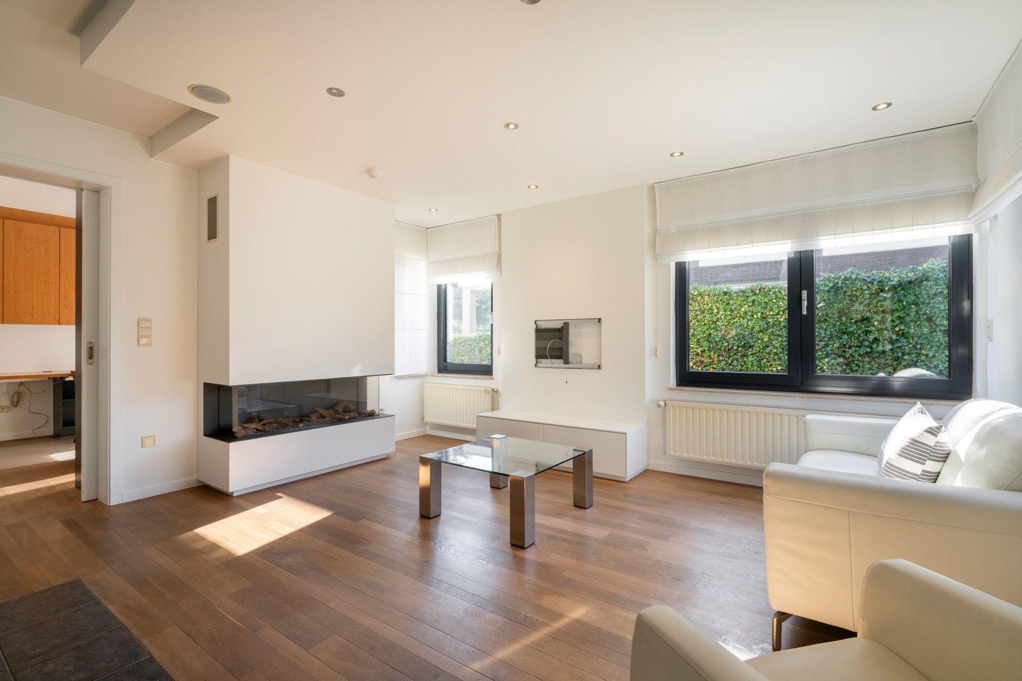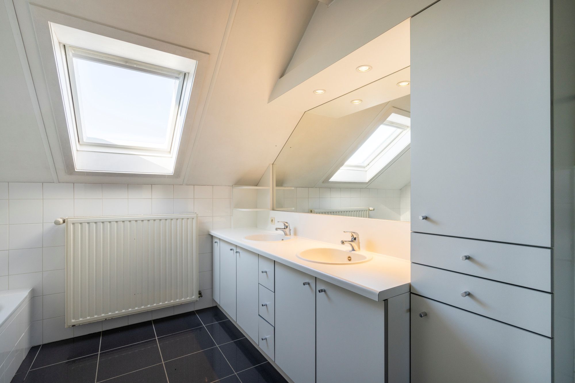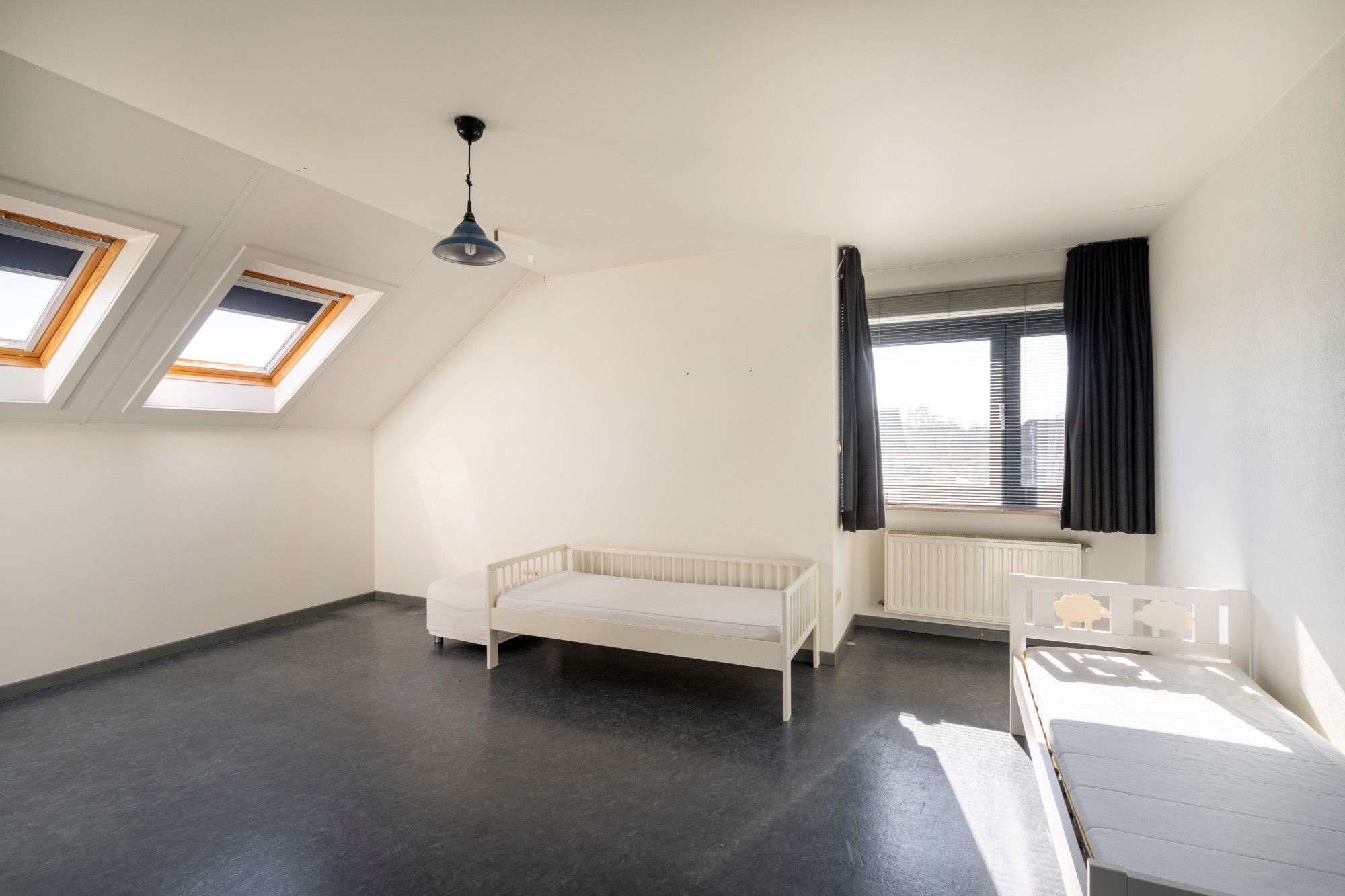 House number 80 consists of a spacious triplex apartment. The ground floor includes the garage and the entrance hall. The first floor comprises a hall, the living room, a large kitchen with an adjoining pantry, and a separate toilet. The second floor features a night hall, three bedrooms, a bathroom with bathtub, shower, and toilet, a walk-through dressing room, and a second dressing room that can be converted into a fourth bedroom if desired. An attic space, finished and suitable for additional storage, is accessible via a pull-down ladder.