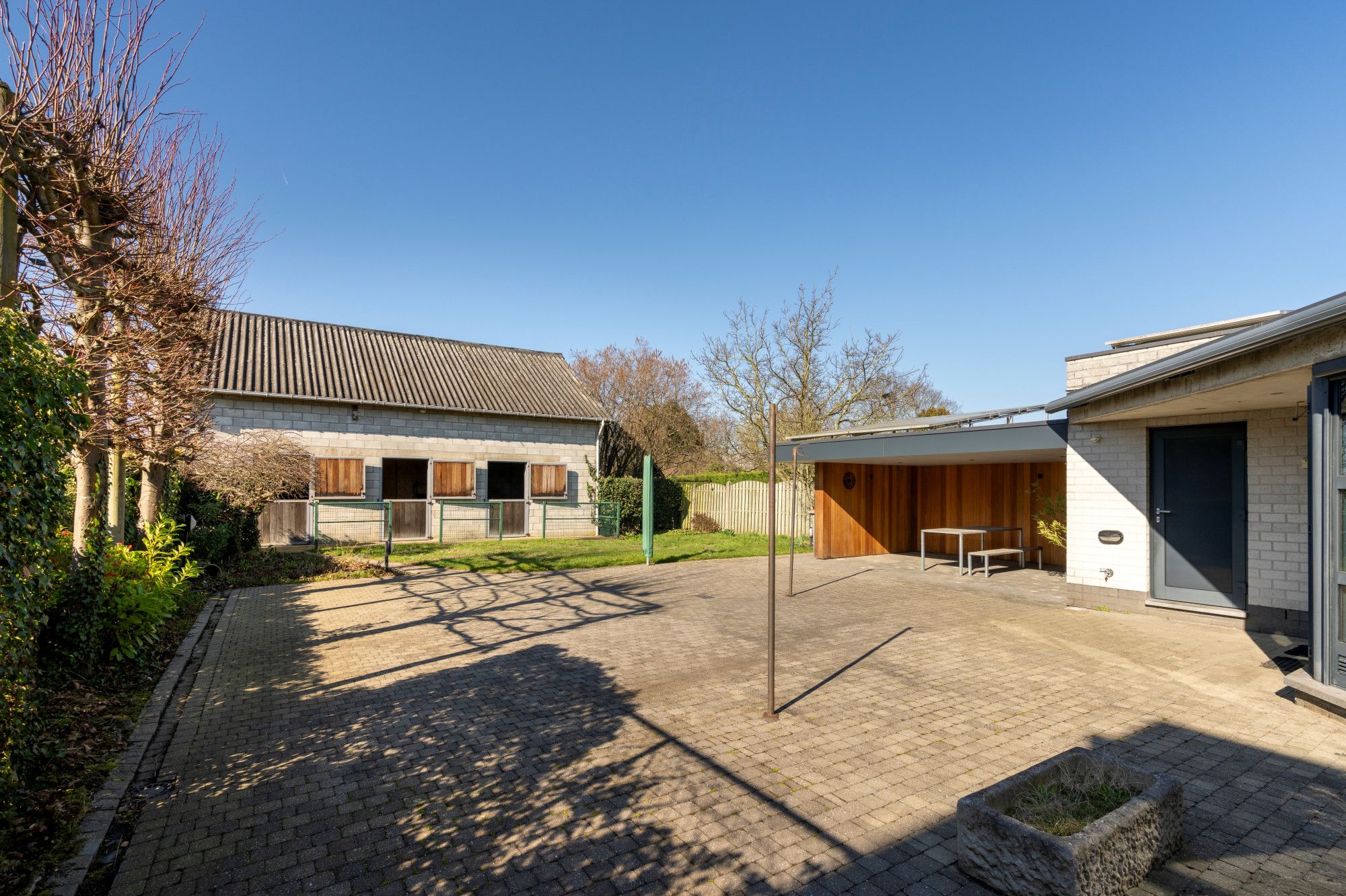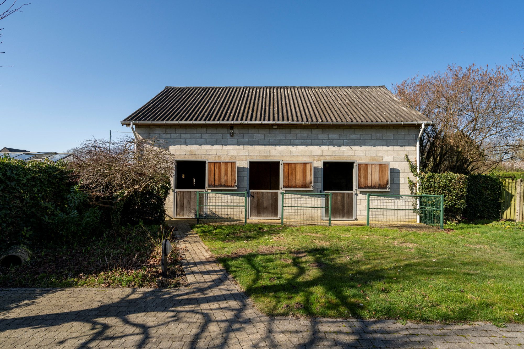 At the rear of the plot, there is also a separate outbuilding arranged as a horse stable with four horse boxes and additional storage space. This infrastructure is a clear added value for horse enthusiasts or can serve as a practical storage or workspace.