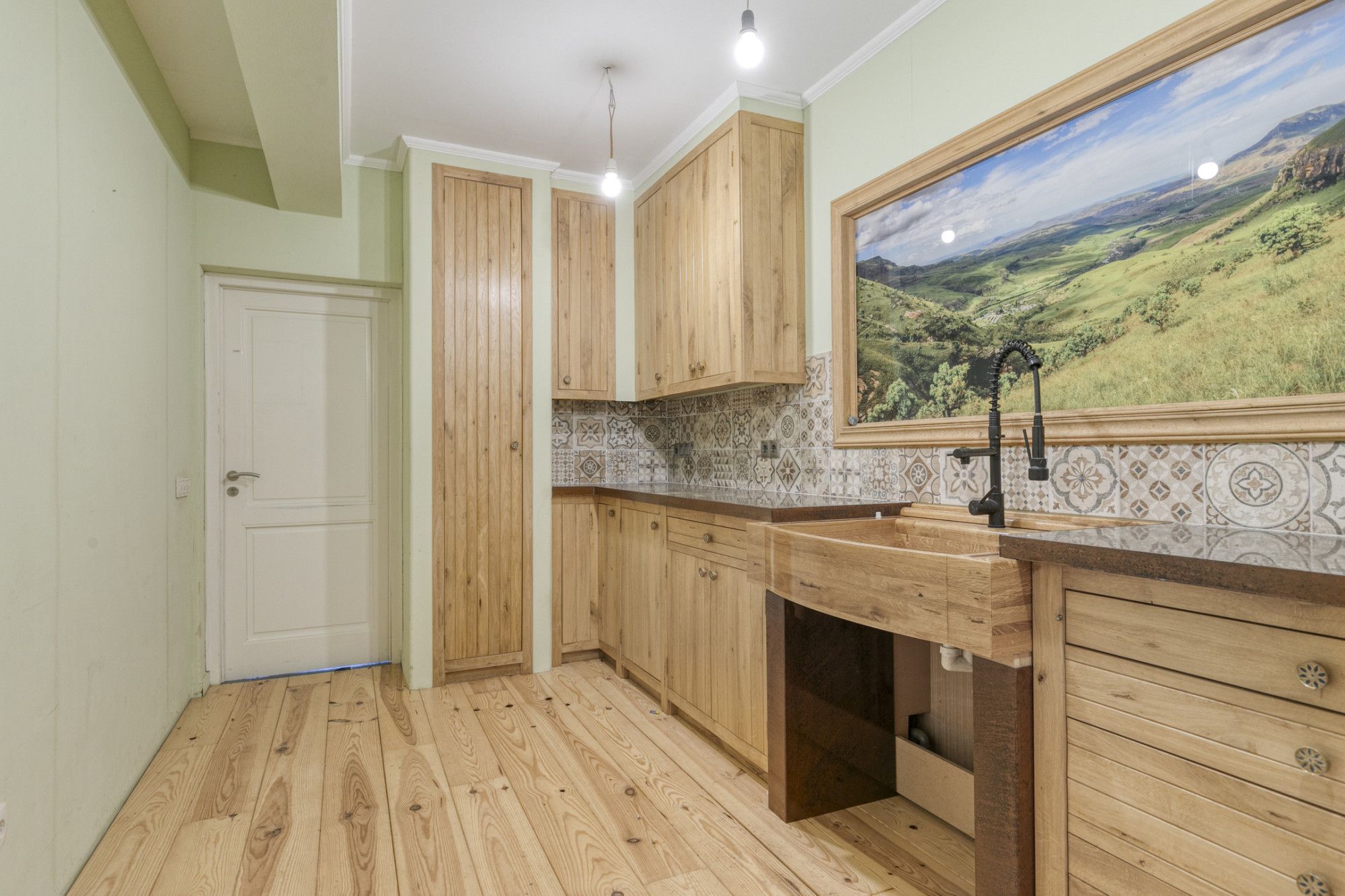Het hoofdhuis heeft een praktische indeling met een L-vormige woonkamer (ca. 43 m²), een eetkeuken (16 m²), een bijkeuken (15 m²) en vier slaapkamers van respectievelijk 19, 16, 15 en 13 m². Onder het hele huis ligt een kelder met inpandige garage. De tuin rondom biedt veel privacy en groen.