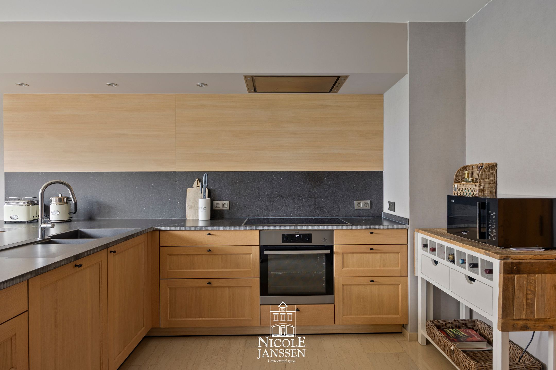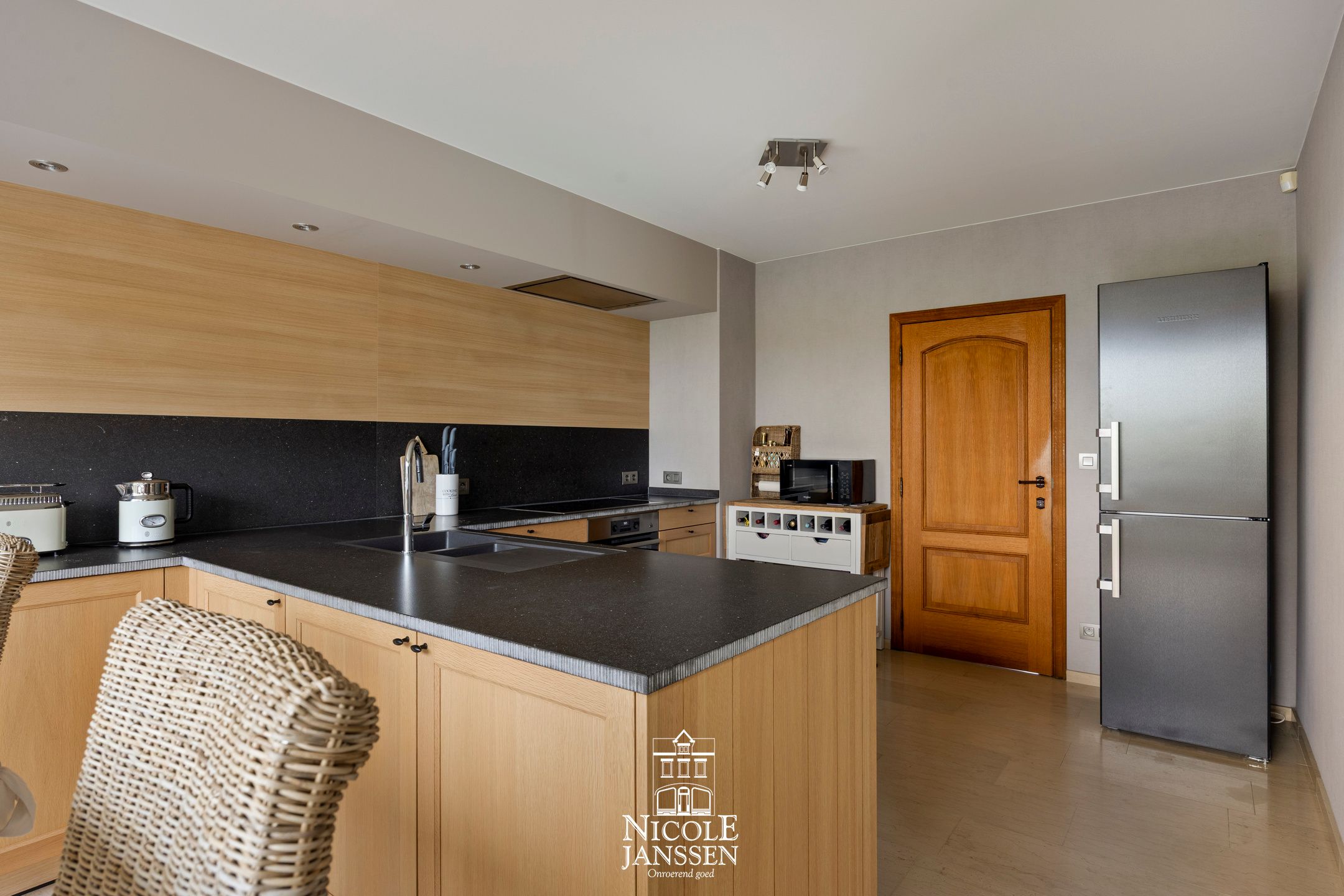 - Halfopen kwaliteitskeuken in eik met werkblad in composite en voorzien van het nodige comfort