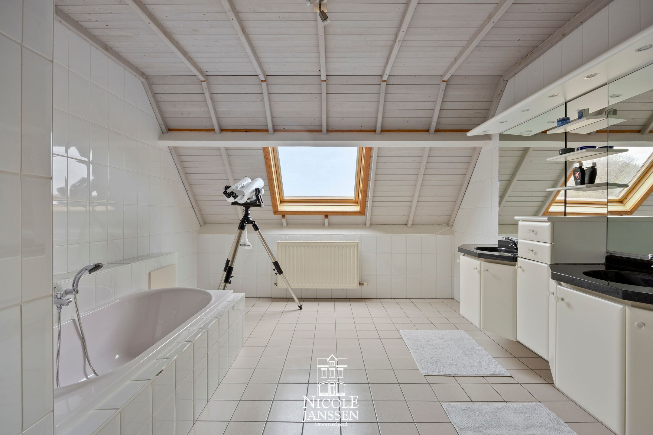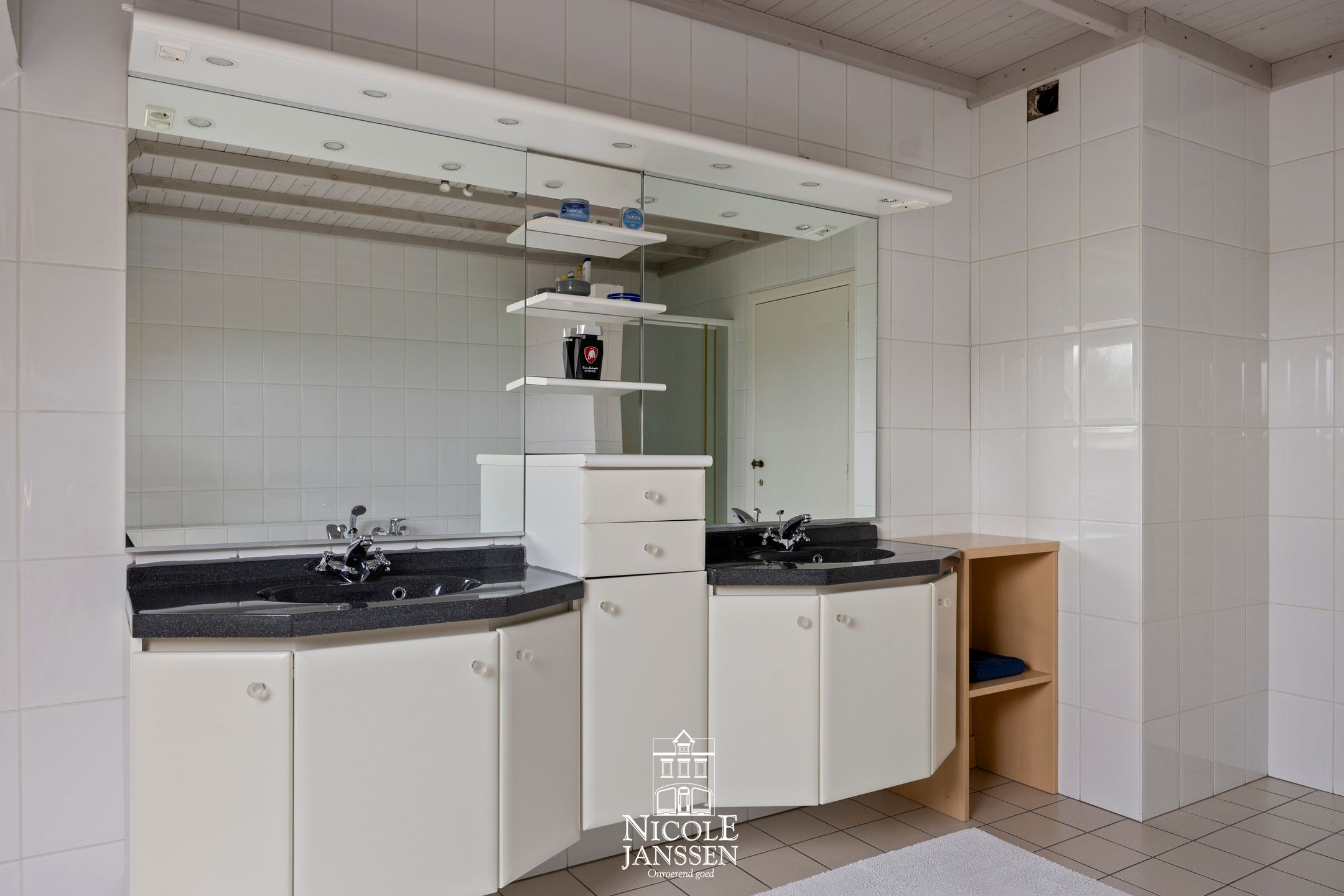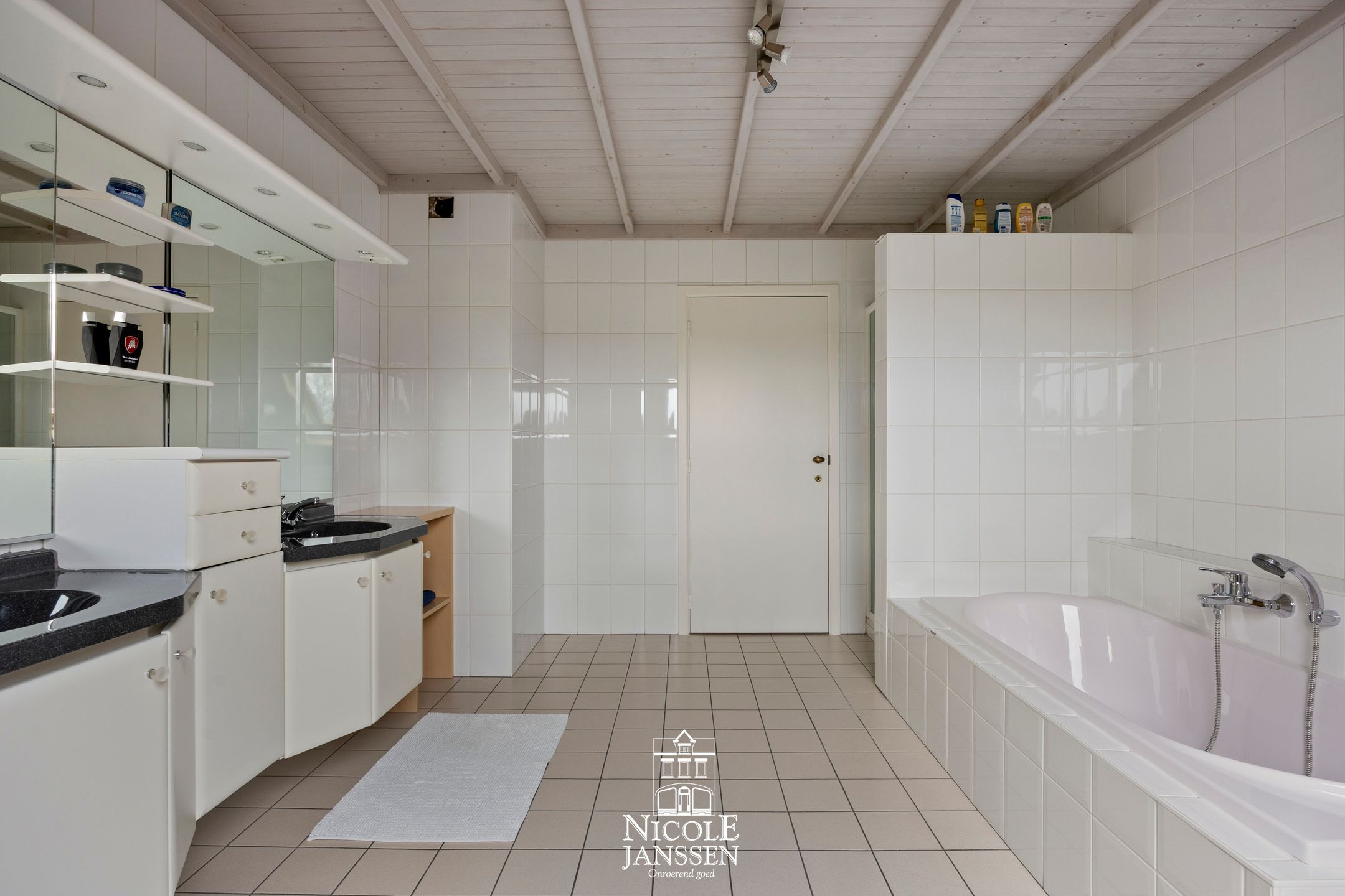 - Royale betegelde badkamer met ligbad, douche en dubbele lavabo in groot badkamermeubel