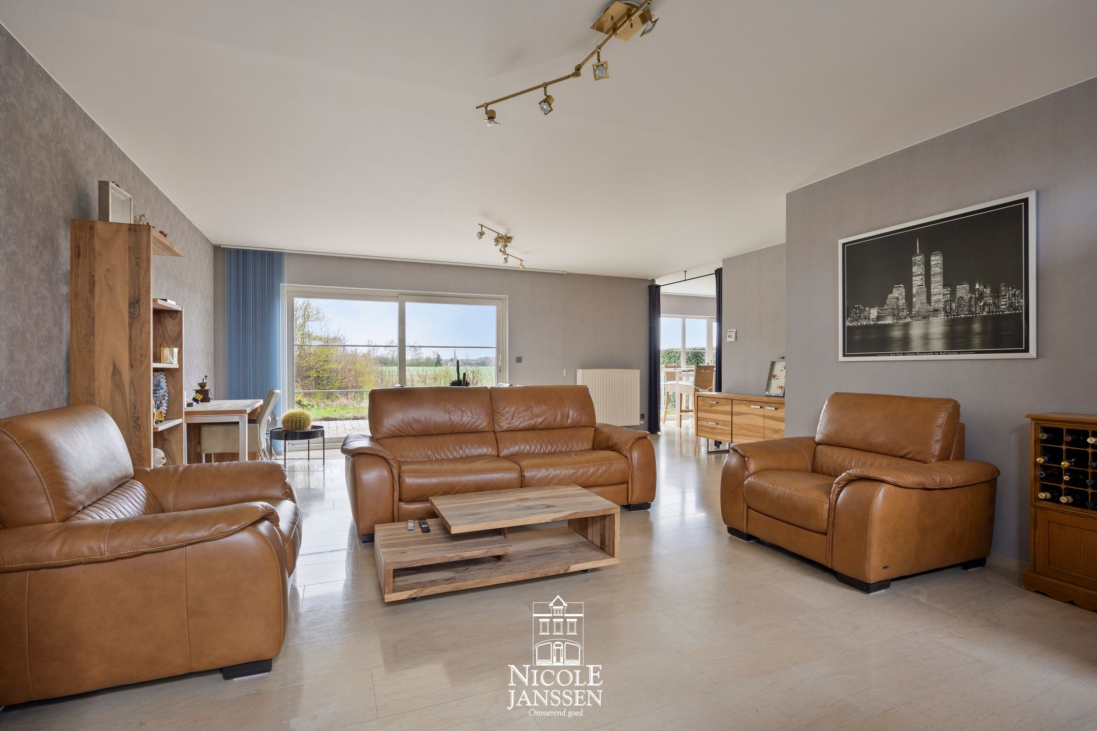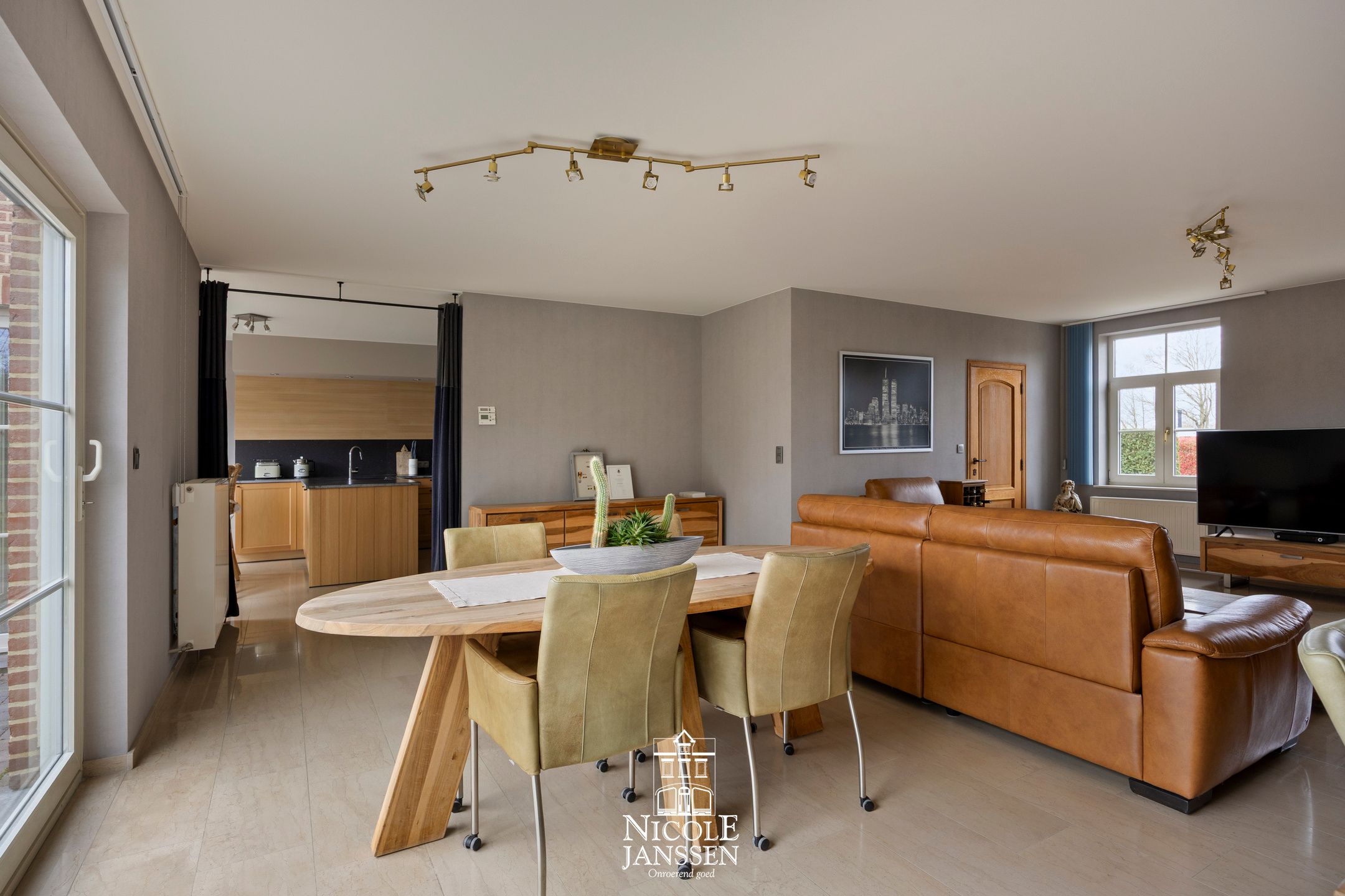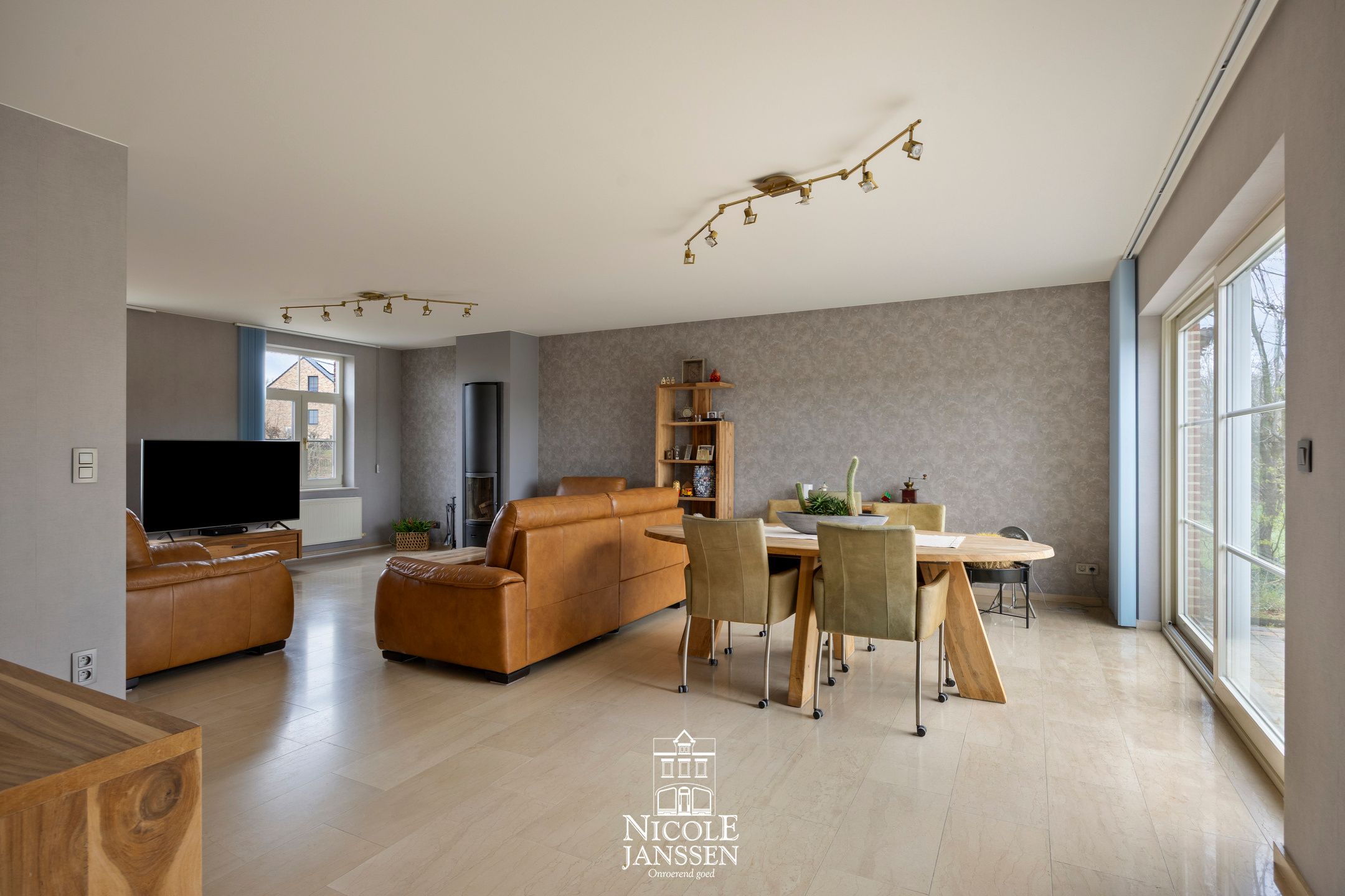 - Open en lichtrijke leefruimte met natuurstenen vloer