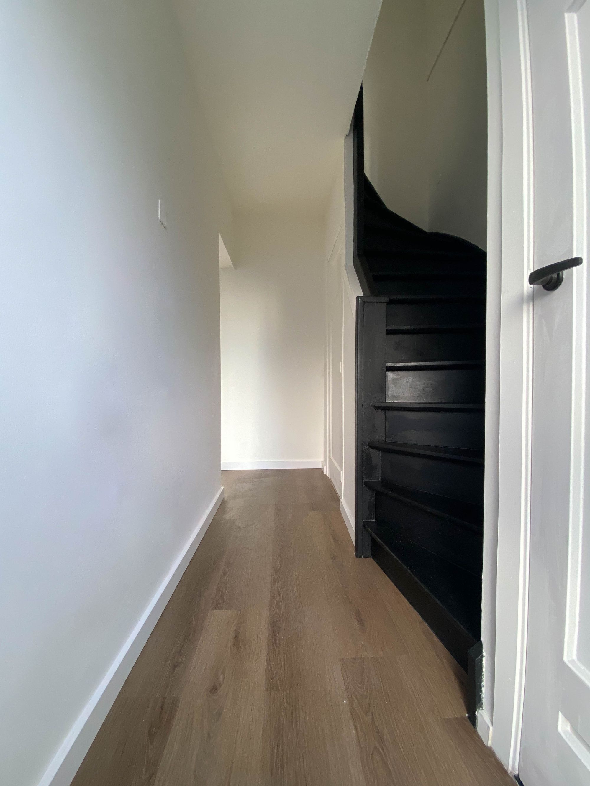 Hal met PVC Vloer en meterkast, toiletruimte en trap naar de eerste verdieping.