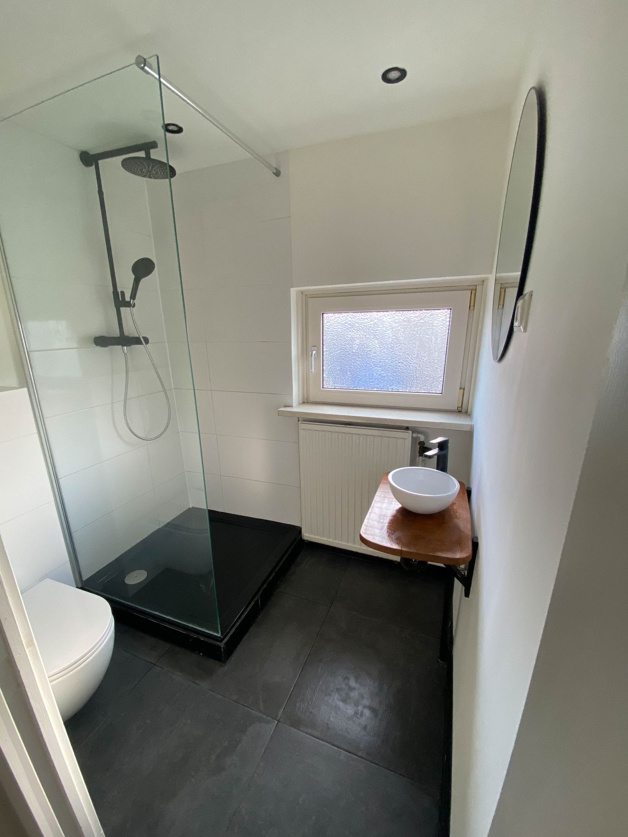 Overloop v.v. laminaatvloer welke toegang biedt tot 3 slaapkamers allen v.v. laminaatvloer en moderne badkamer met inloopdouche wastafelmeubel en zwevend toilet.