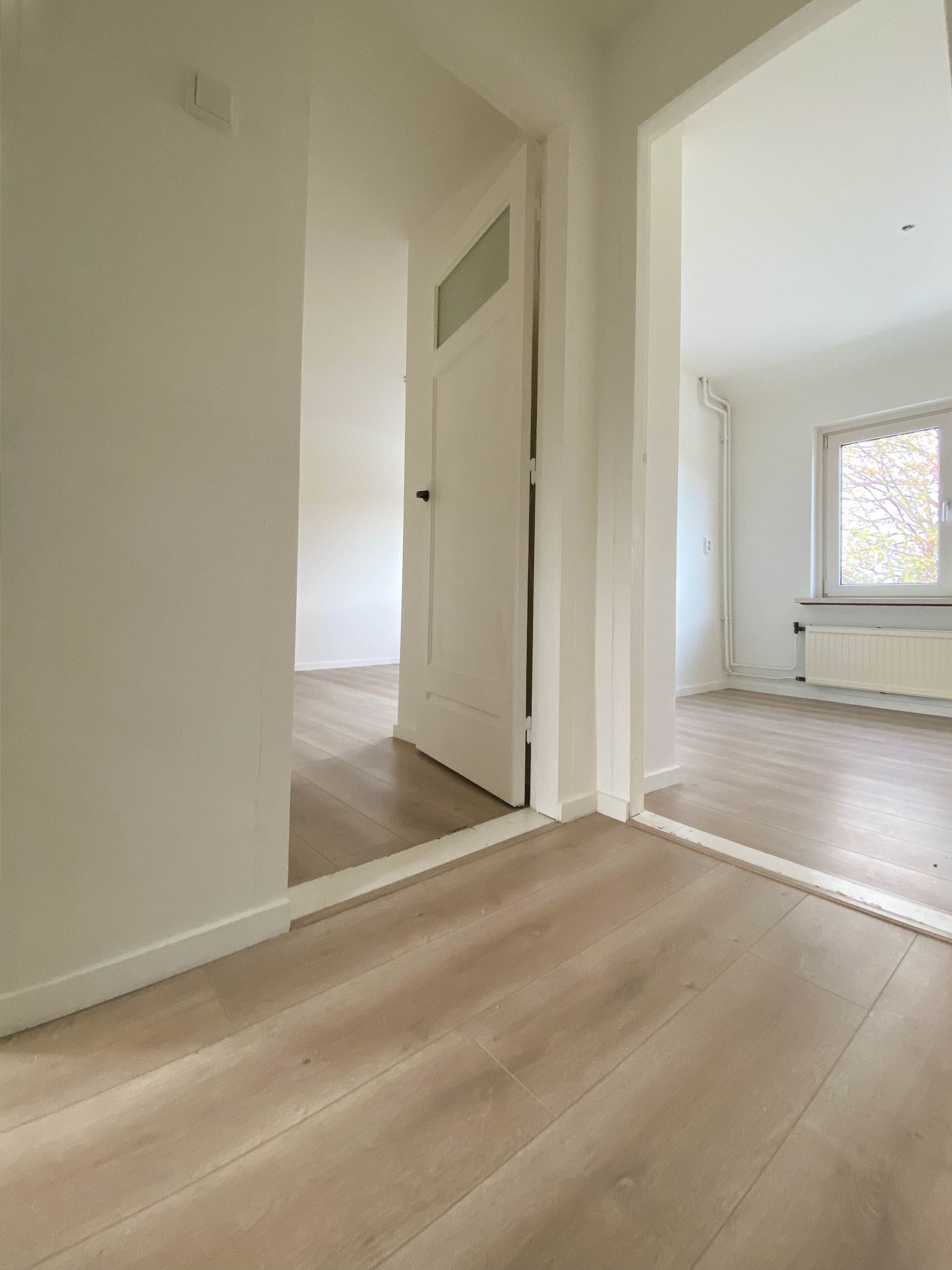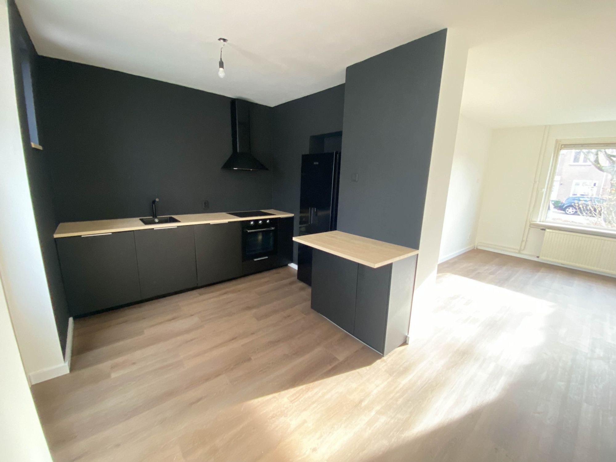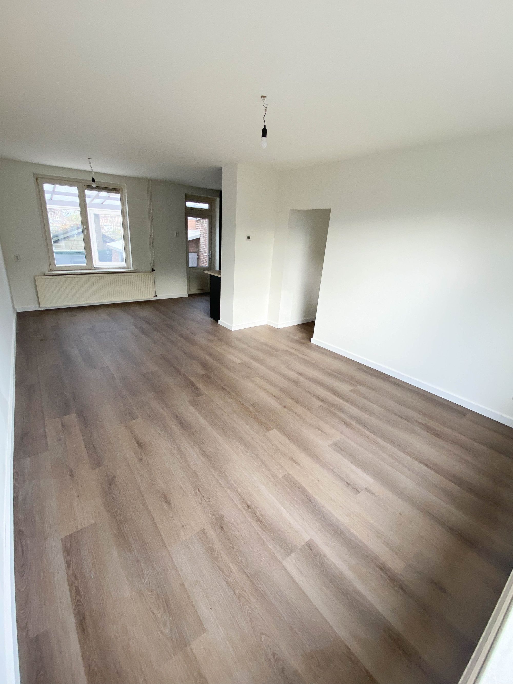Royale en lichte L vormige woonkamer geheel voorzien van een PVC-vloer.