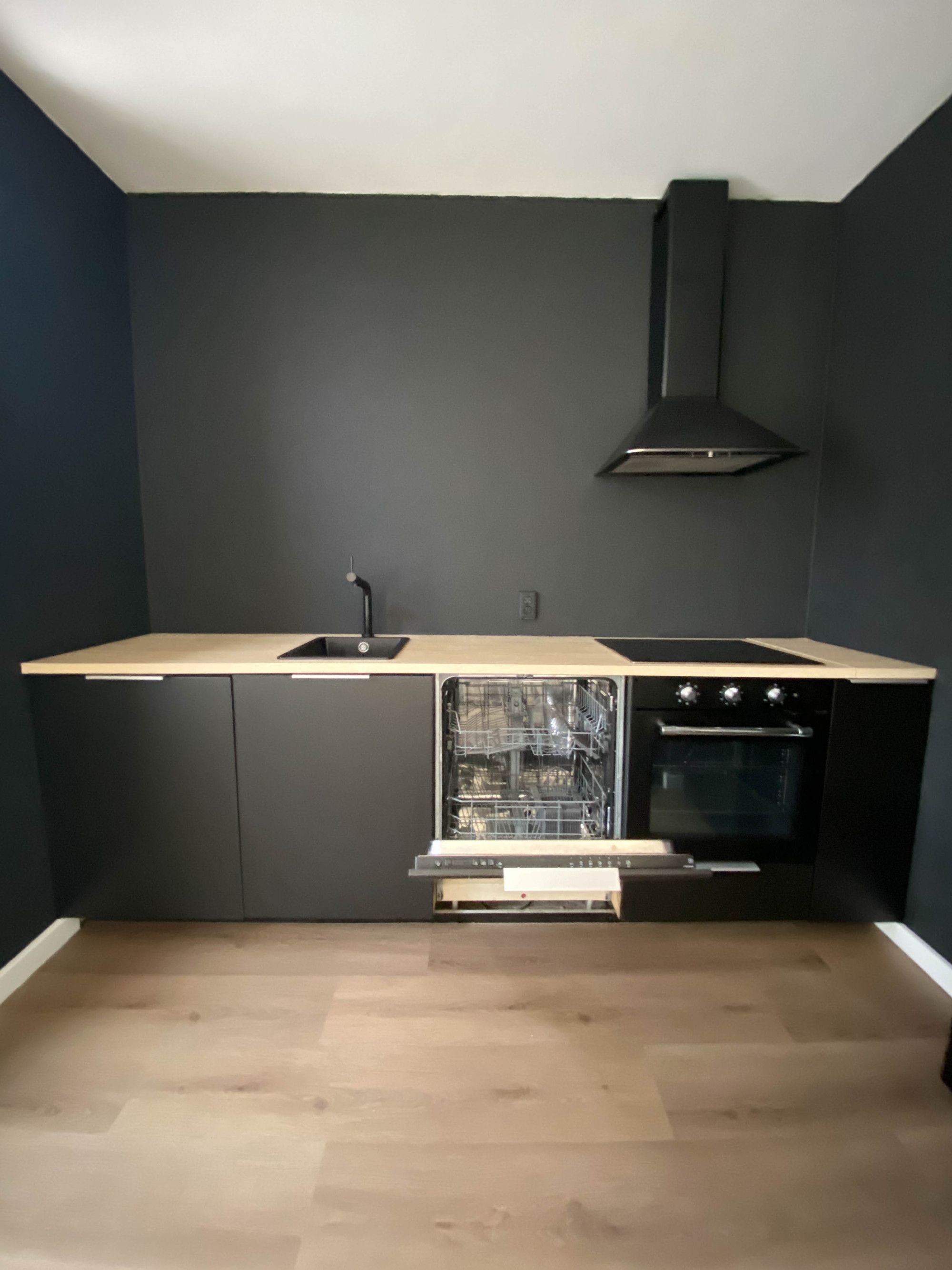 Open keuken v.v. PVC-vloer en moderne aanbouwinstallatie incl. inbouwapparatuur, te weten, hete lucht oven, wasemkap, vaatwasser en koelkast.