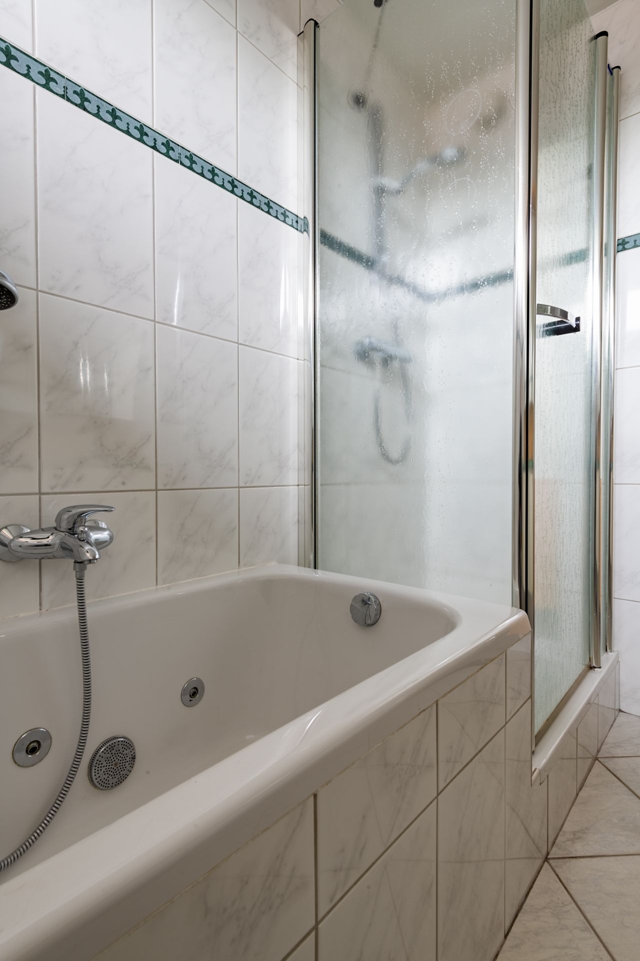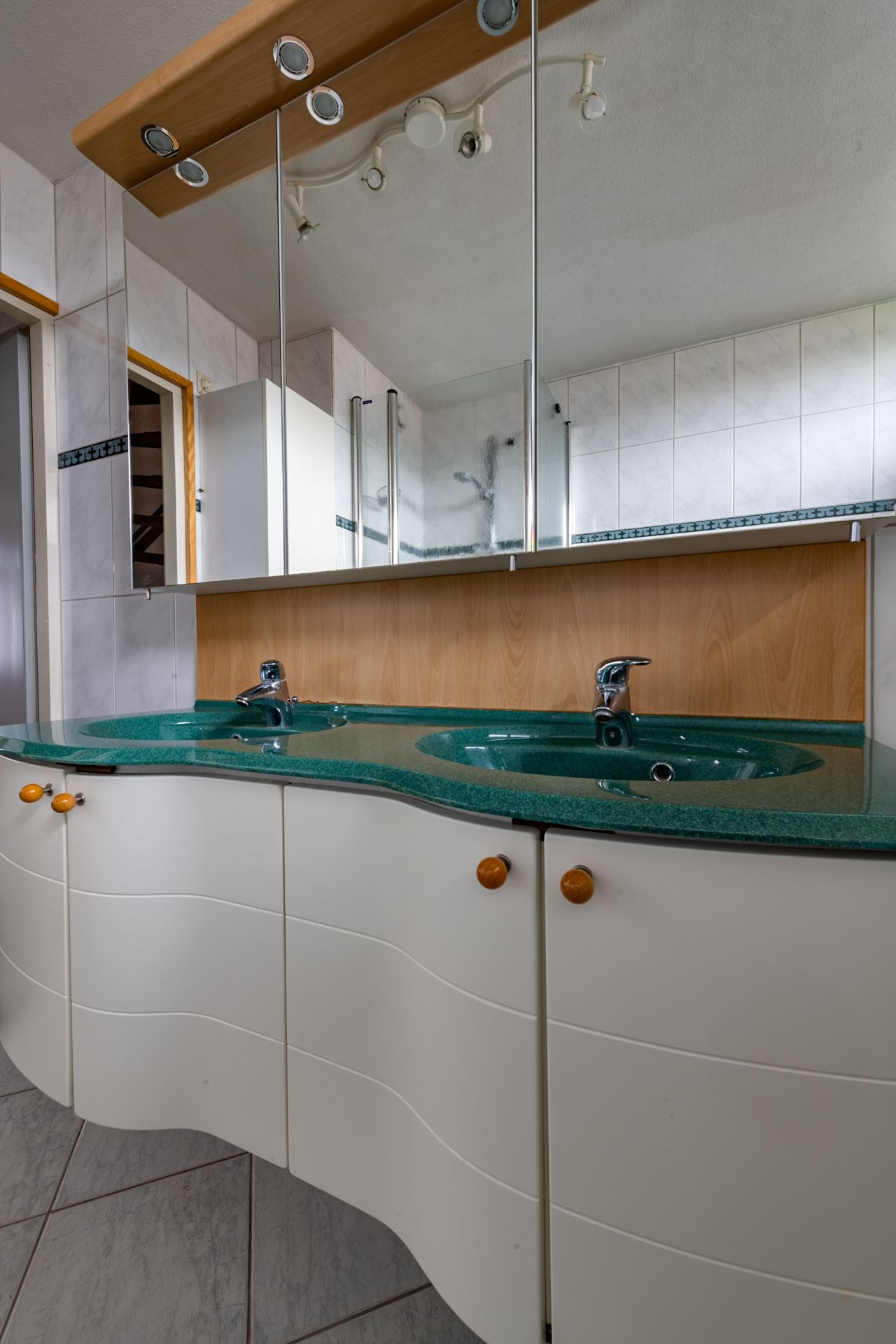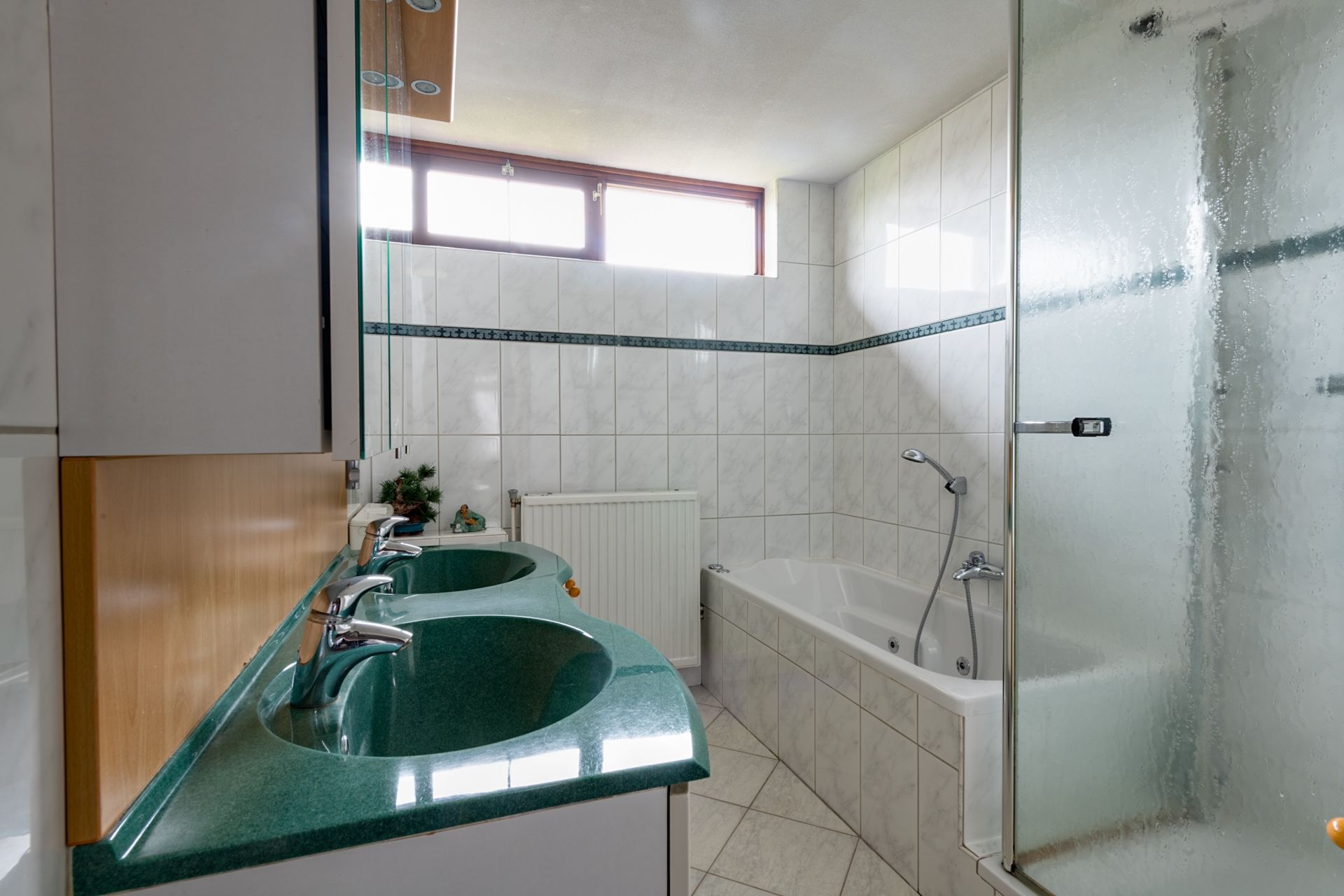 Overloop met toegang naar de 3 slaapkamers en badkamer. De kamers aan de voorzijde van deze woning meten 265 x 220cm en 490 x 374cm. Vanaf hier is ook toegang tot het balkon. Aan de achterzijde bevinden zich de 1 na grootste slaapkamer (404 x 371cm) en de badkamer (296 x 216 cm). De aparte douche met glazen wand en deur en het ligbad met whirlpool zijn daarnaast zeer goed onderhouden. Zowel op de vloer als tegen de wand is getegeld.