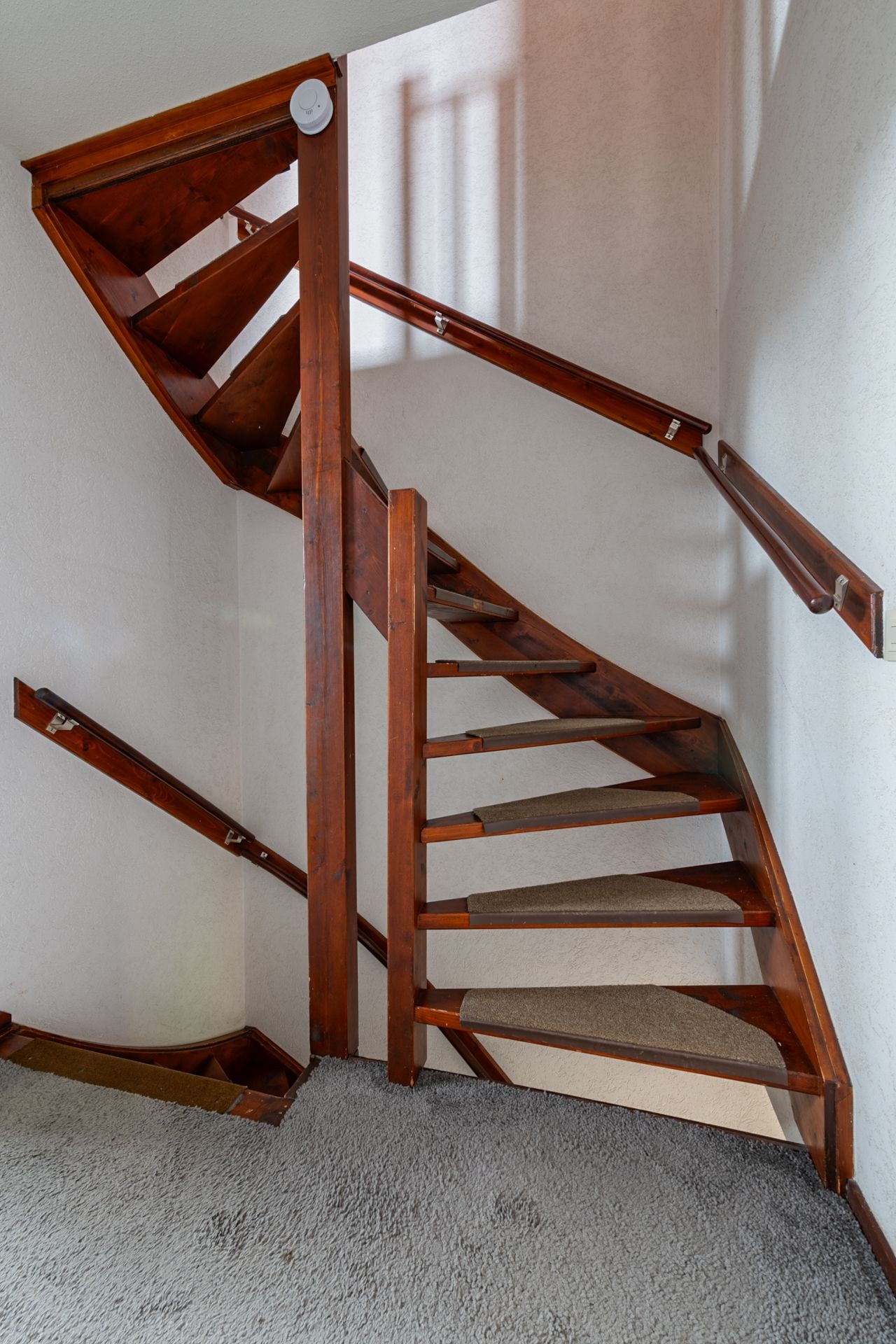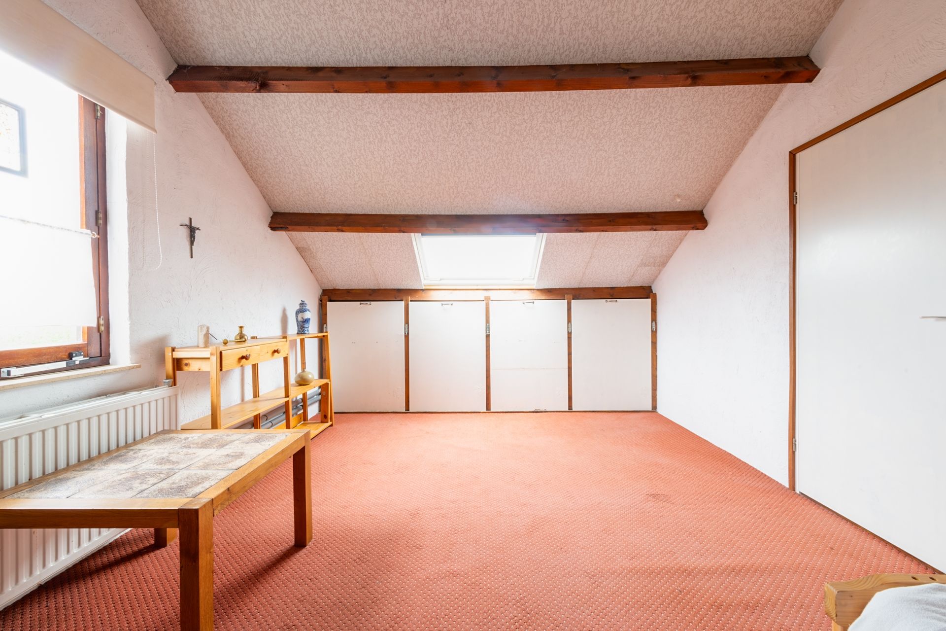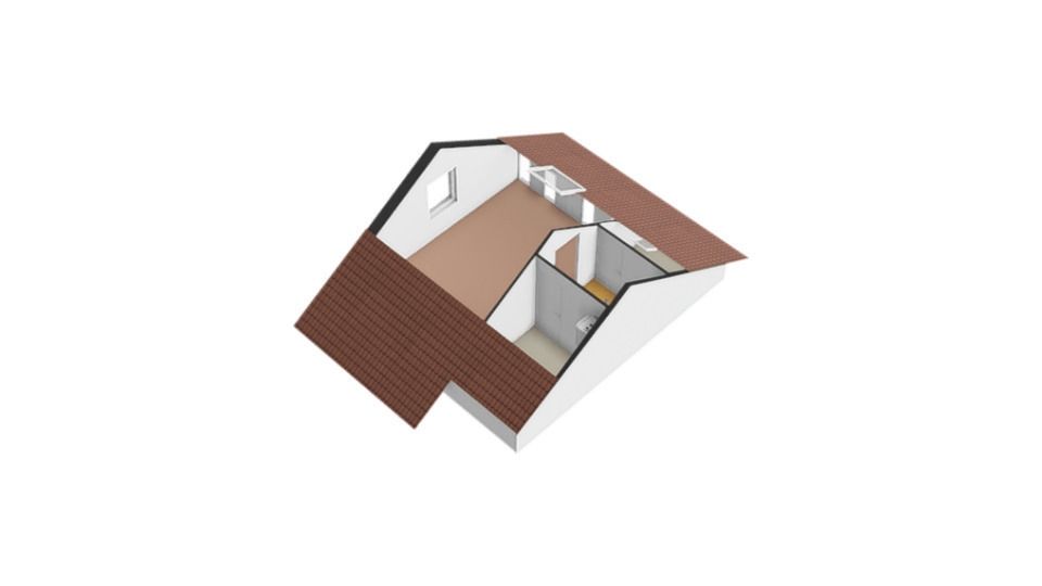 Met de vaste trap komen we op de zolderruimte (535 x 374 cm) . Onder de schuine kap bevinden zich nog 2 extra opbergruimtes (CV ruimte en wasruimte)