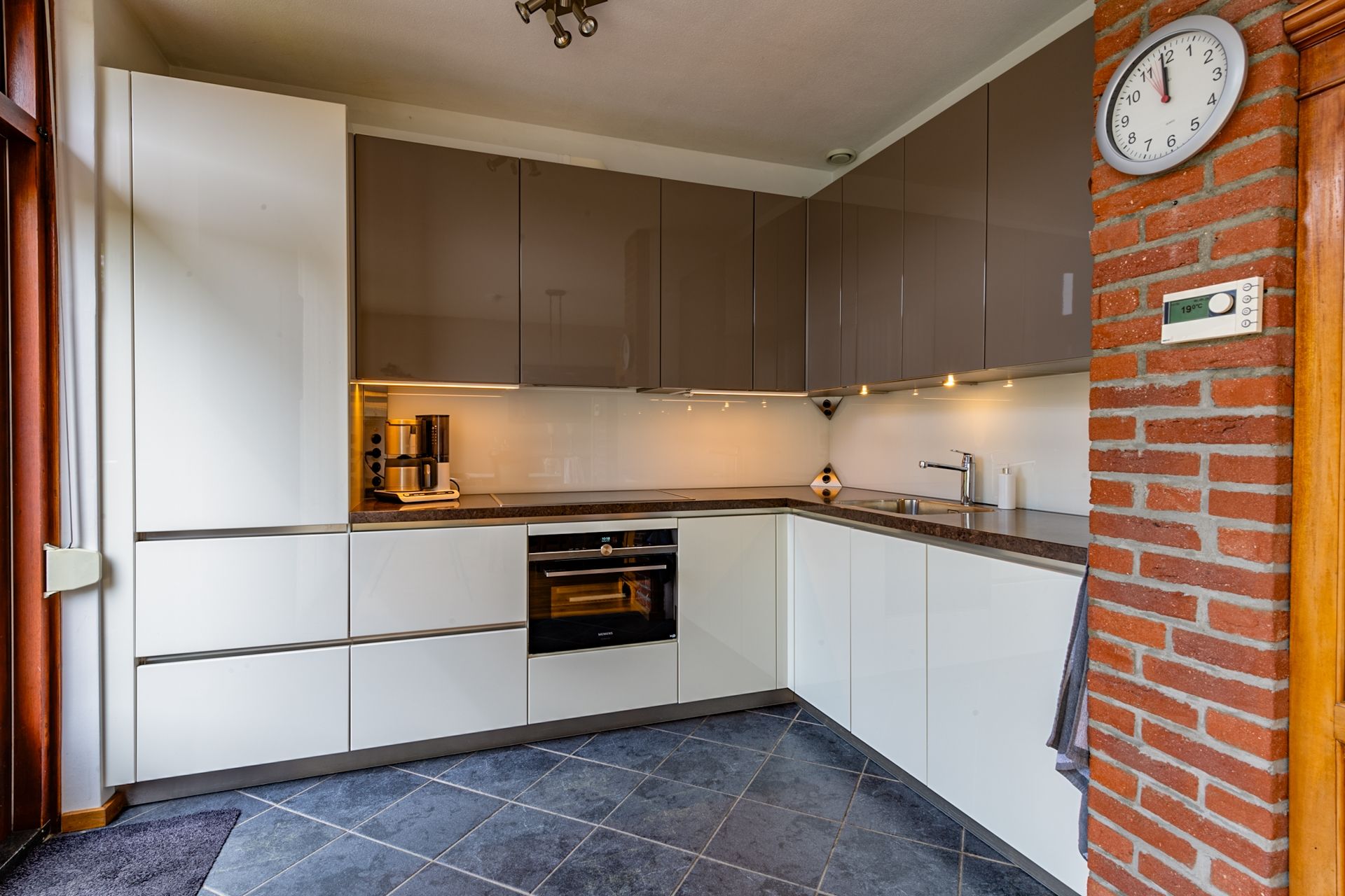 Op de vloer ligt een tegelvloer en de achterwand op het werkblad is van glas. Niet alleen fraai, maar ook zeer onderhoudsvrij.