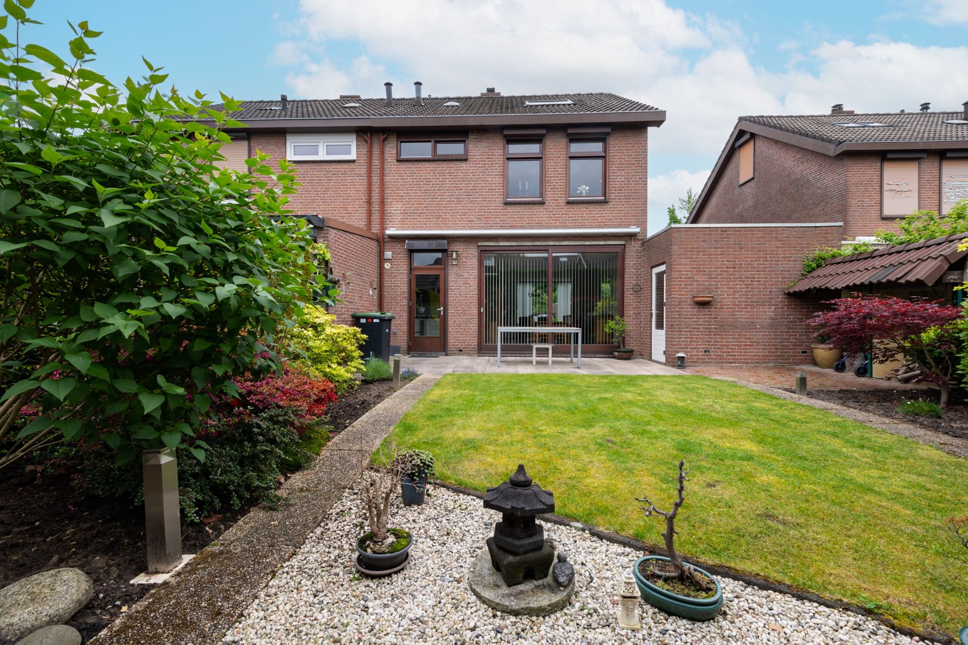 De zonnige achtertuin op het zuiden is mooi aangelegd. Wat overigens ook geldt voor de voortuin.