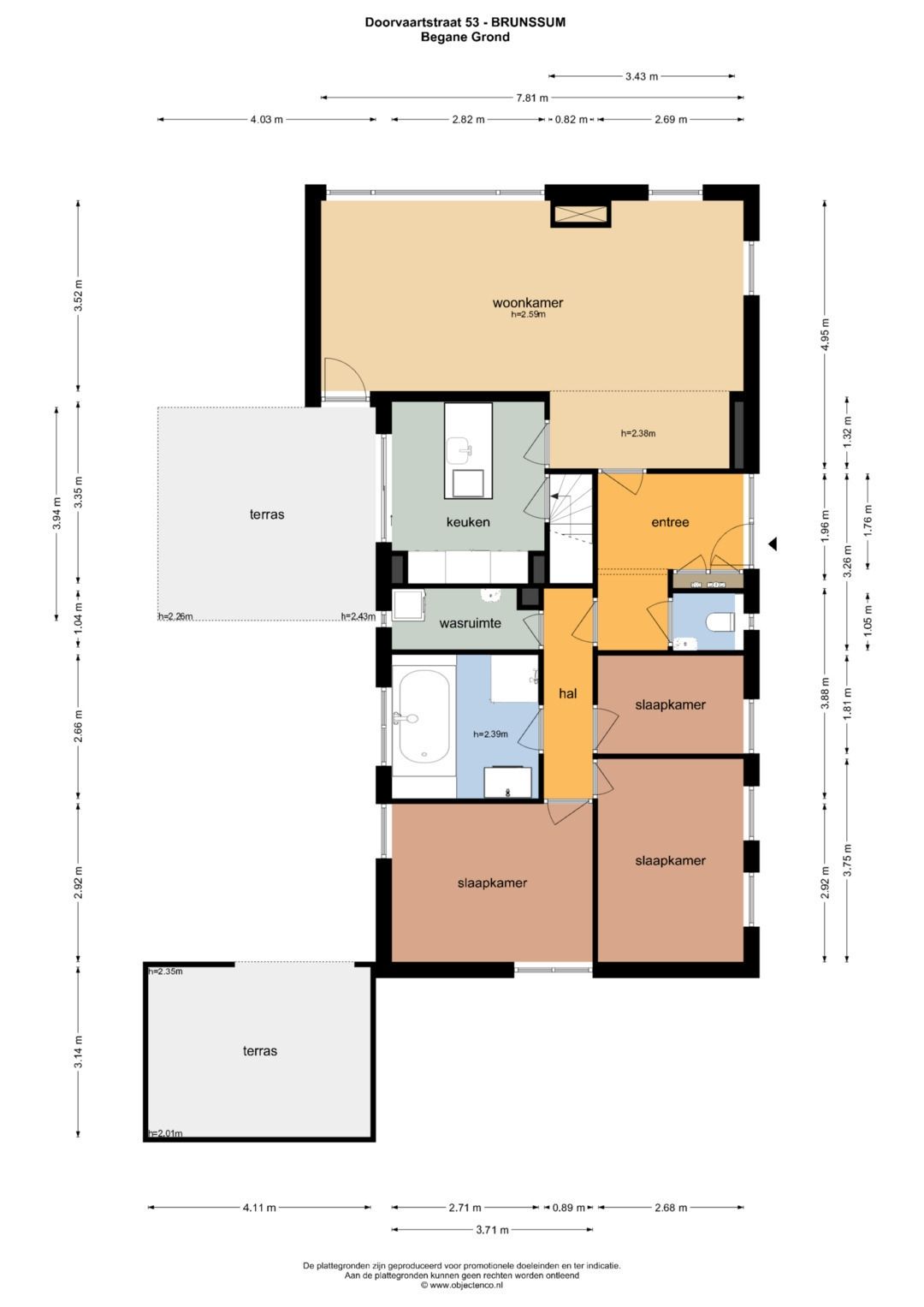 In de hal naar de achterzijde van het huis vinden we aan beide zijden de resterende vertrekken. Er zijn 3 slaapkamers (375 x 268cm/371 x 292cm/181 x 268cm), een wasruimte voor wasmachine en droger en badkamer (271 x 266cm).