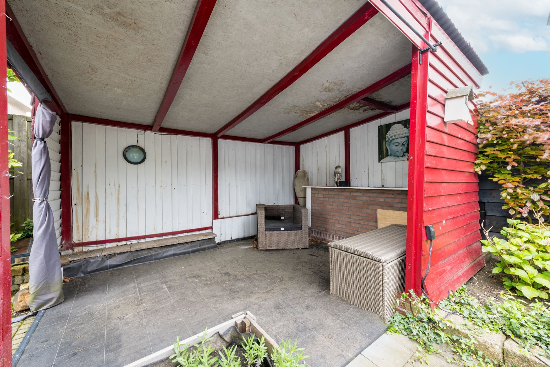 Door de schuifpui komen we op het overdekt terras en tuin.