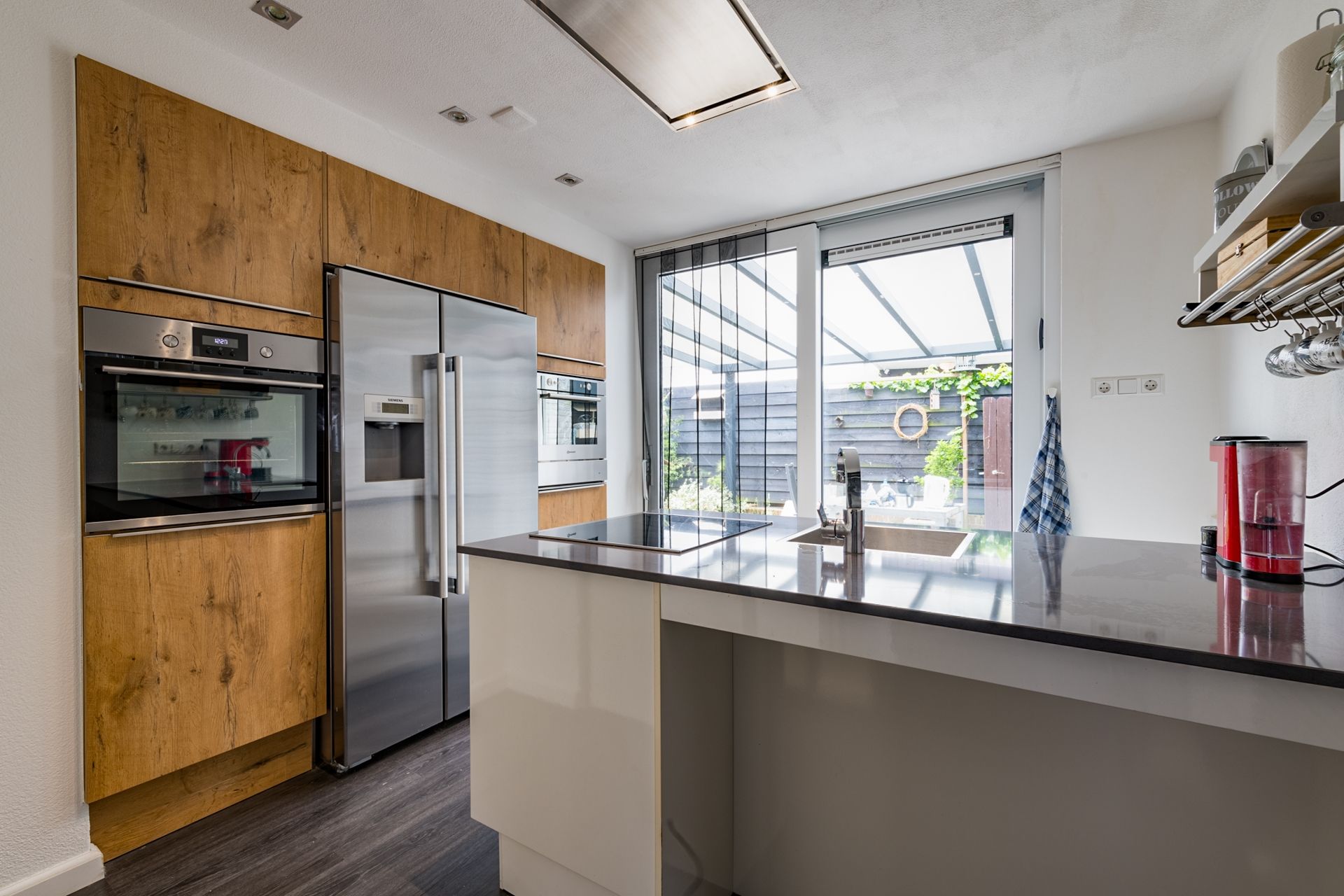 Ontvangsthal met garderobe, toilet (hangend toilet met wasbakje), toegang tot de woonkamer (781 x 495cm). De lichte woonkamer is voorzien van een kwalitatief hoogwaardig laminaat. De wanden zijn strak gestuct. Vanuit de hal is de ook de keuken (282 x335cm) bereikbaar. De keuken is voorzien van een eiland met vaatwasser, inductiekookplaat, afzuigkap en spoelbak met kraan. Het composiet werkblad geeft het eiland een mooi luxe uitstraling. De kastenwand in contrasterende houtkleur is voorzien van een oven, combi-magnetron, warmhoudlade voor borden en dubbeldeurskoelautomaat met vriezer en ijsblokjesmachine. Niet alleen een lust voor het oog, maar ook erg praktisch en ruim.
