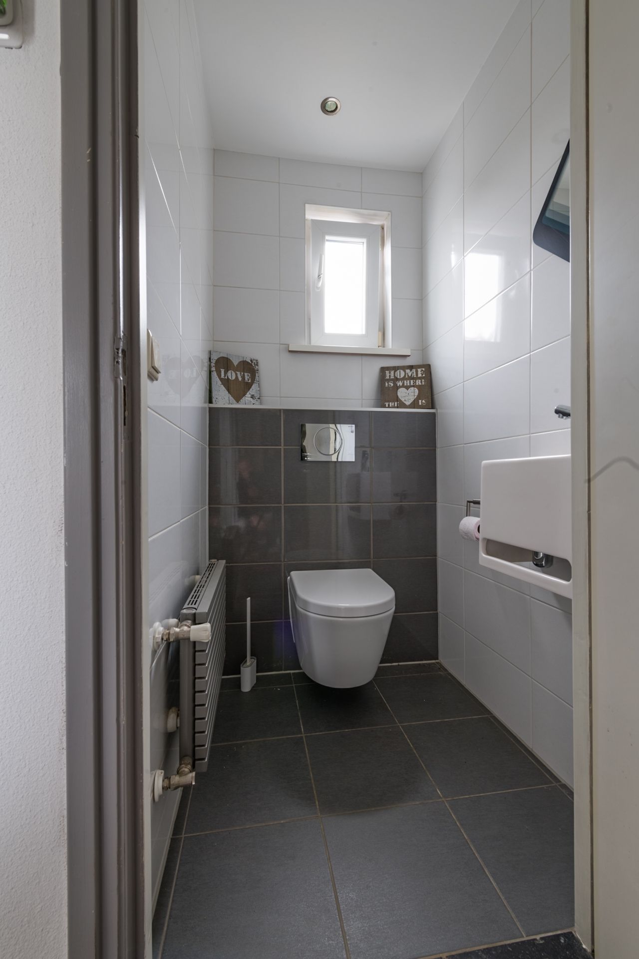Op de vloer ligt hetzelfde laminaat als in de woonkamer en de wanden zijn ook hier strak gestuct.
