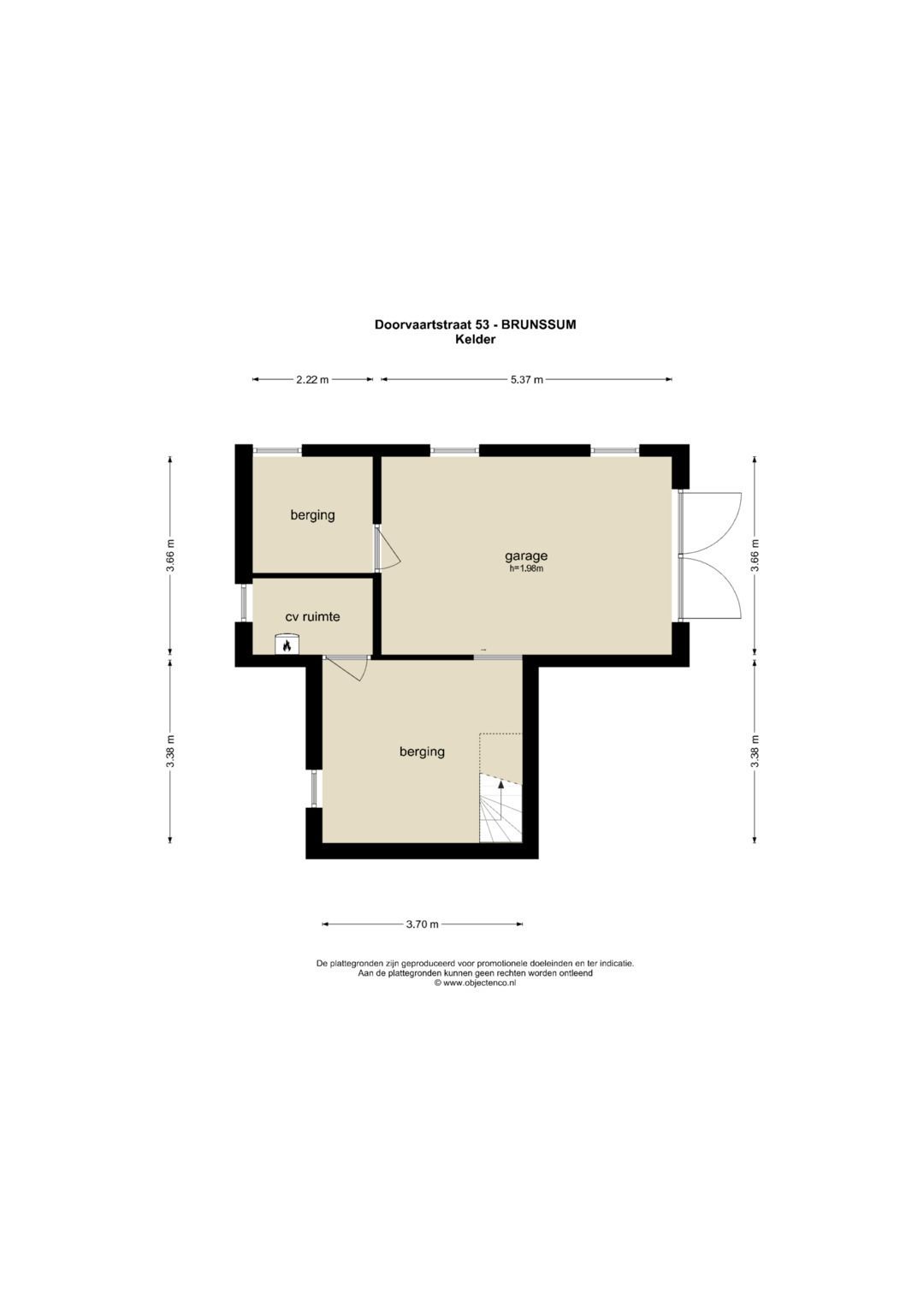 Met een vaste trap komen we op in de kelderruimte. Hier bevinden zich de garage (537 x 366cm) welke via de oprit aan de voorzijde bereikbaar is met de auto of fiets. Er is plaats voor 1 auto. Verder bevinden zich in de kelder 2 ruime bergingen. 1x 370 x 338cm en 1x 222 x 366cm welke is opgedeeld met de CV-ruimte. Allen prachtige ruimtes waarvoor diverse bestemmingen zijn te bedenken.