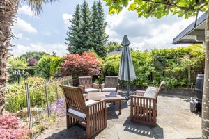 Fraai aangelegde en goed onderhouden achtertuin met diverse terrassen, elektrisch bedienbare zonneschermen, een naastgelegen buitenzwembad en jacuzzi. Vijverpartij en borders voorzien van aanplanting en groen, vrijstaand houten tuinhuis.
