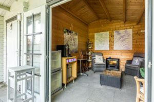 Royale woonkamer voorzien van plavuizenvloer. Aan de voorzijde gelegen zithoek met multimediale aansluitingen. Centraal gesitueerde sfeervolle schouwpartij met allesbrander. Achtergelegen eetkamer met schuifpui voor direct tuincontact met het terras. Doorgang naar de keuken.