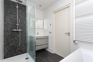 De strakke en moderne badkamer met elektrische vloerverwarming, treft men aan de linker voorzijde en is voorzien van een inloopdouche / ligbad / wastafel in een badkamermeubel en mechanische ventilatie.